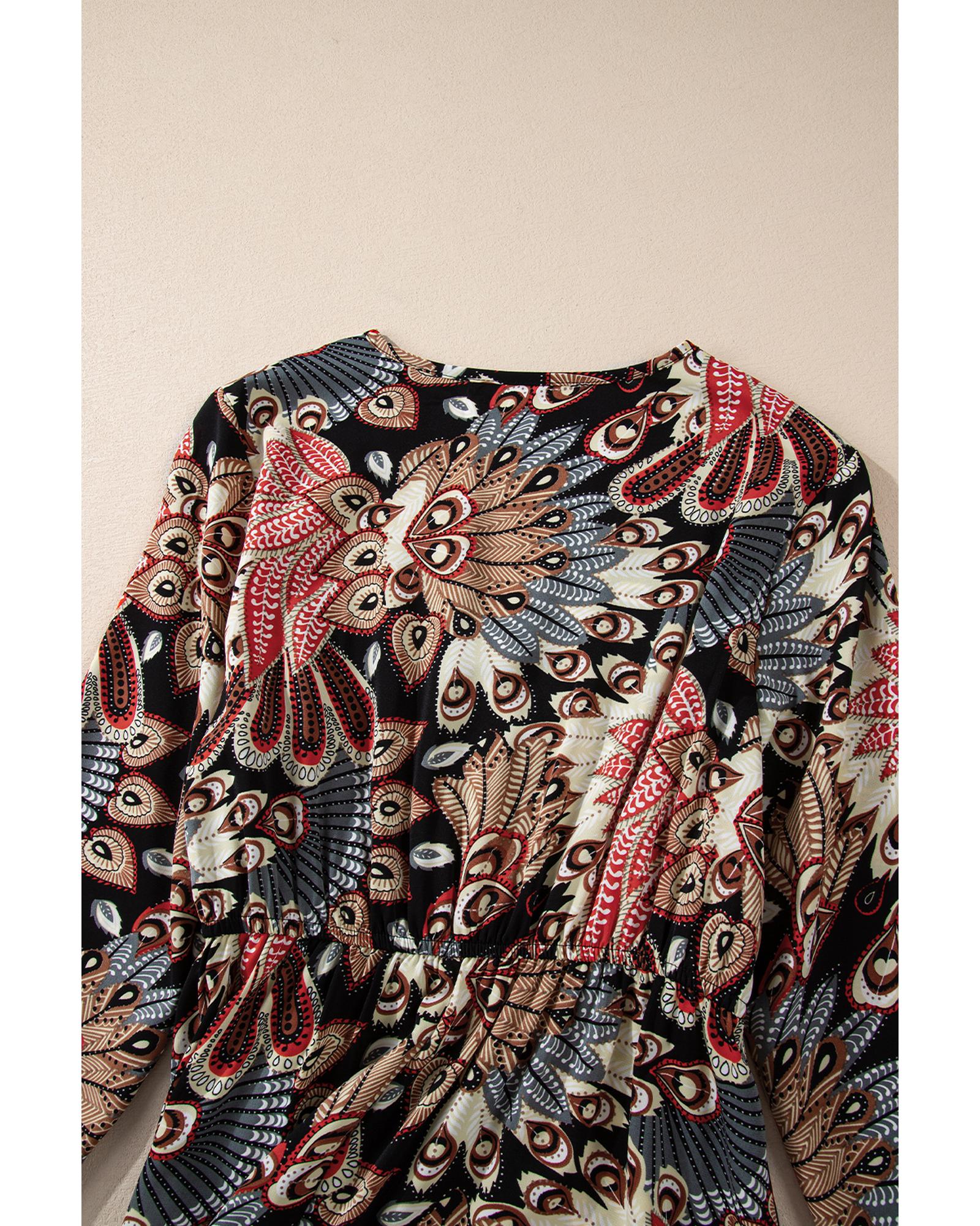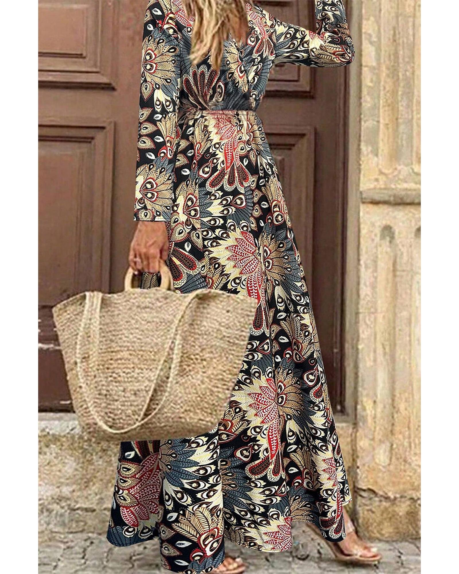 Black Floral Print V Neck Wrap High Waist Maxi Dress – S