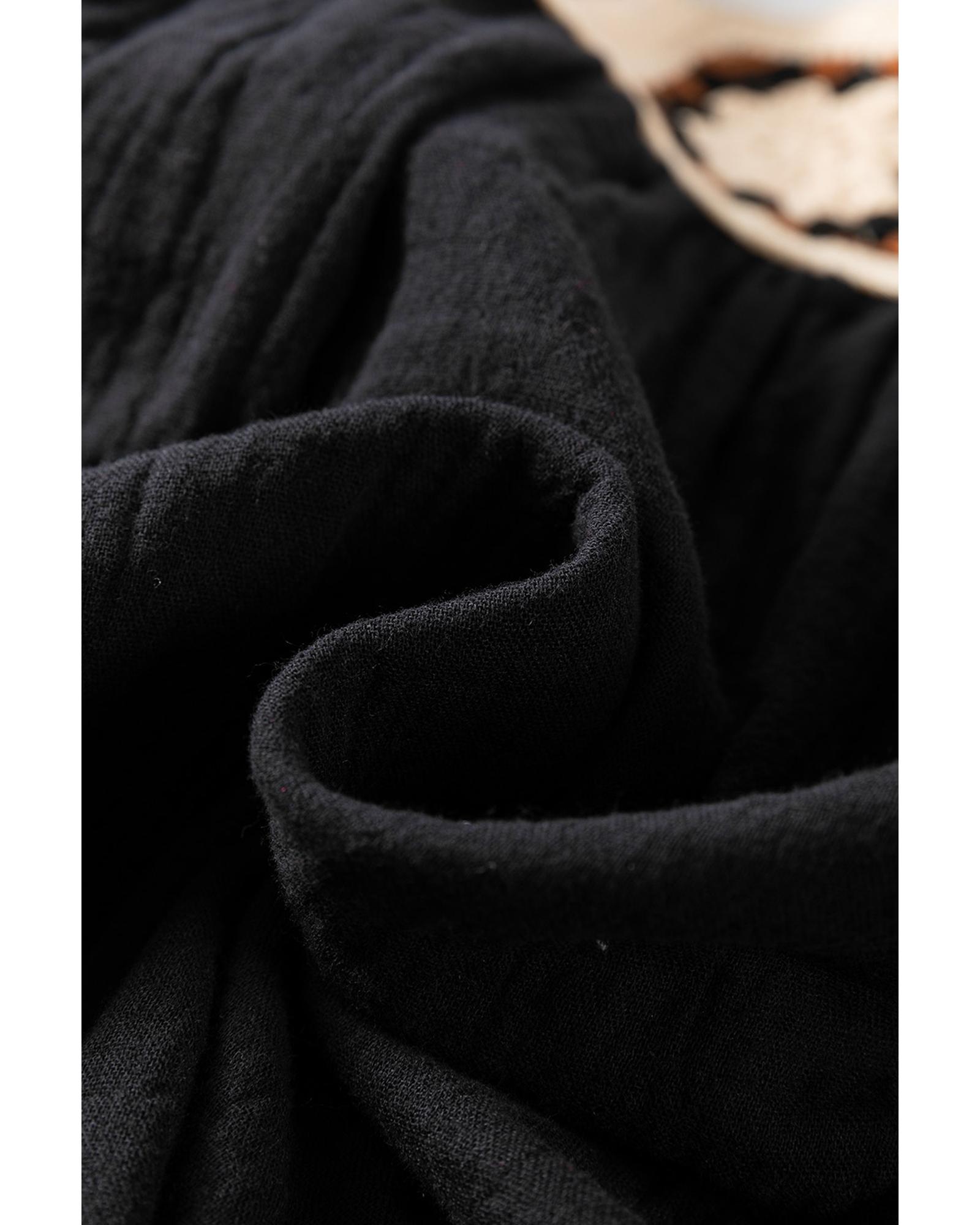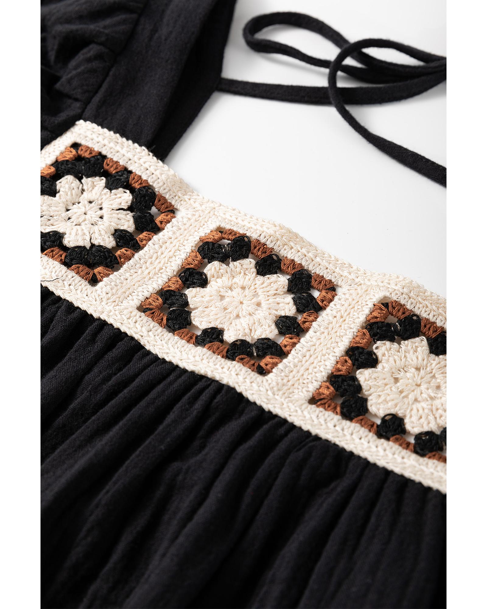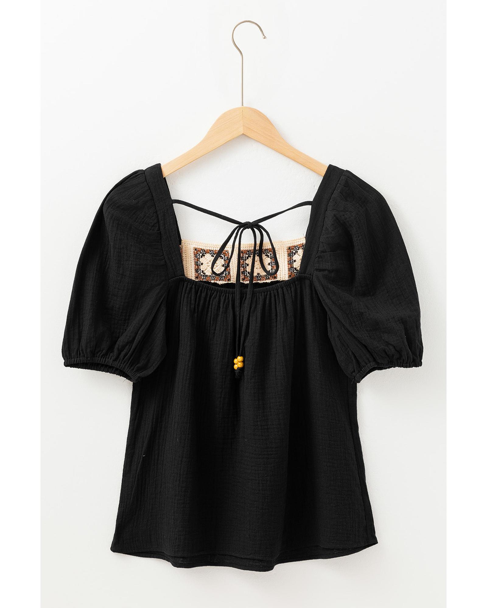 Black Flower Crochet Square Neck Textured Short Sleeve Blouse – L