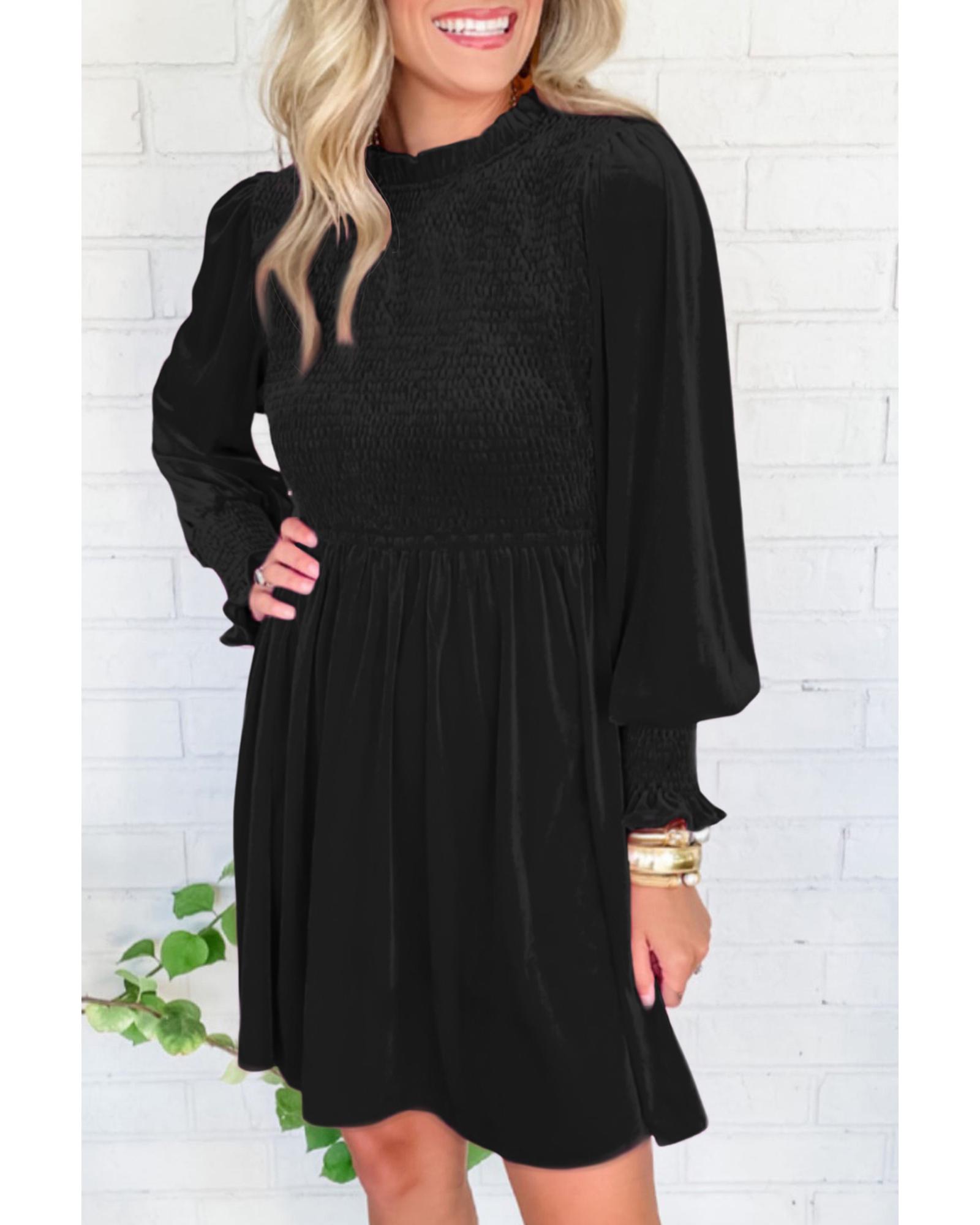 Black Frilled Neck Smocked Bodice Velvet Dress – S