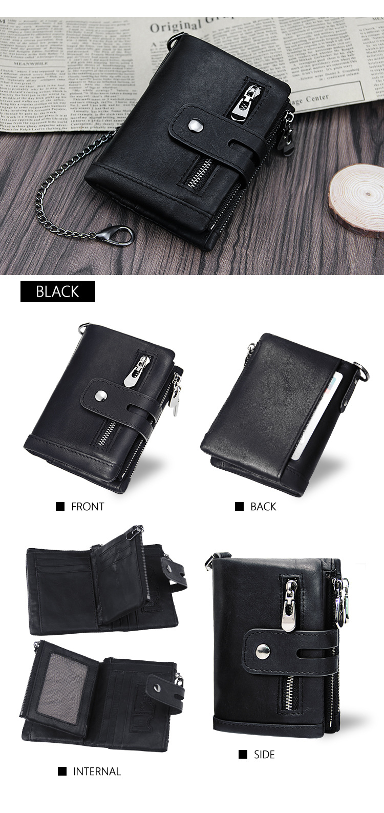• Spacious Design: Equipped with 2 banknote compartments and a secure zippered coin pocket for organized storage.