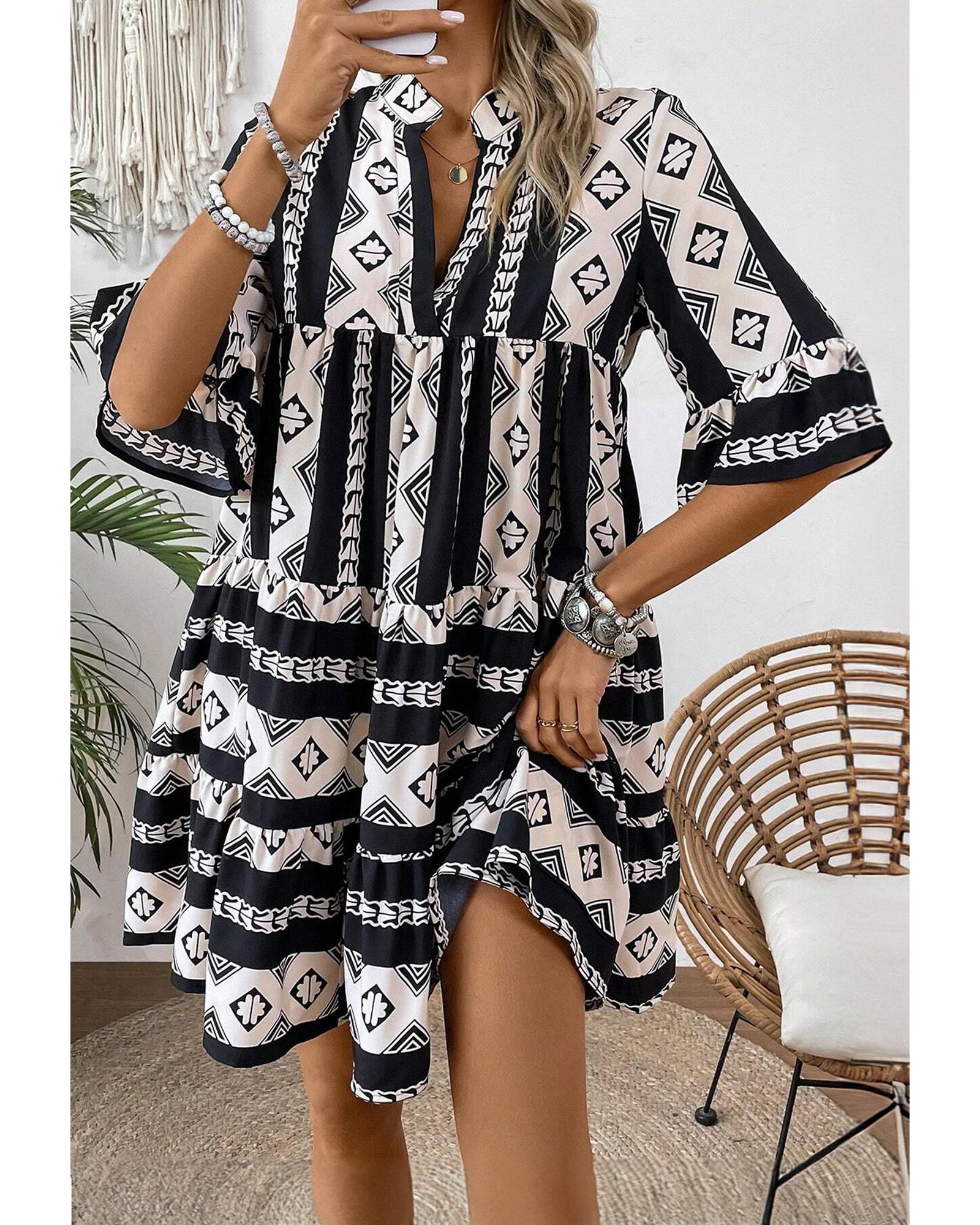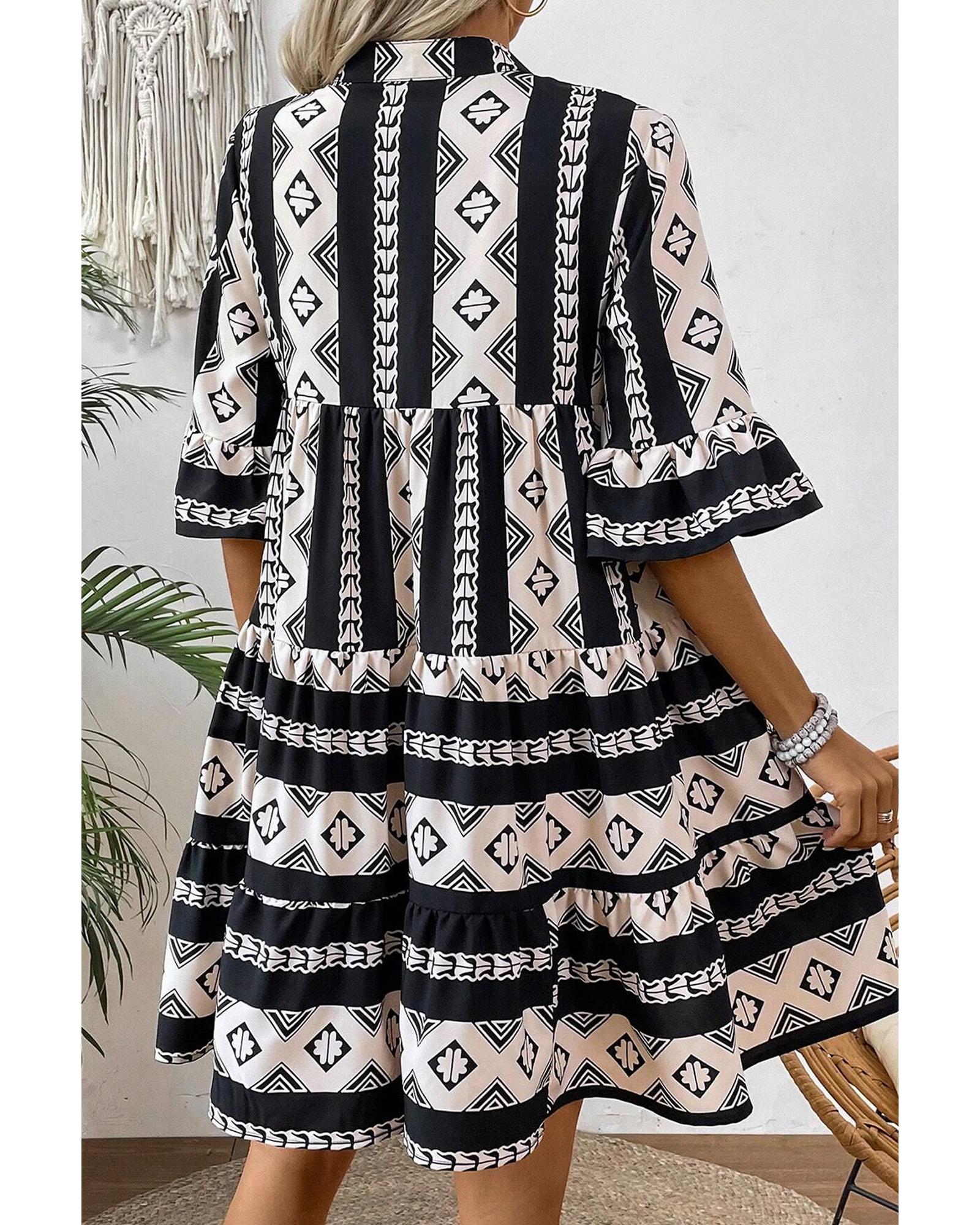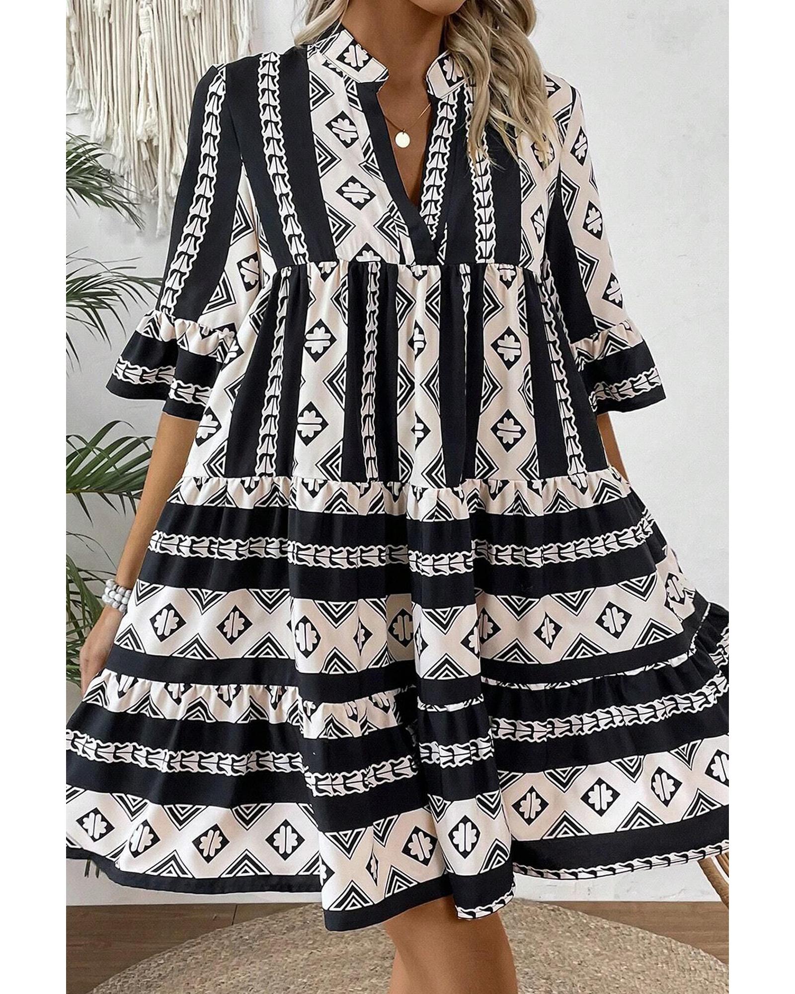 Black Geometric Print V Neck Ruffled Dress – S