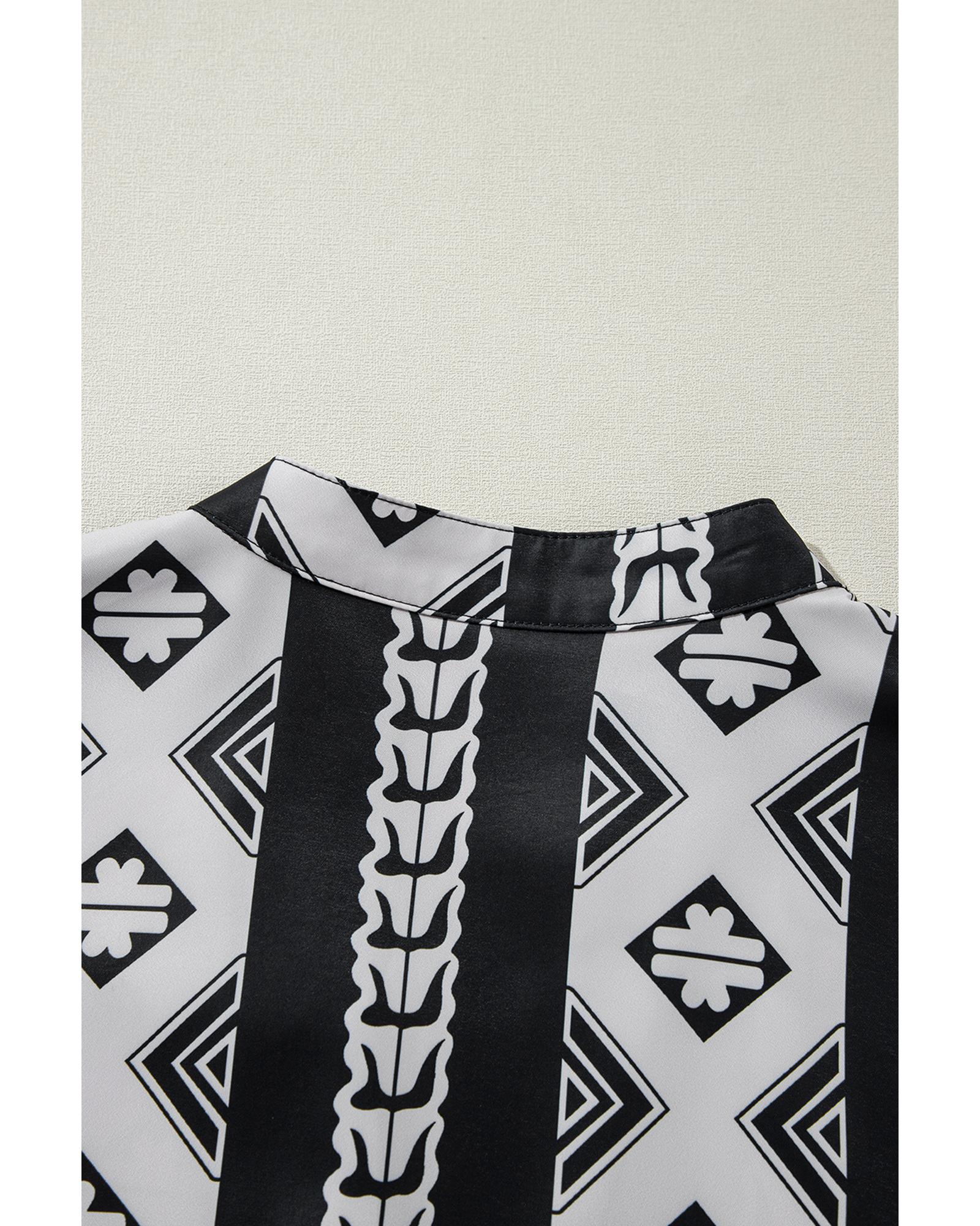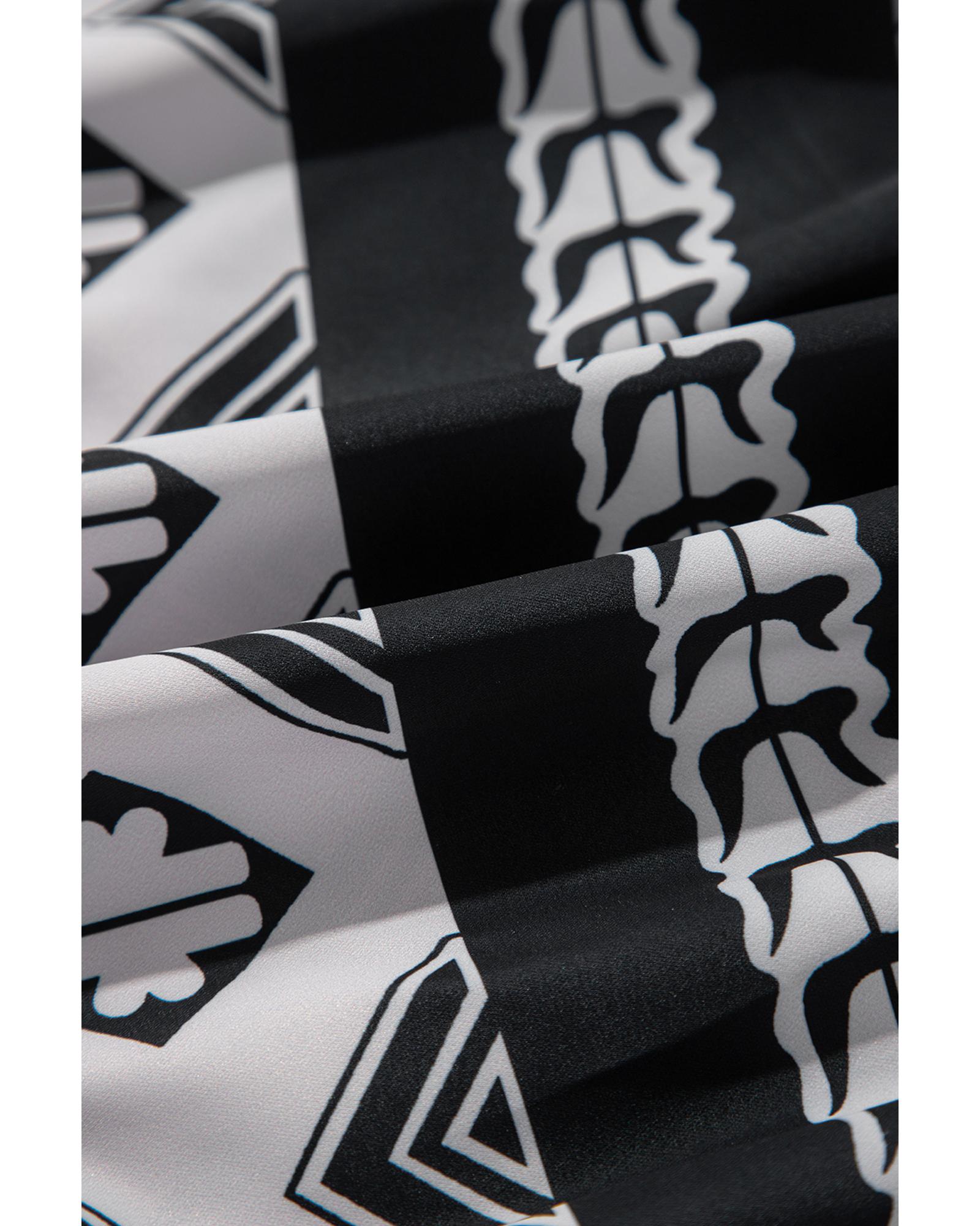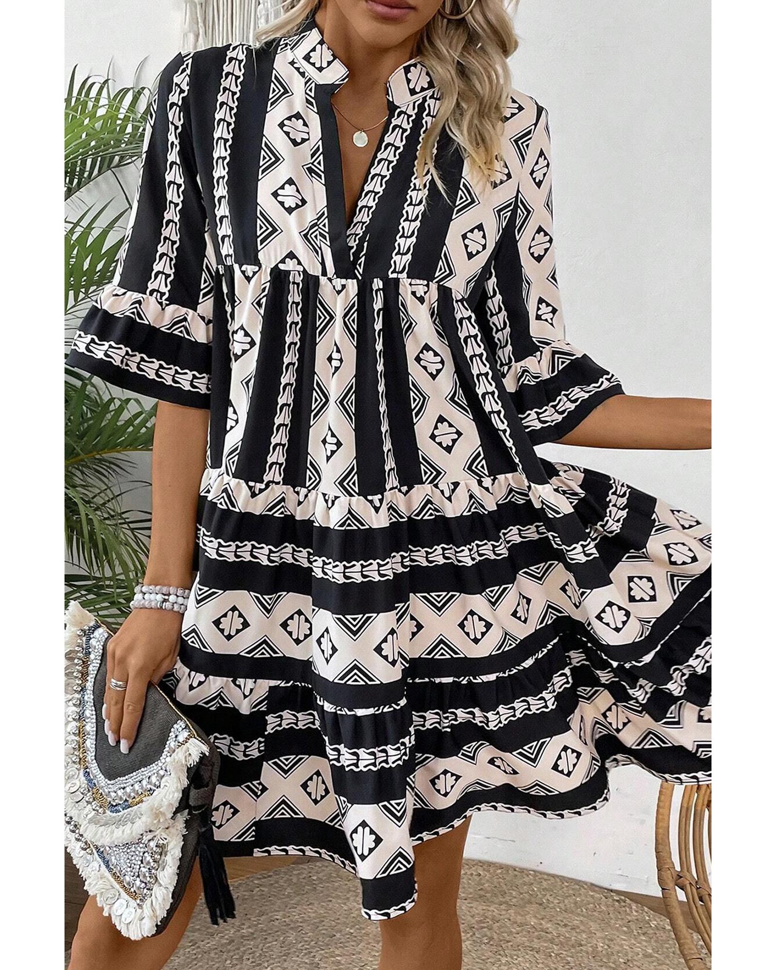 Black Geometric Print V Neck Ruffled Dress – S