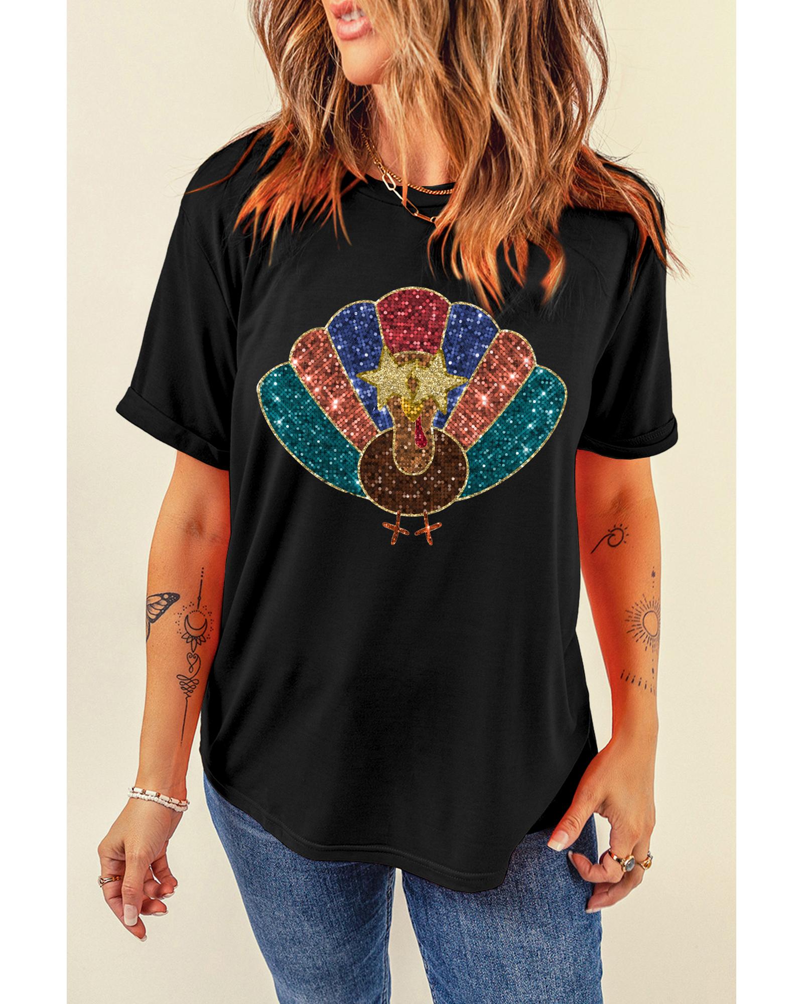 Black Glitter Turkey Heat Transfer Printing Thanksgiving T Shirt – L