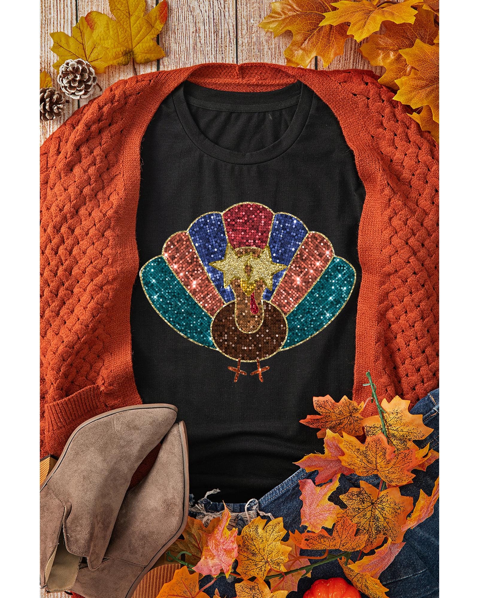 Black Glitter Turkey Heat Transfer Printing Thanksgiving T Shirt – XL