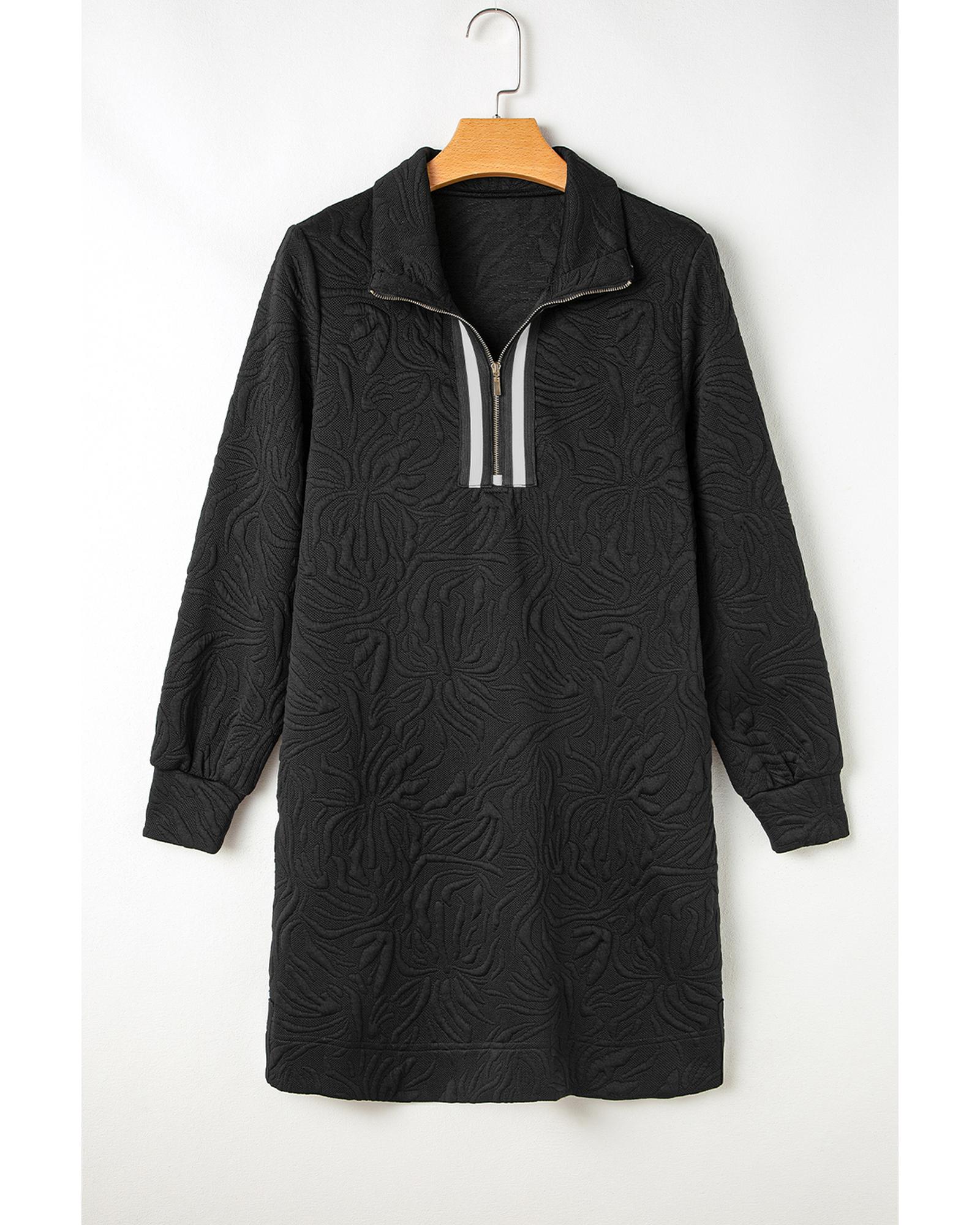Black Jacquard Textured Quarter Zipper Shift Mini Dress – S