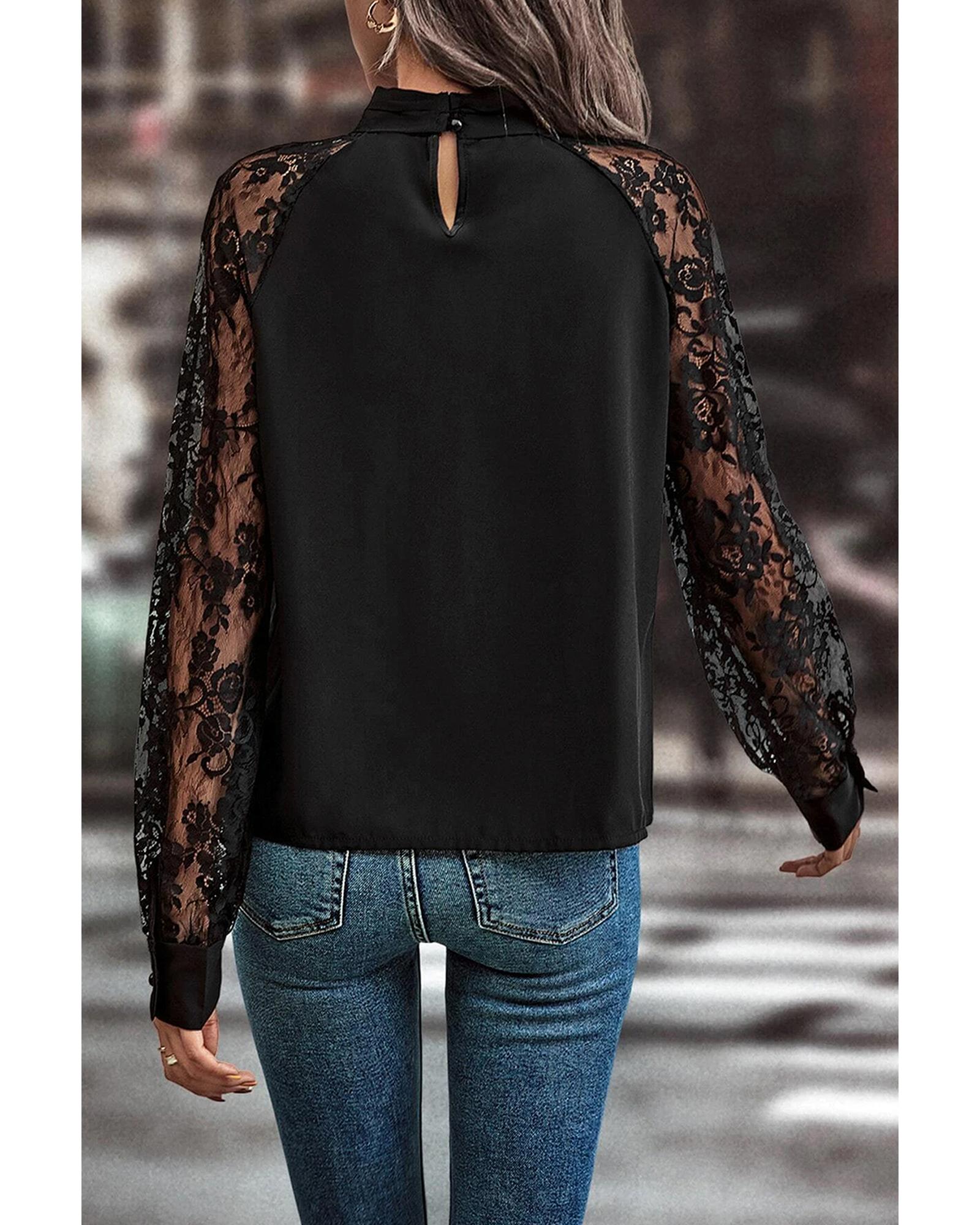 - Black Keyhole Neckline Floral Lace Raglan Sleeve Blouse