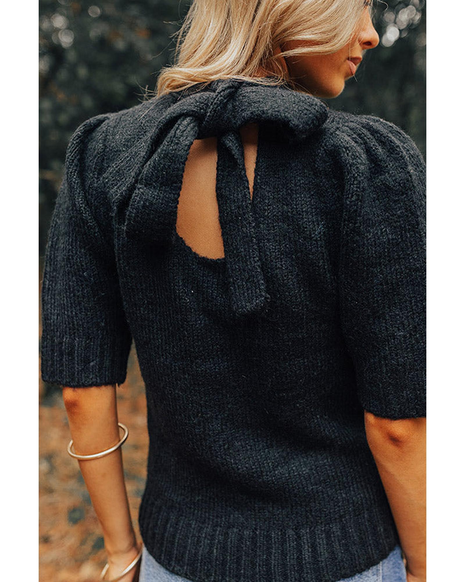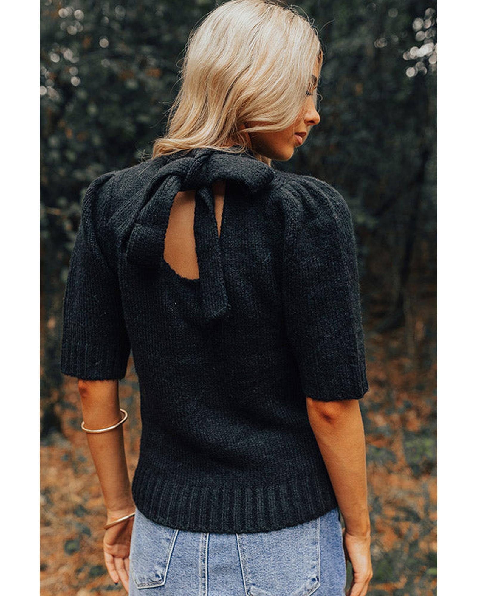Black Knotted Keyhole Nape Short Sleeve Knit Sweater - S
