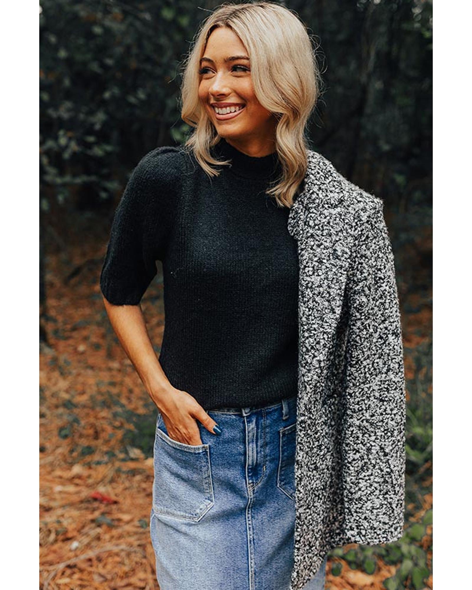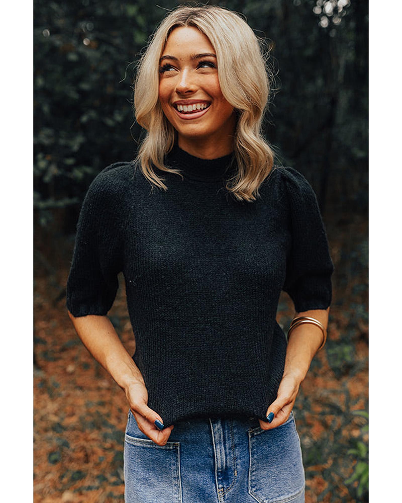 Black Knotted Keyhole Nape Short Sleeve Knit Sweater – S