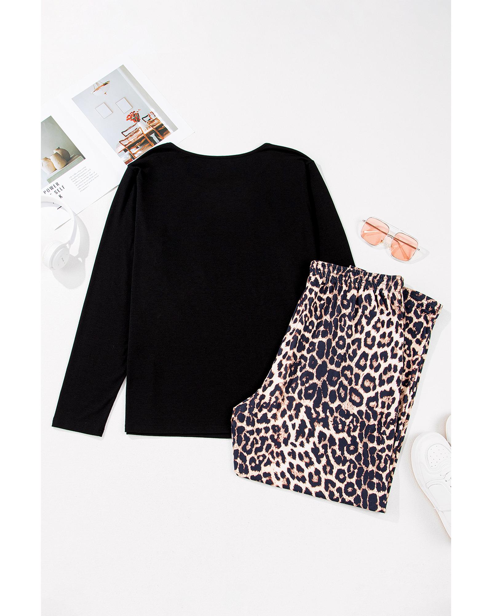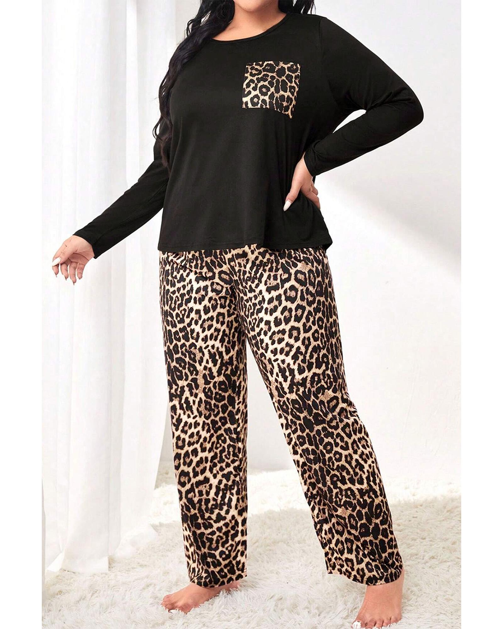 Black Leopard Patched Pocket Long Sleeve Top Plus Size Pants Set - 2X