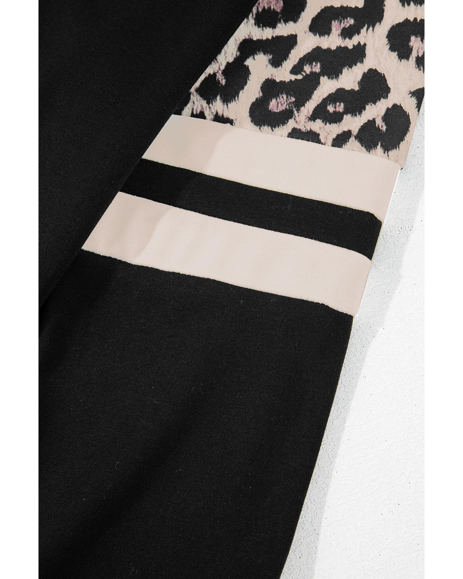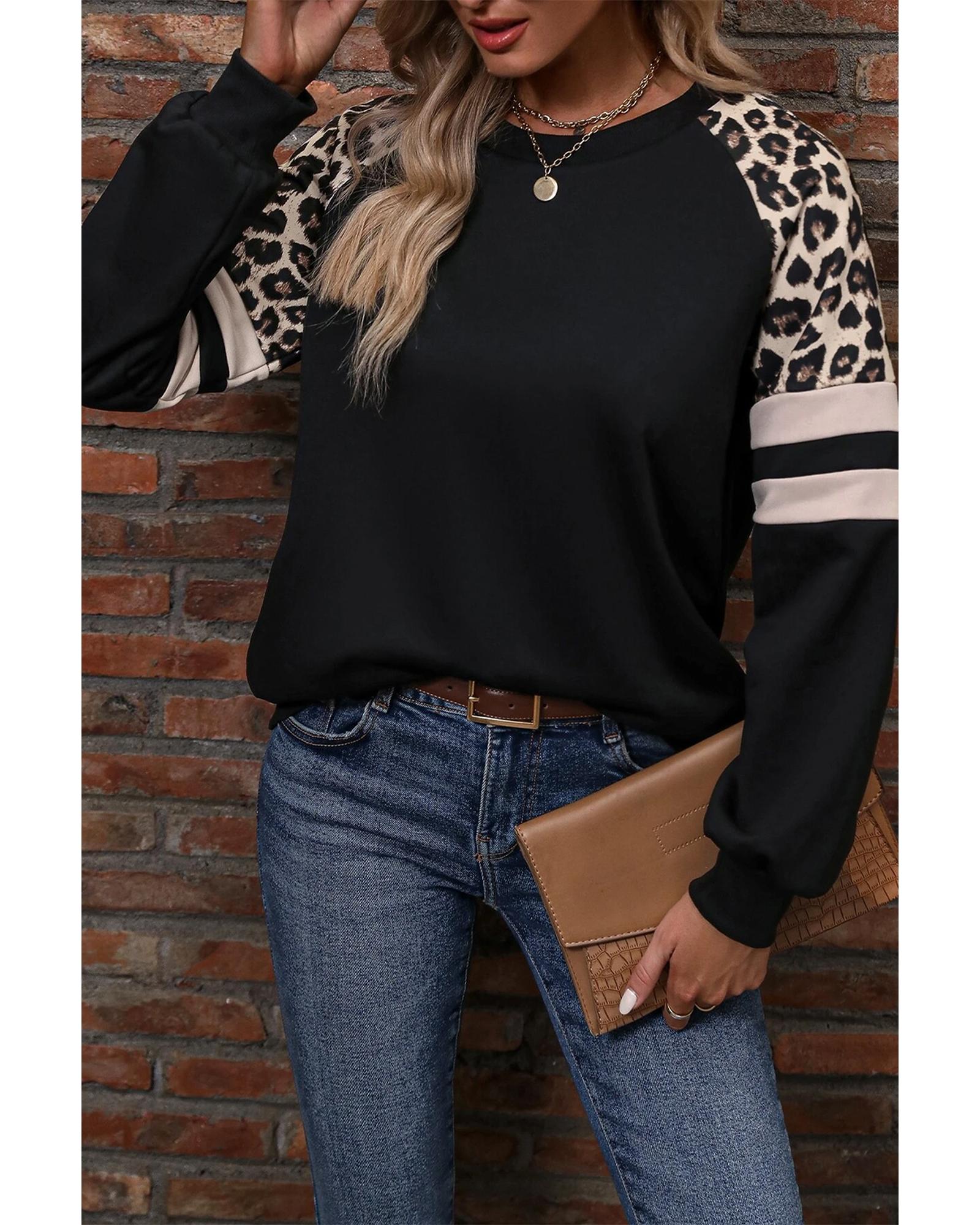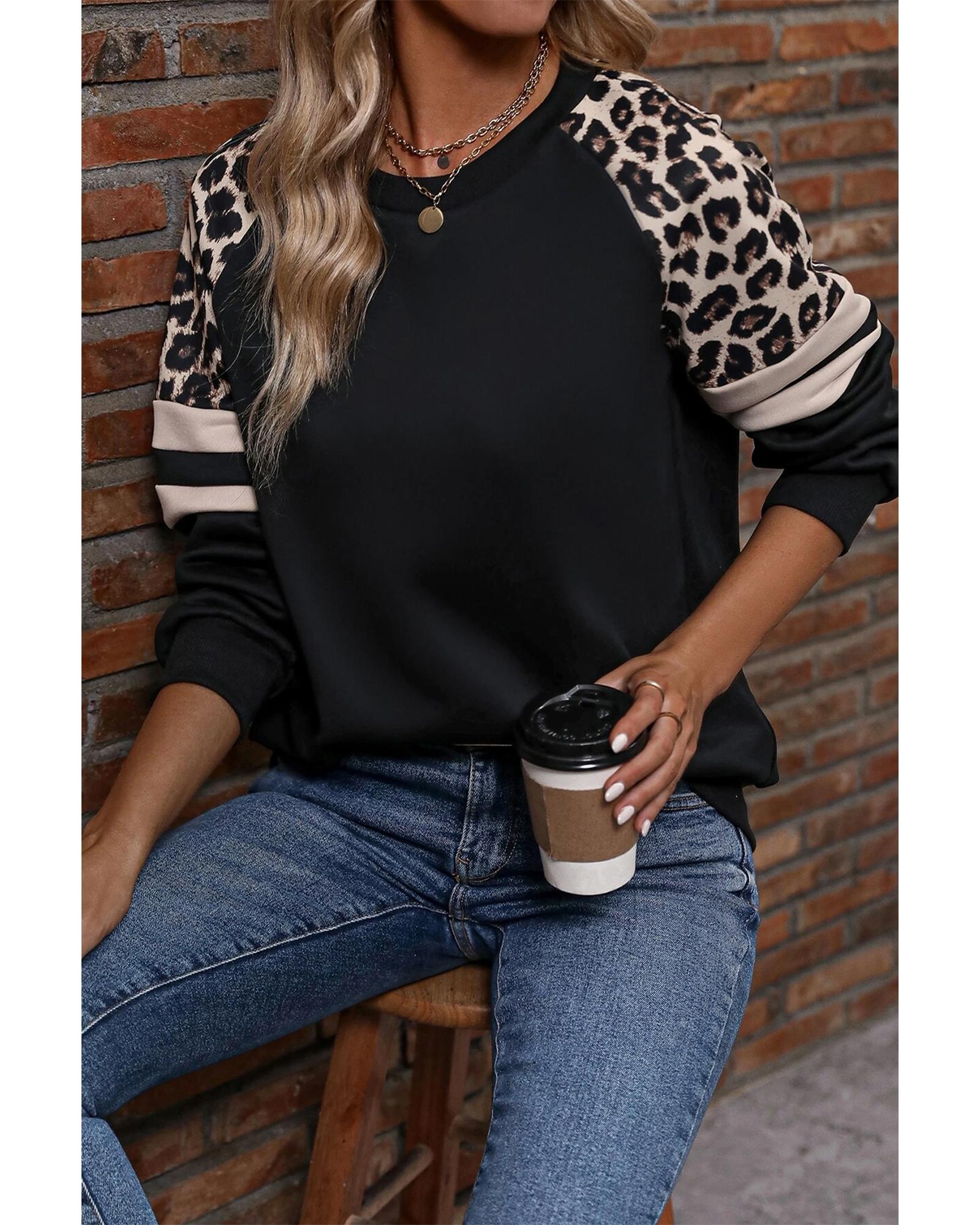 • Black Leopard Print Colorblock Raglan Sleeve Sweatshirt