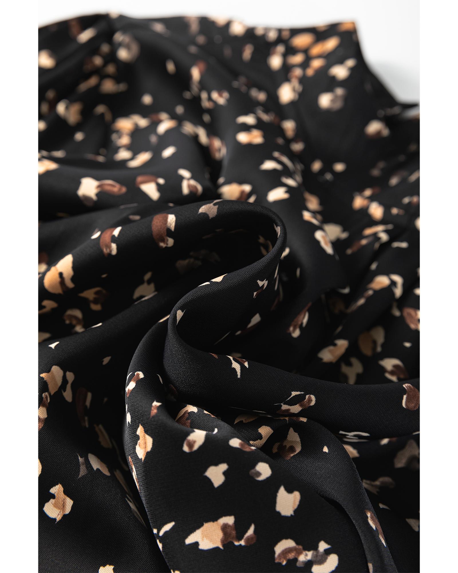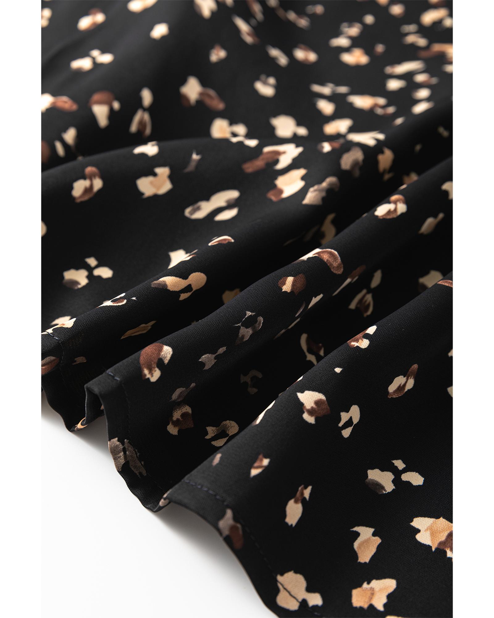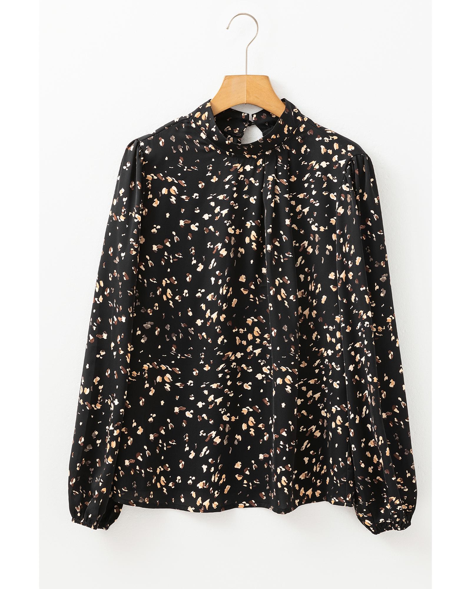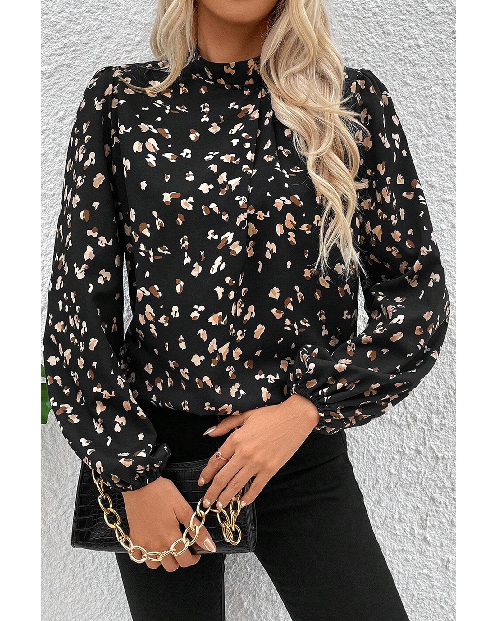 - Black Leopard Print Lantern Sleeve Mock Neck Pleated Blouse