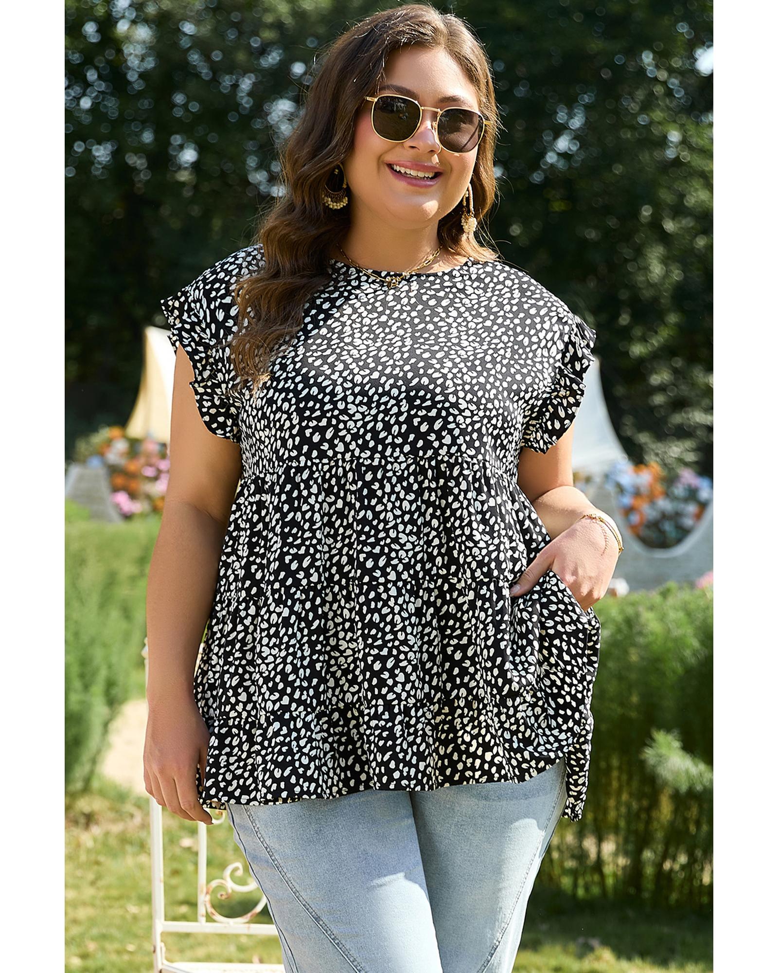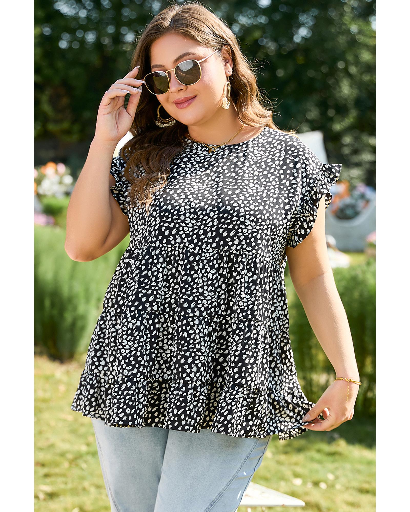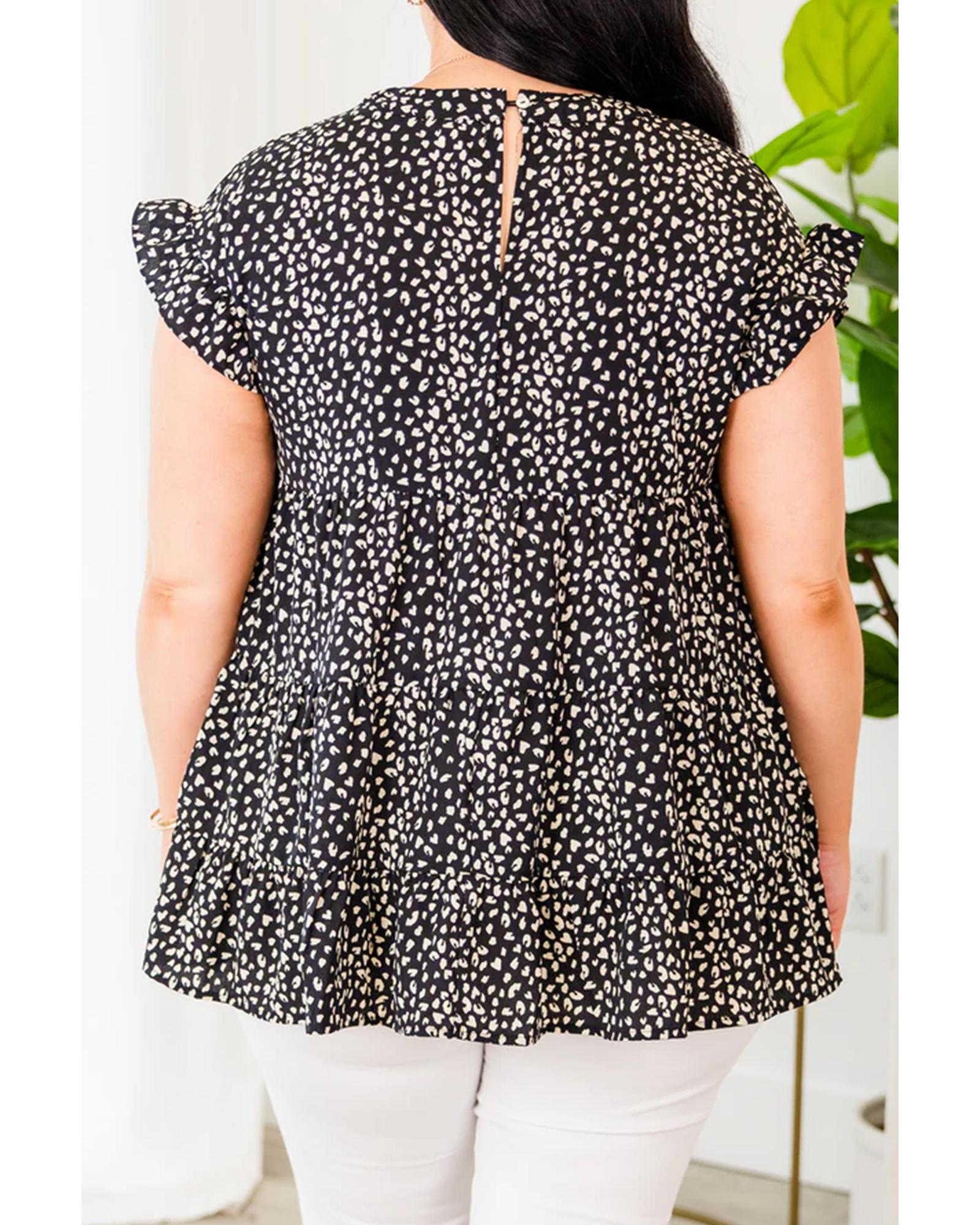 Black Leopard Print Ruffled Short Sleeve Keyhole Back Tiered Flowy Plus Size Blouse – 2X