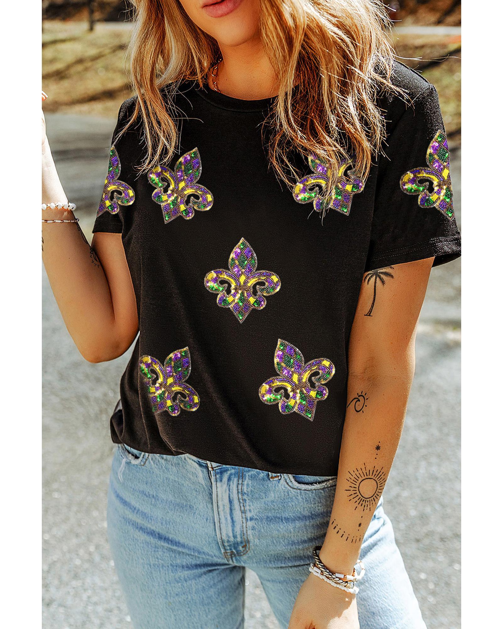 Black Maid Gras Sequin Fleur de Lis Graphic T Shirt – M