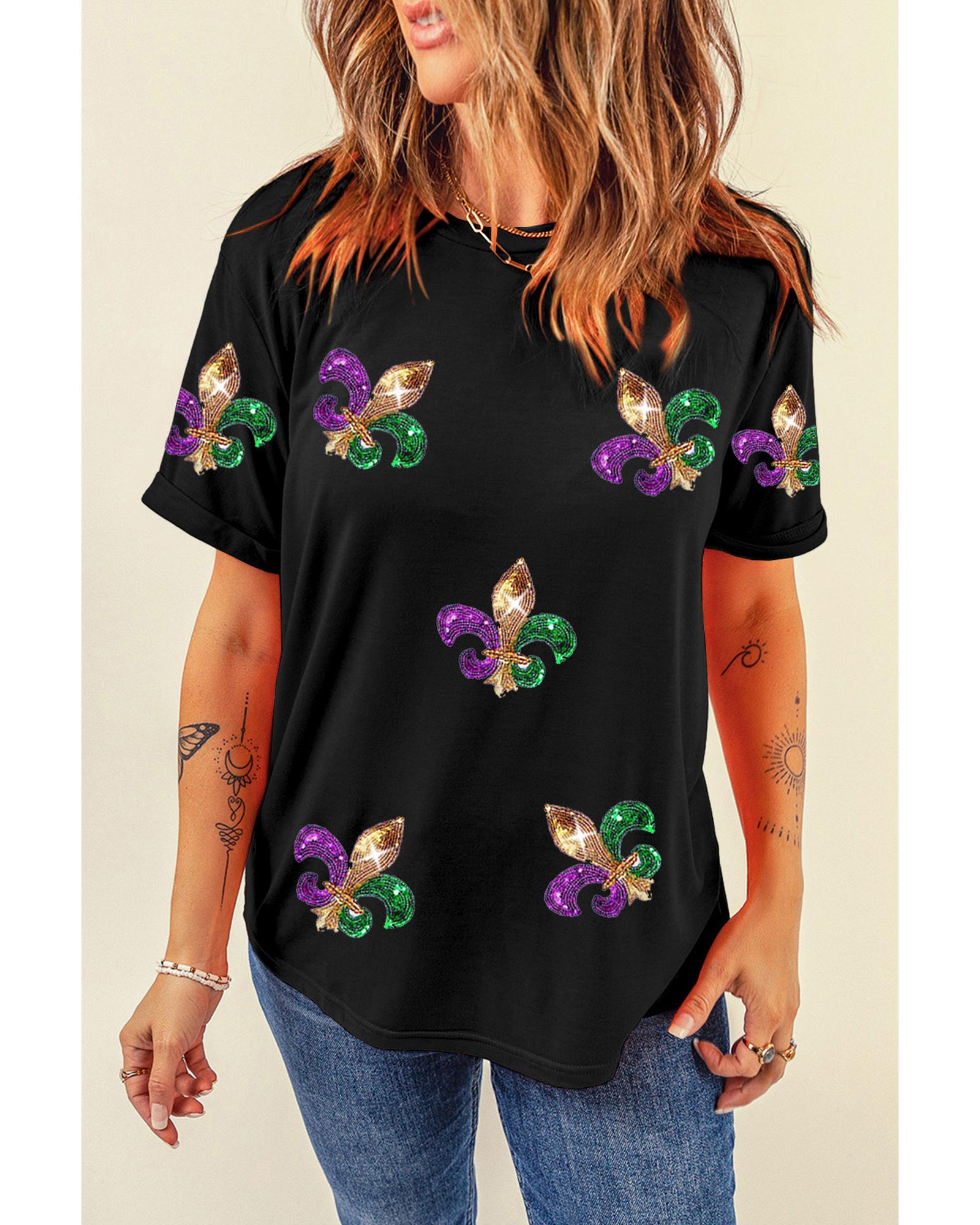 - Black Mardi Gras Symbol Patched Crewneck T