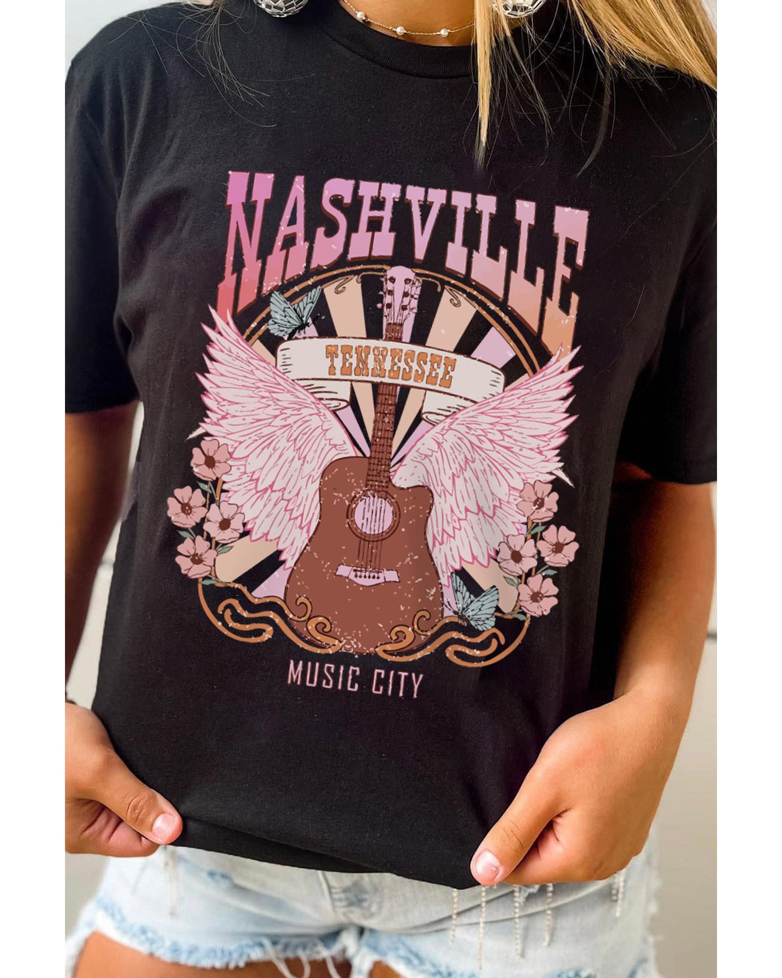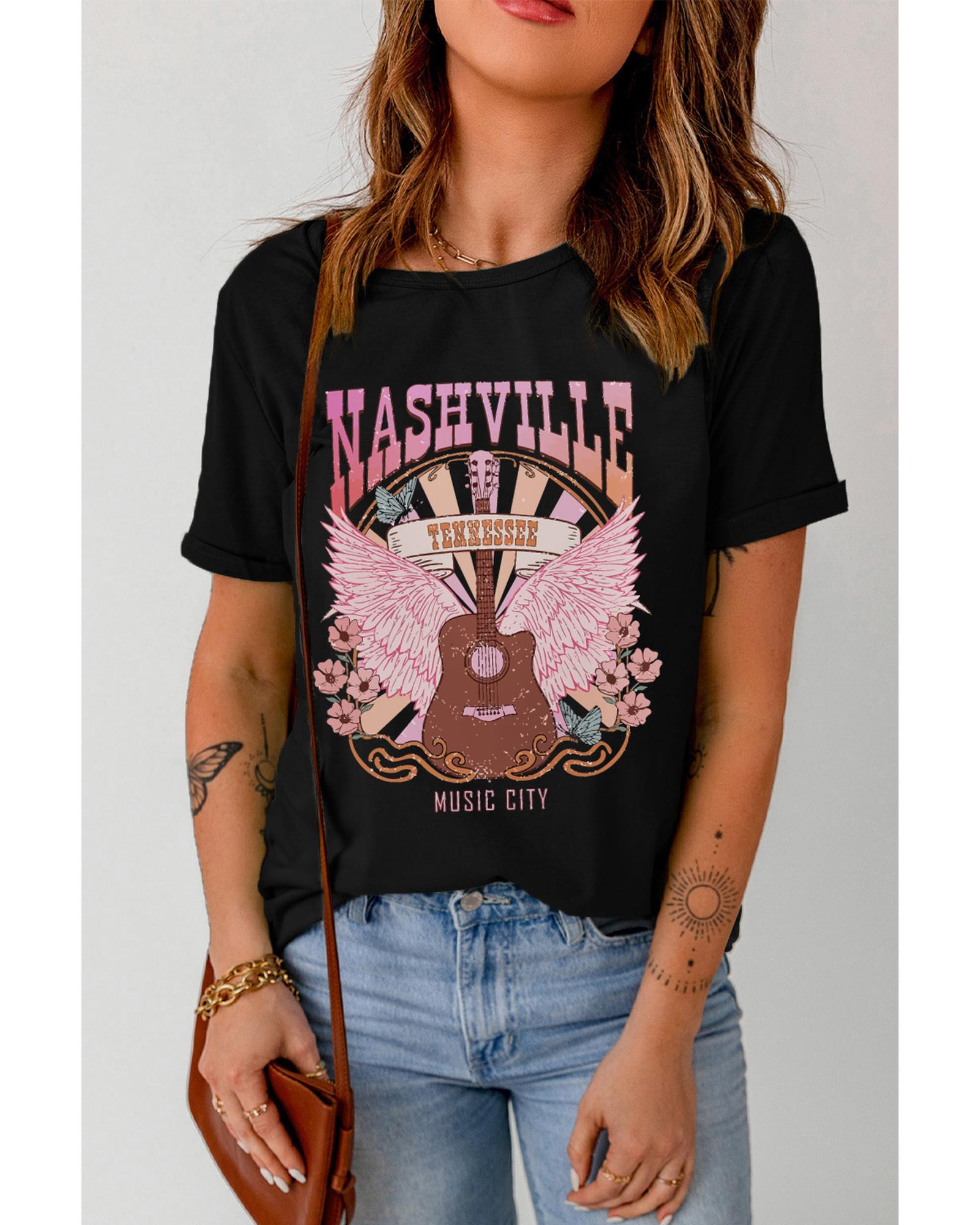 Stylish and trendy black short sleeve top Features a unique NASHVILLE Music City graphic print design Made from high