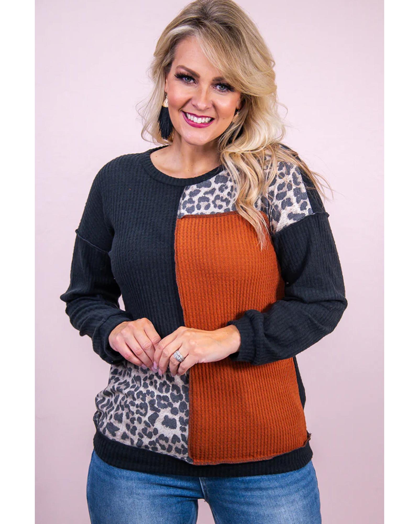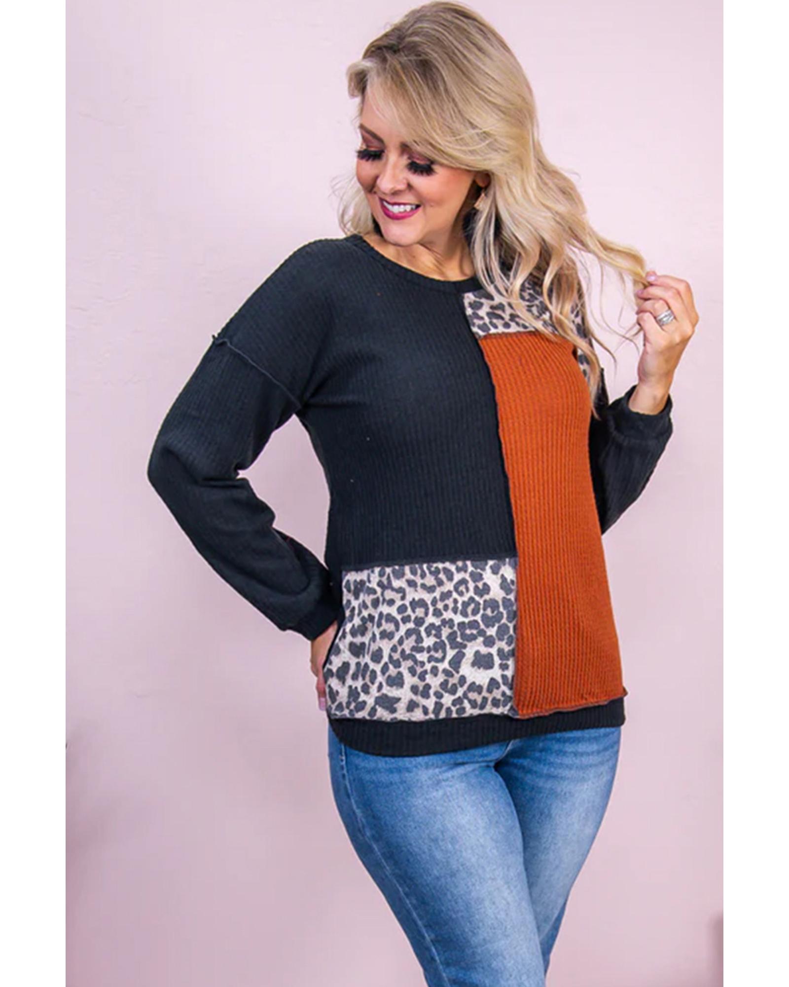 Black Orange Colorblock Leopard Patchwork Waffle Knit Plus Size Top – 1X