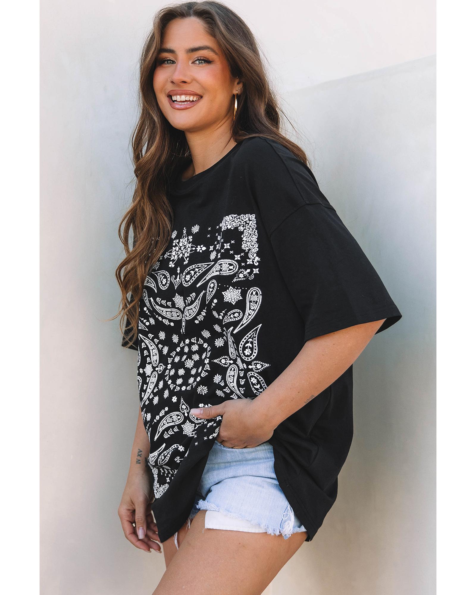 • Black Paisley Print Crew Neck Loose Fit Tunic Tee