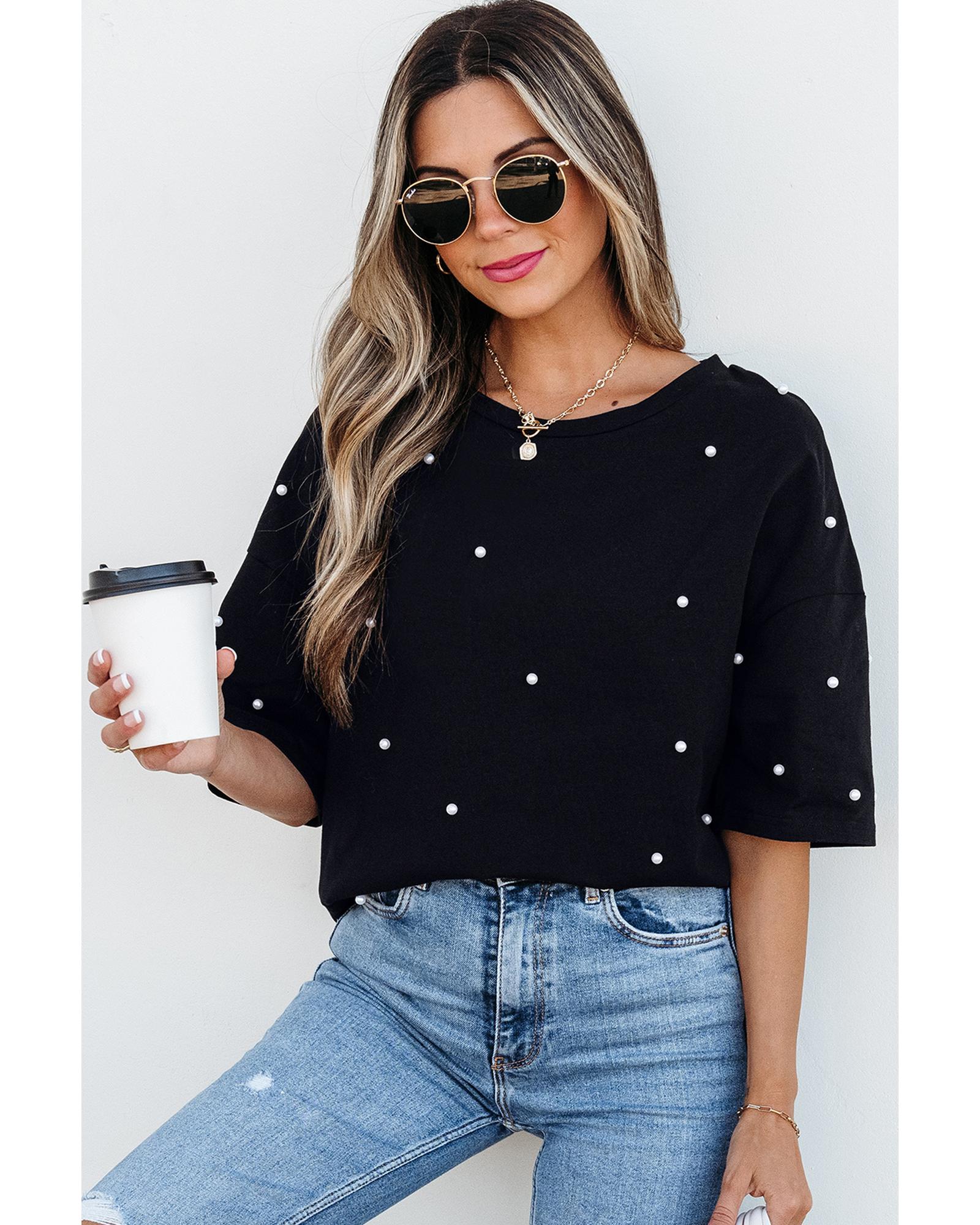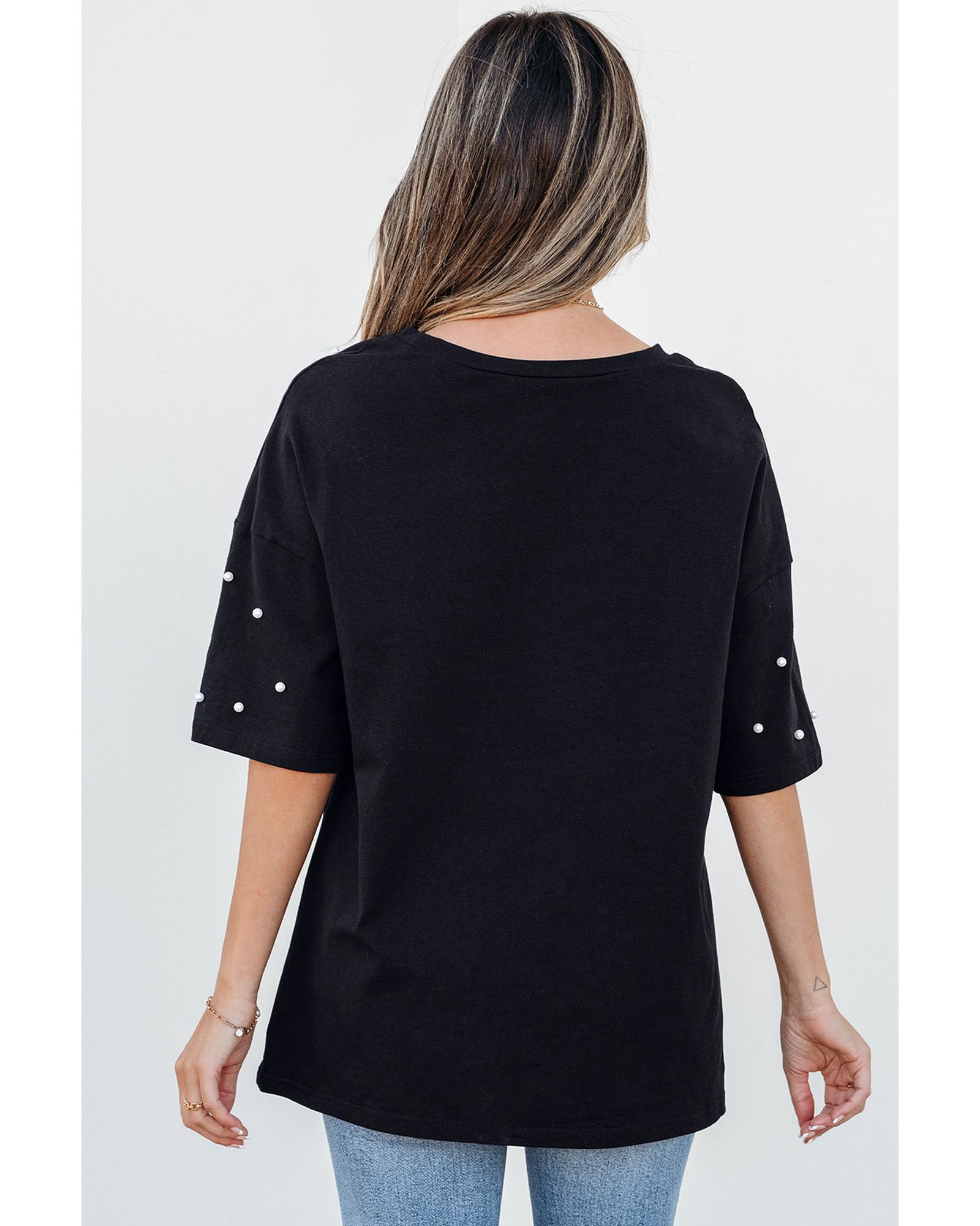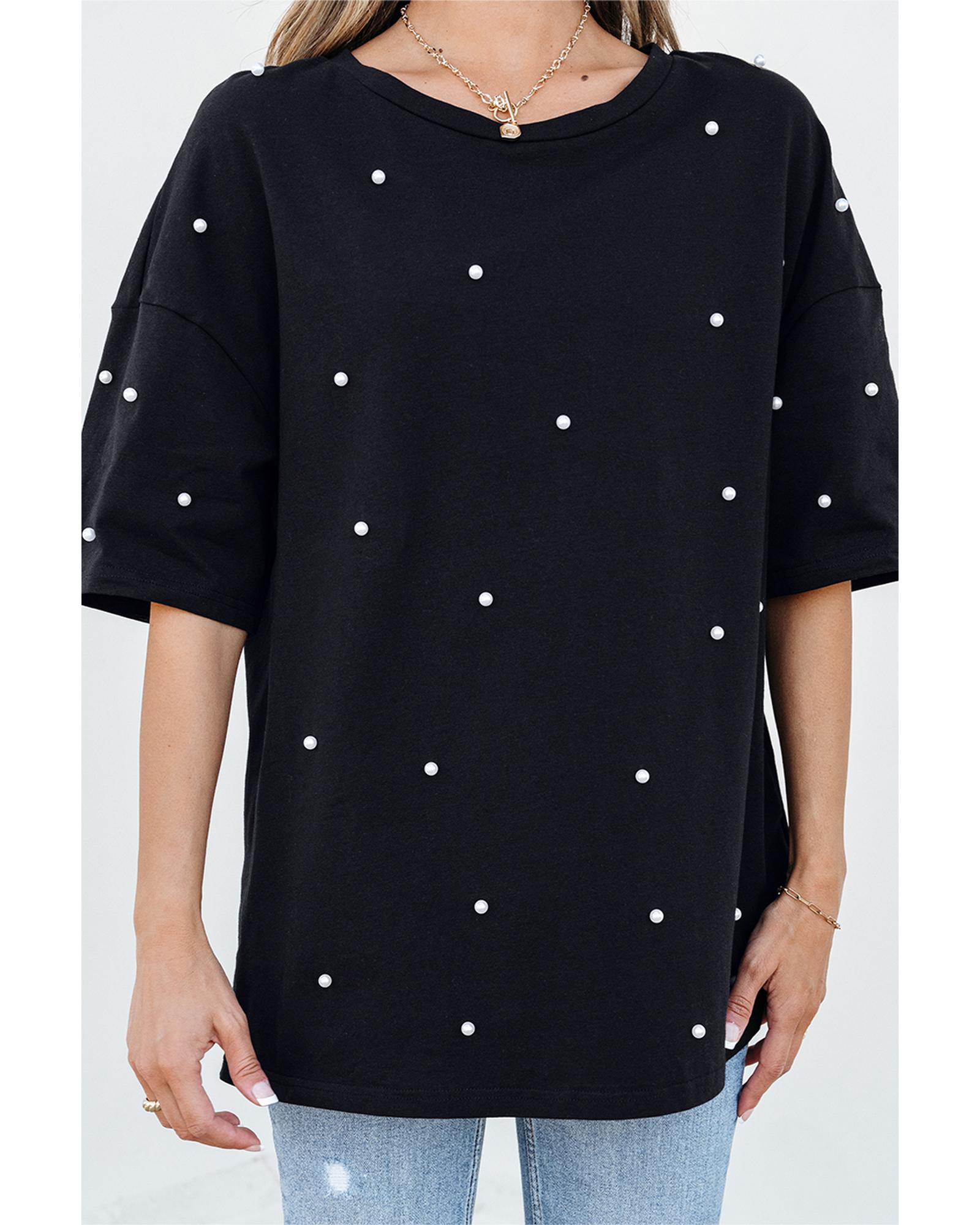 Black Pearl Beaded Drop Shoulder Crewneck T Shirt – S
