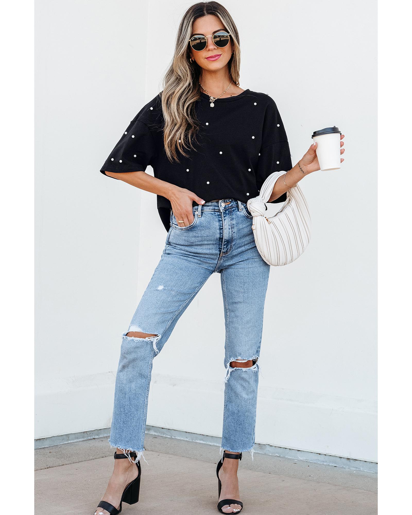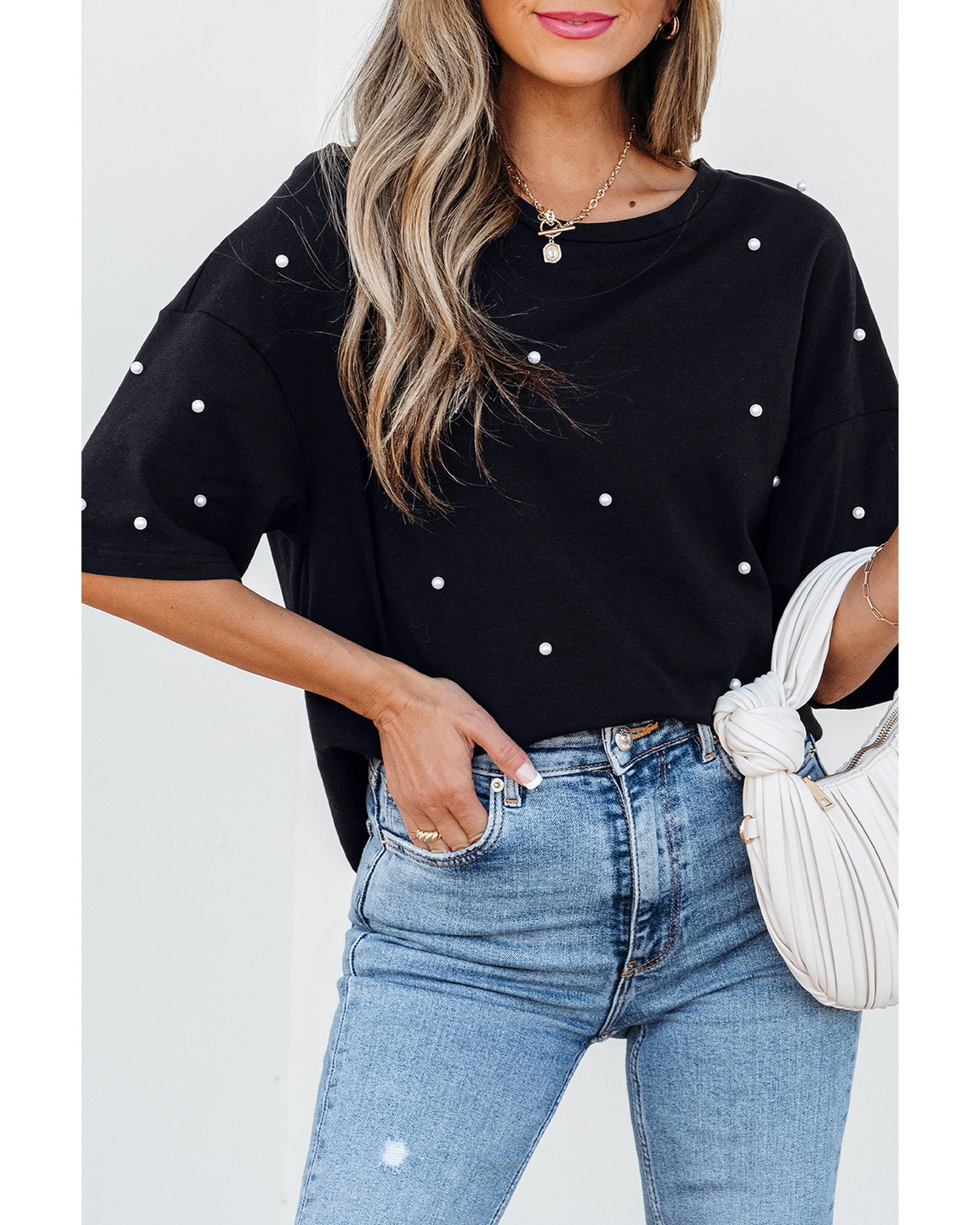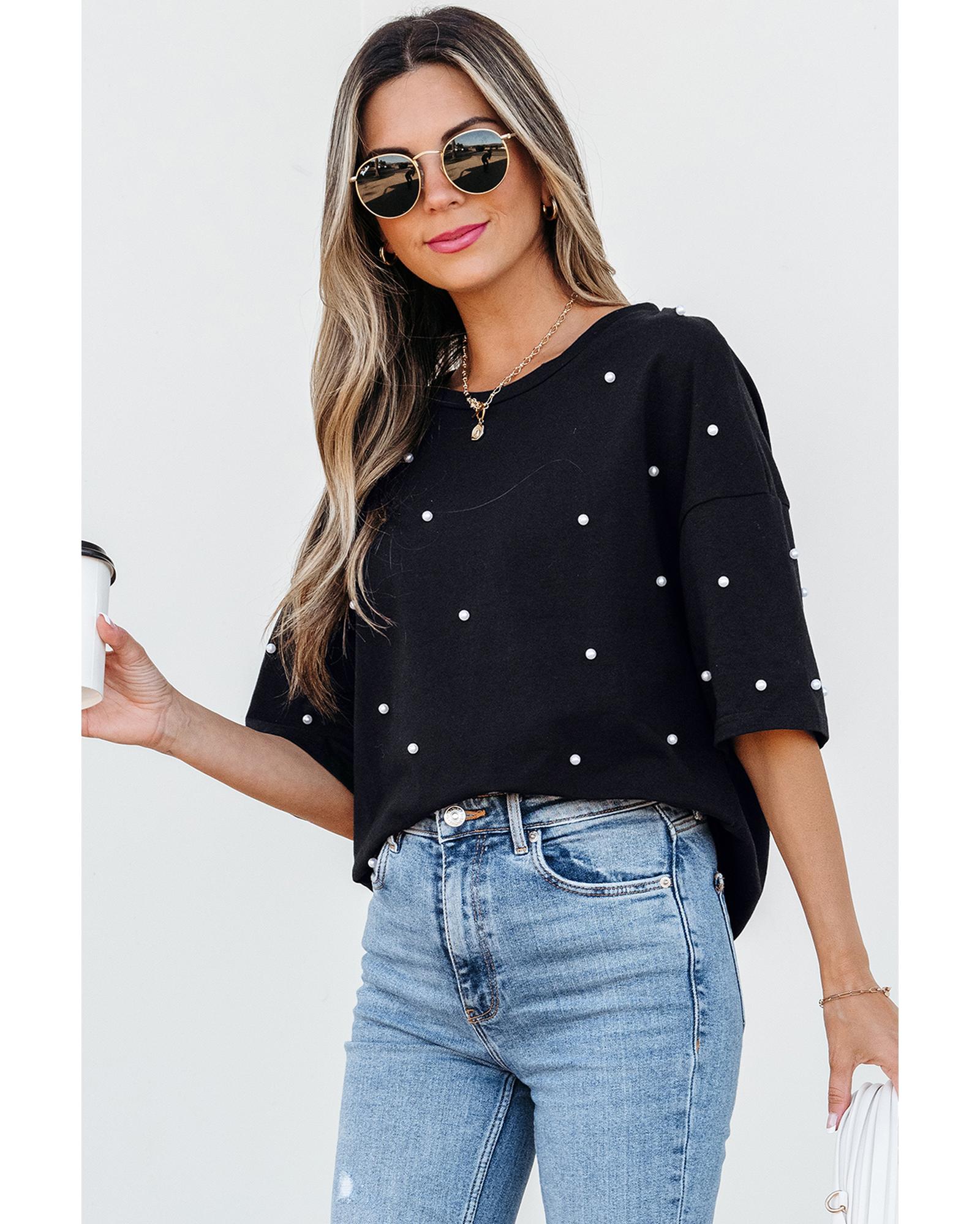 Black Pearl Beaded Drop Shoulder Crewneck T Shirt – S