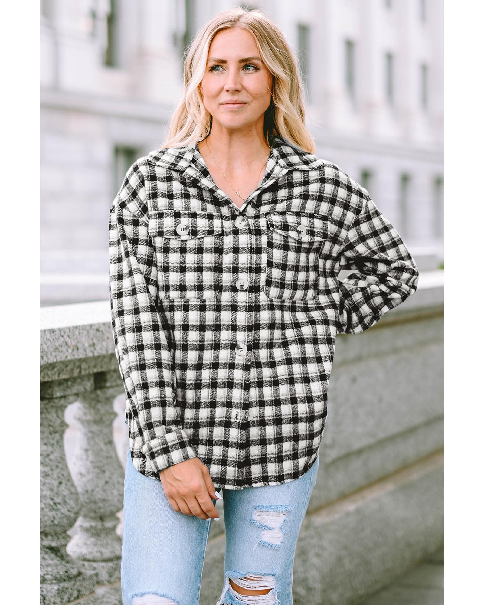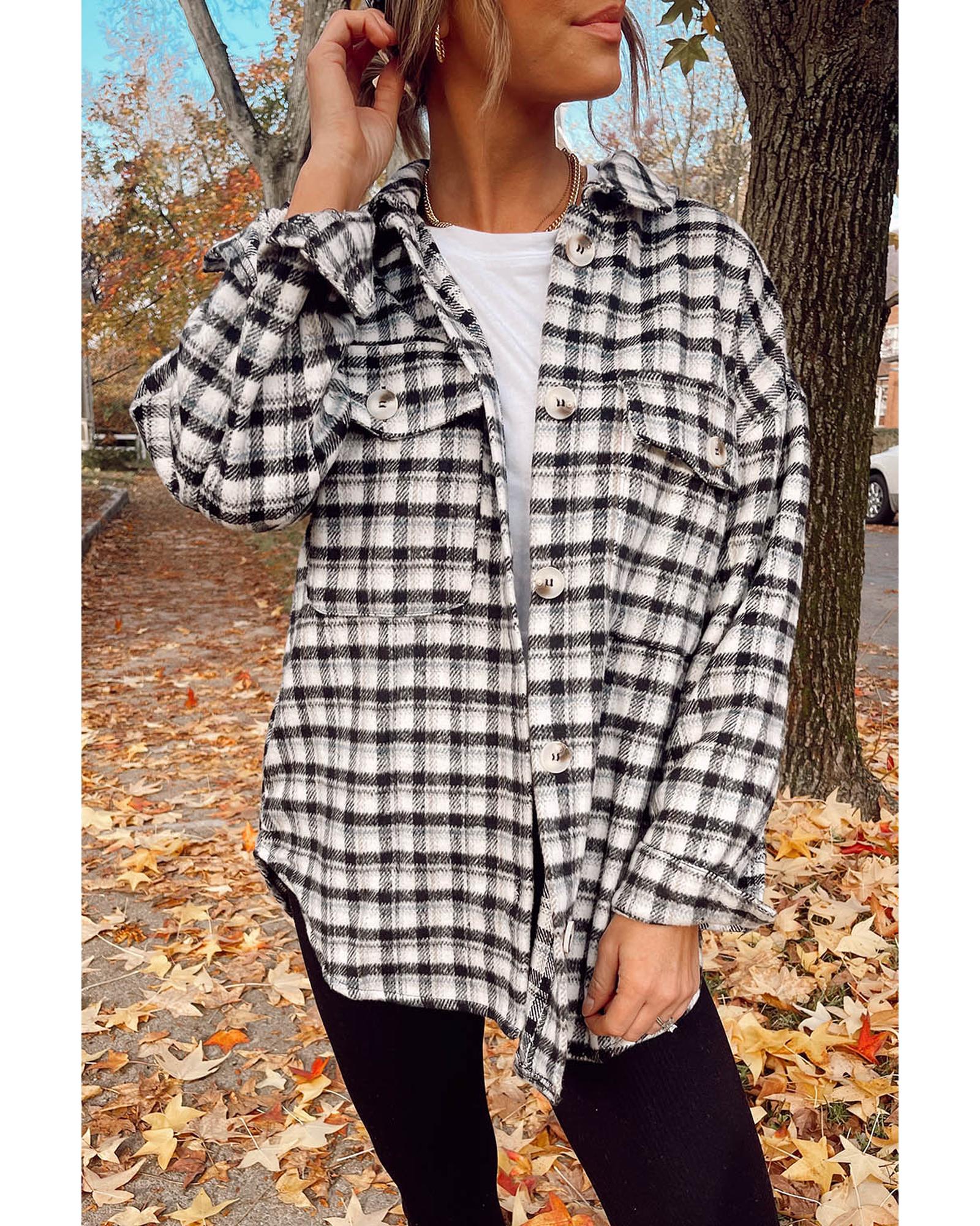 Black Plaid Print Chest Pockets Buttoned Tunic Shacket – XL