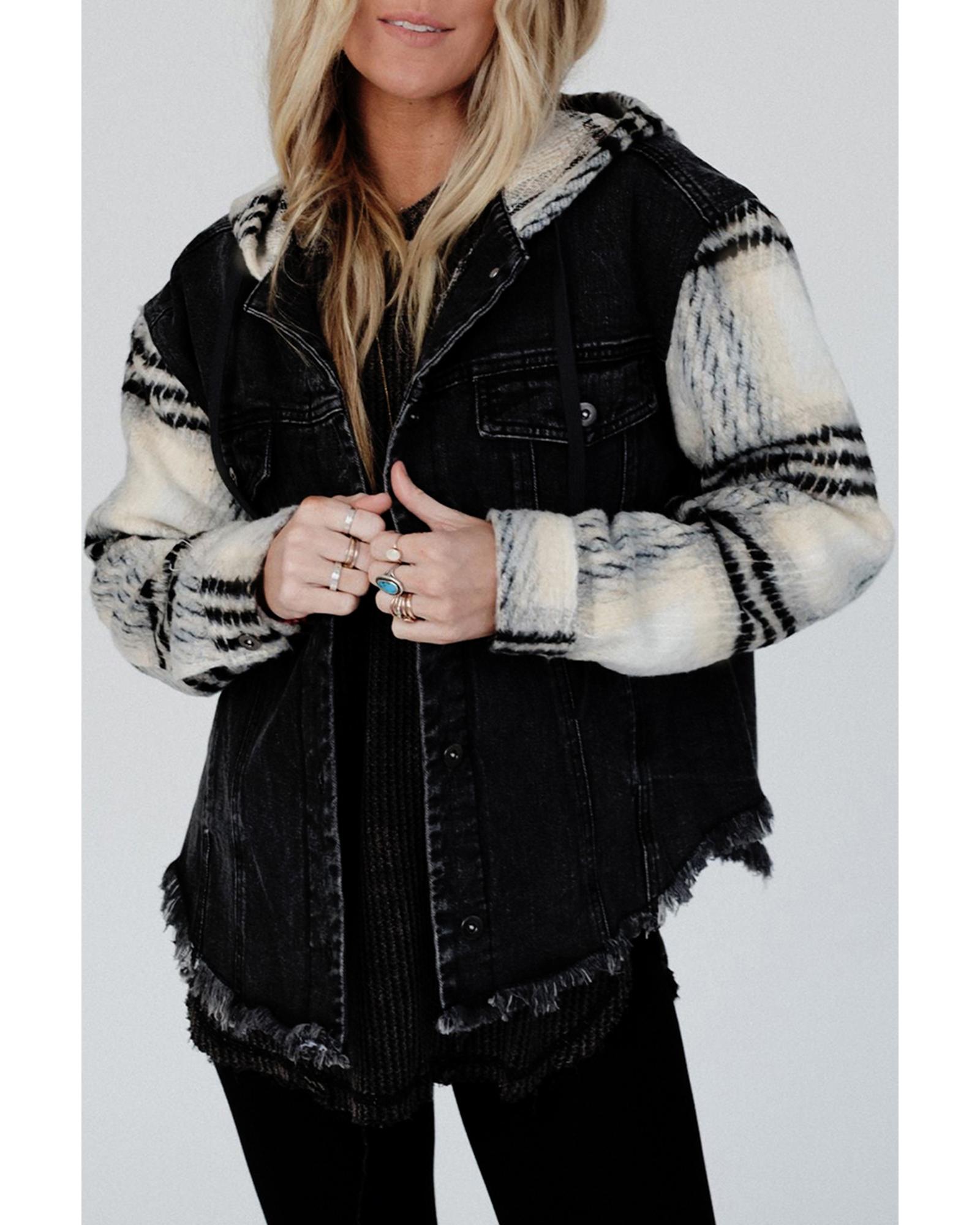 - Black Plaid Sleeve Frayed Hem Hooded Denim Jacket