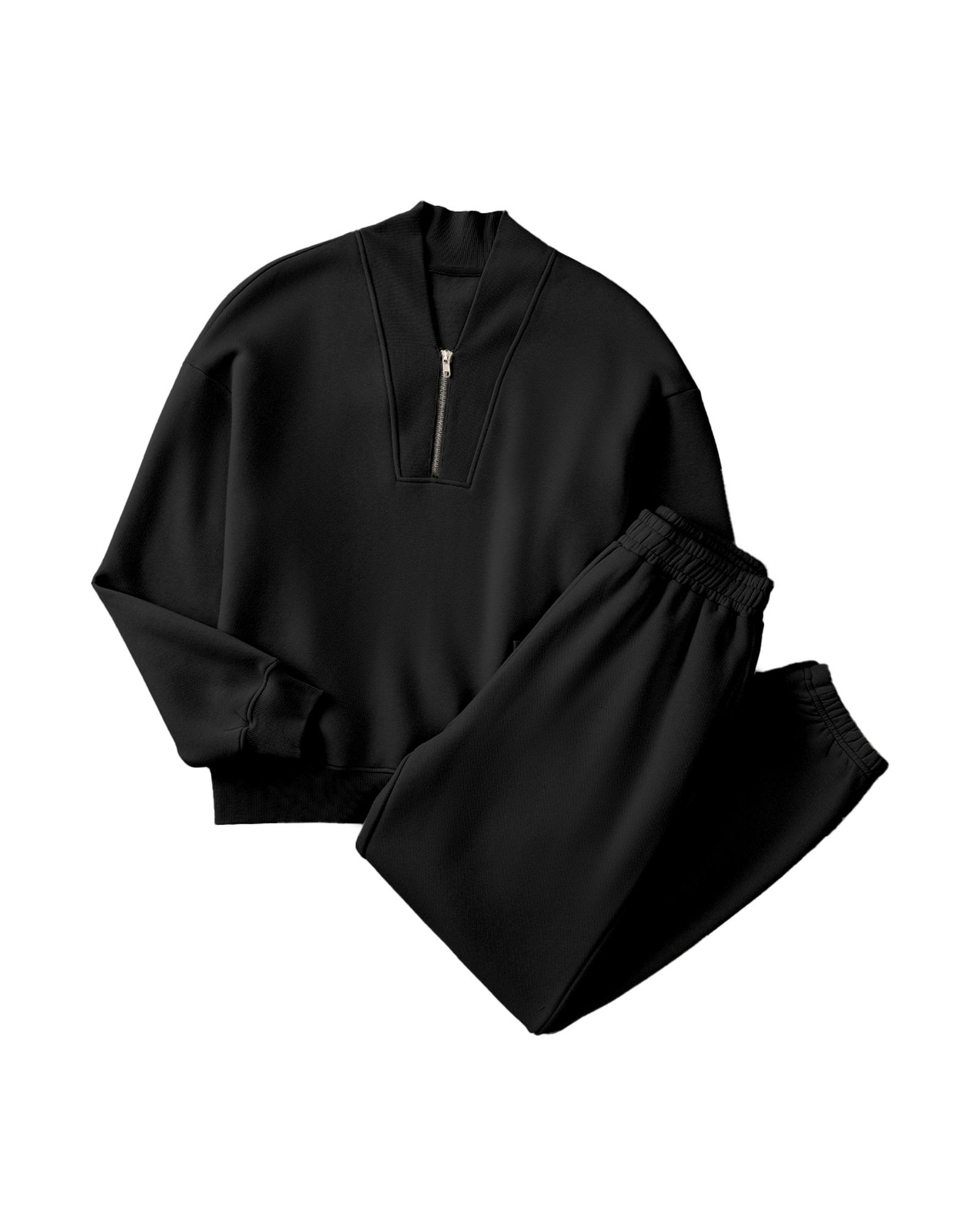 Black Plain Half Zip V Neck Ribbed Edge Loose Tracksuit – 2XL