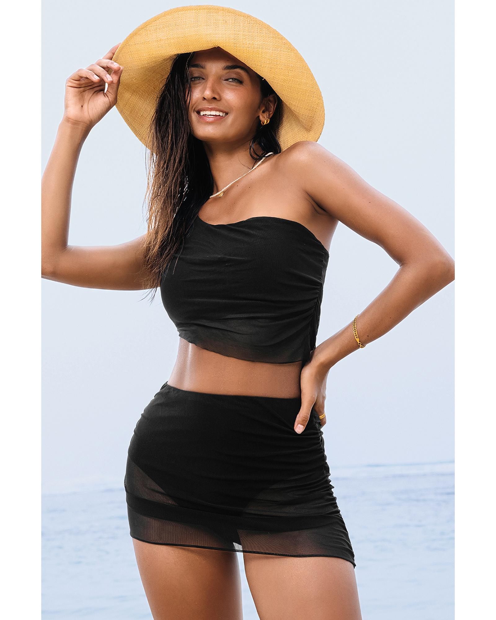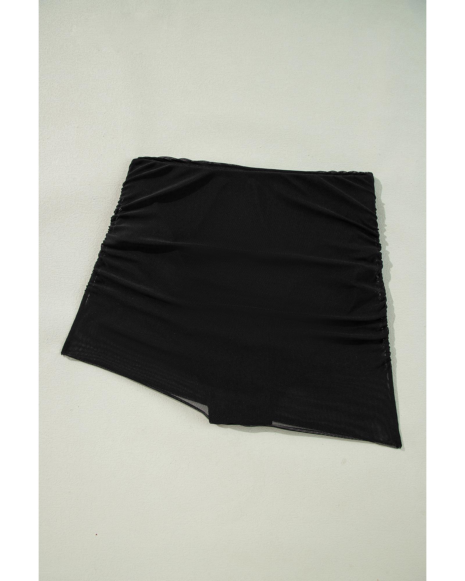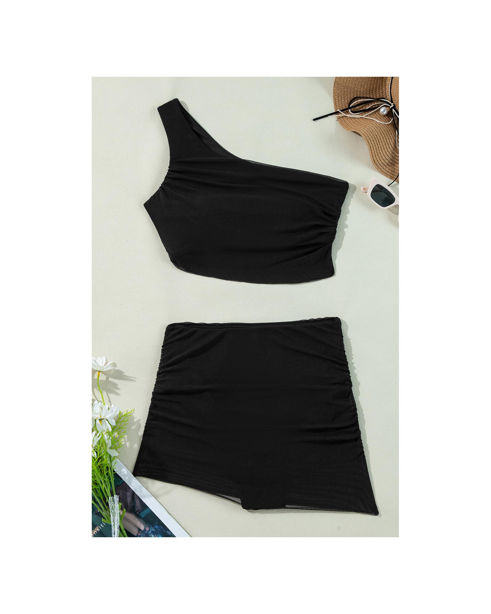 Black Pleated Mesh One Shoulder Bikini Top and Skirts Set – XL