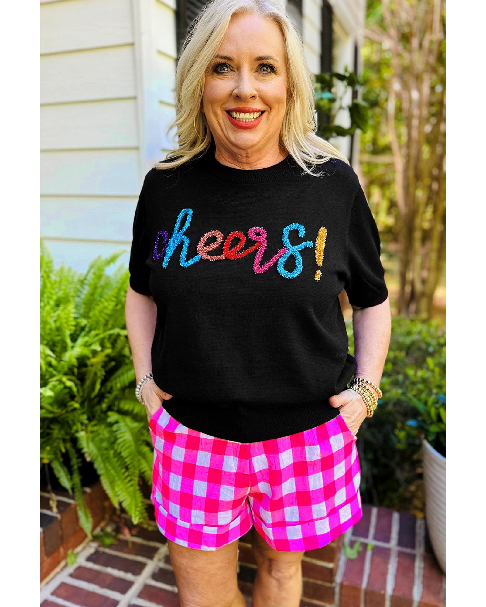 Black Plus Size Cheers Glitter Tinsel Short Sleeve Sweater – 3X