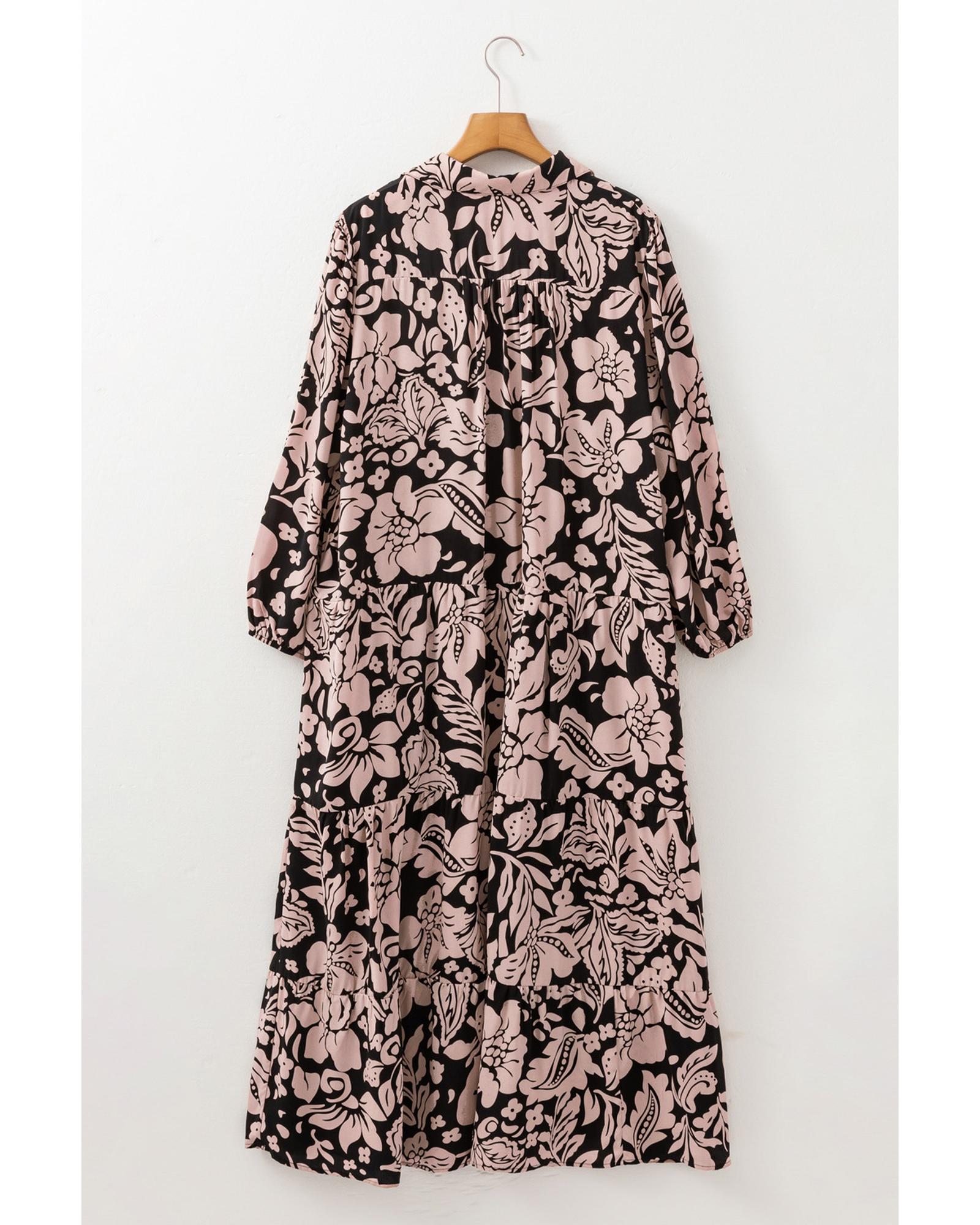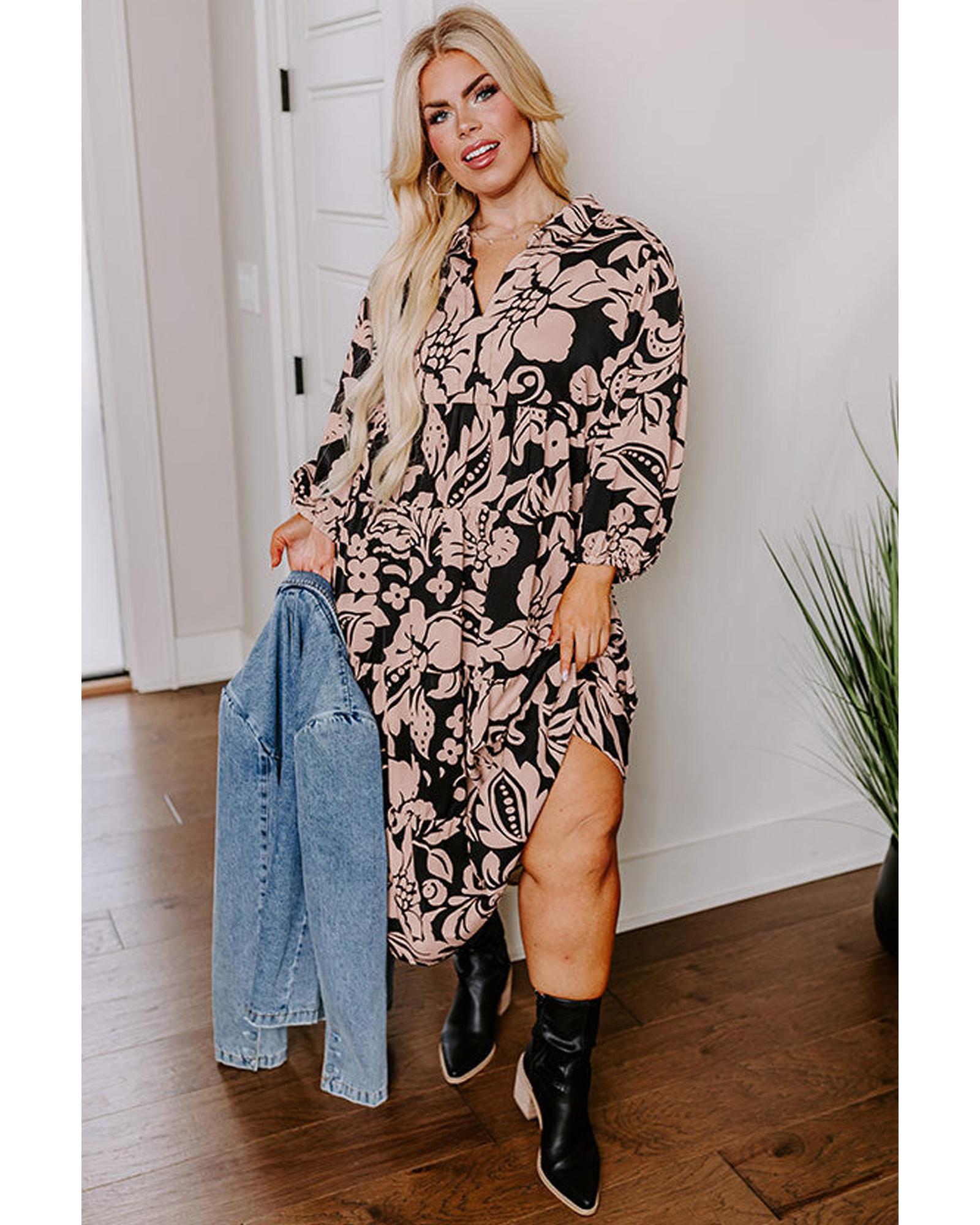 - Black Plus Size Floral Printed Puff Sleeve Collared Maxi Dress