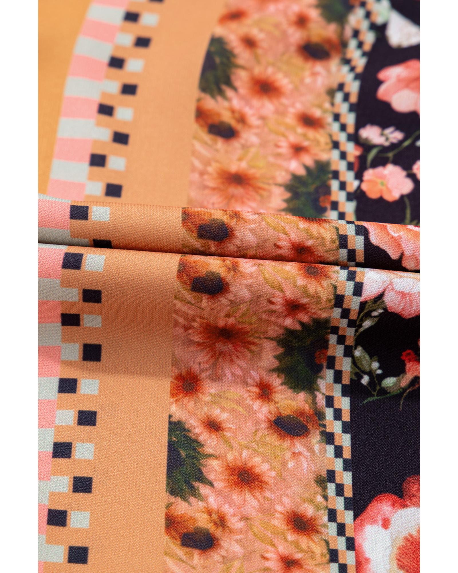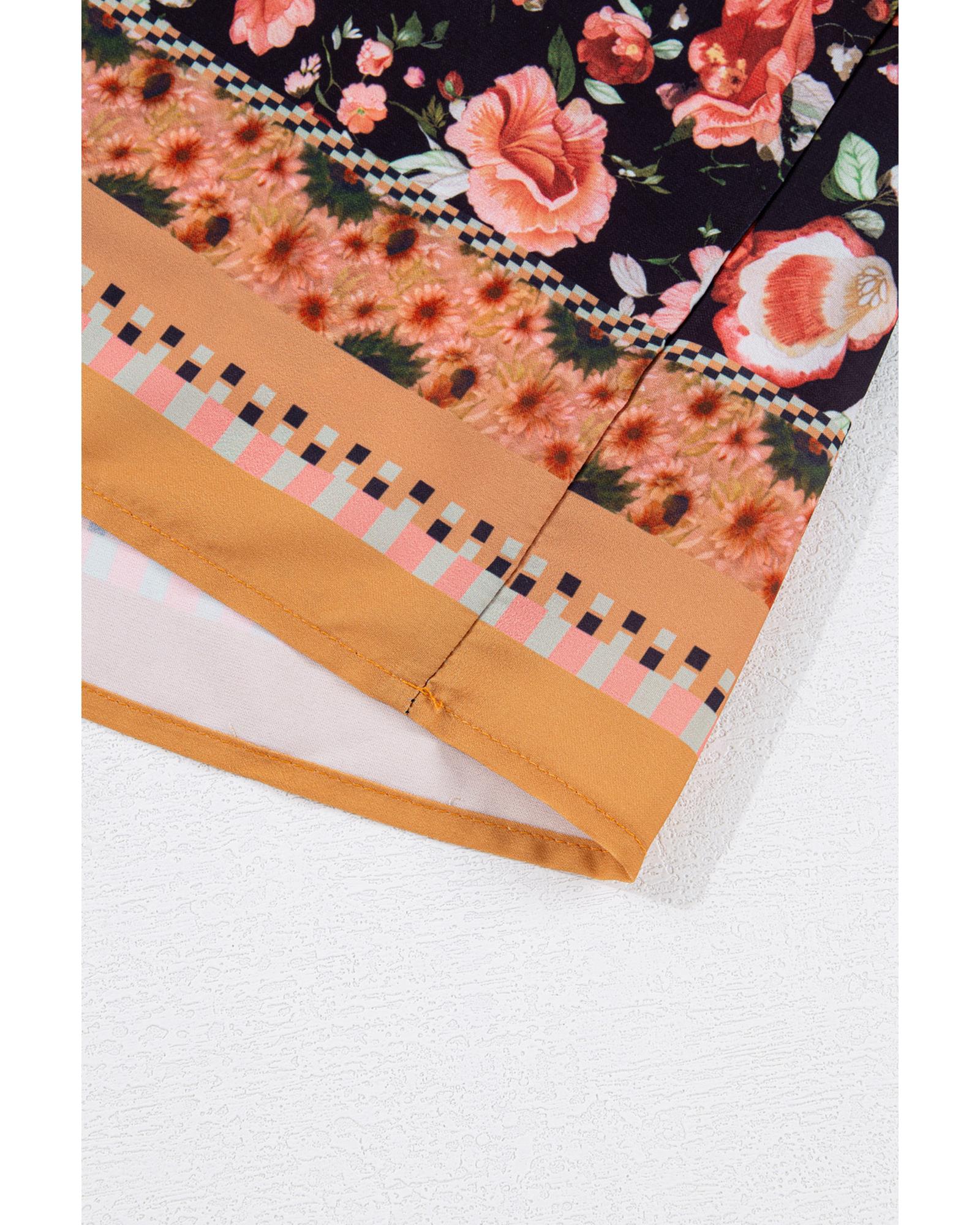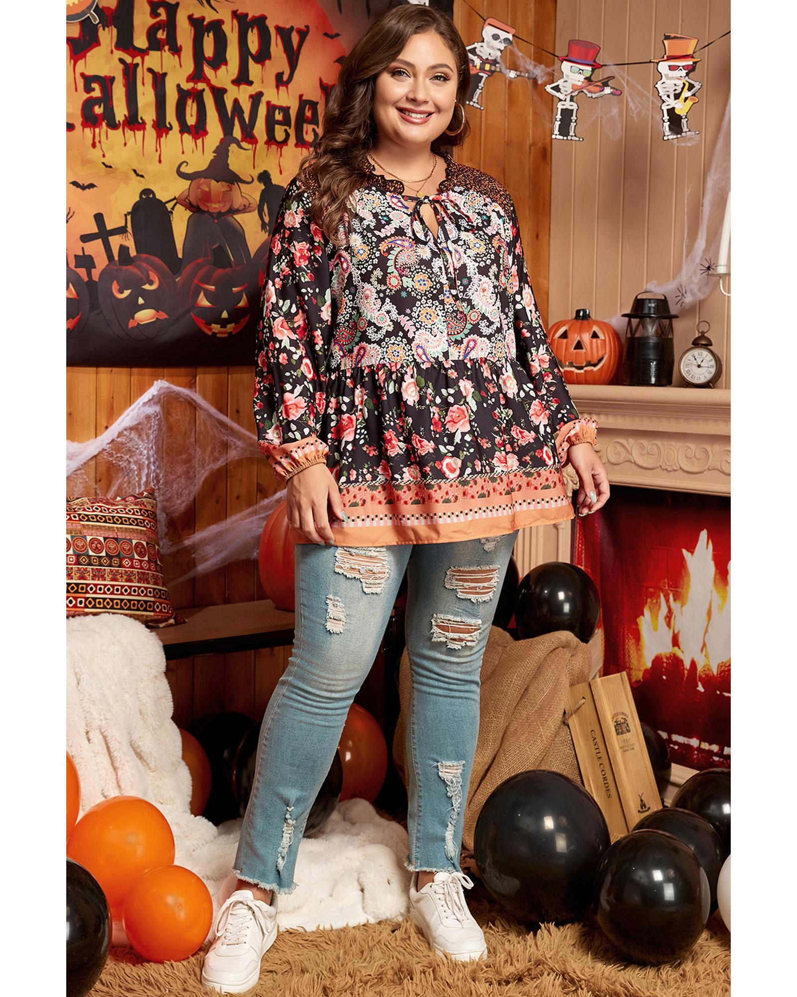 Black Plus Size Paisley Floral Print V Neck Bubble Sleeve Blouse – 1X