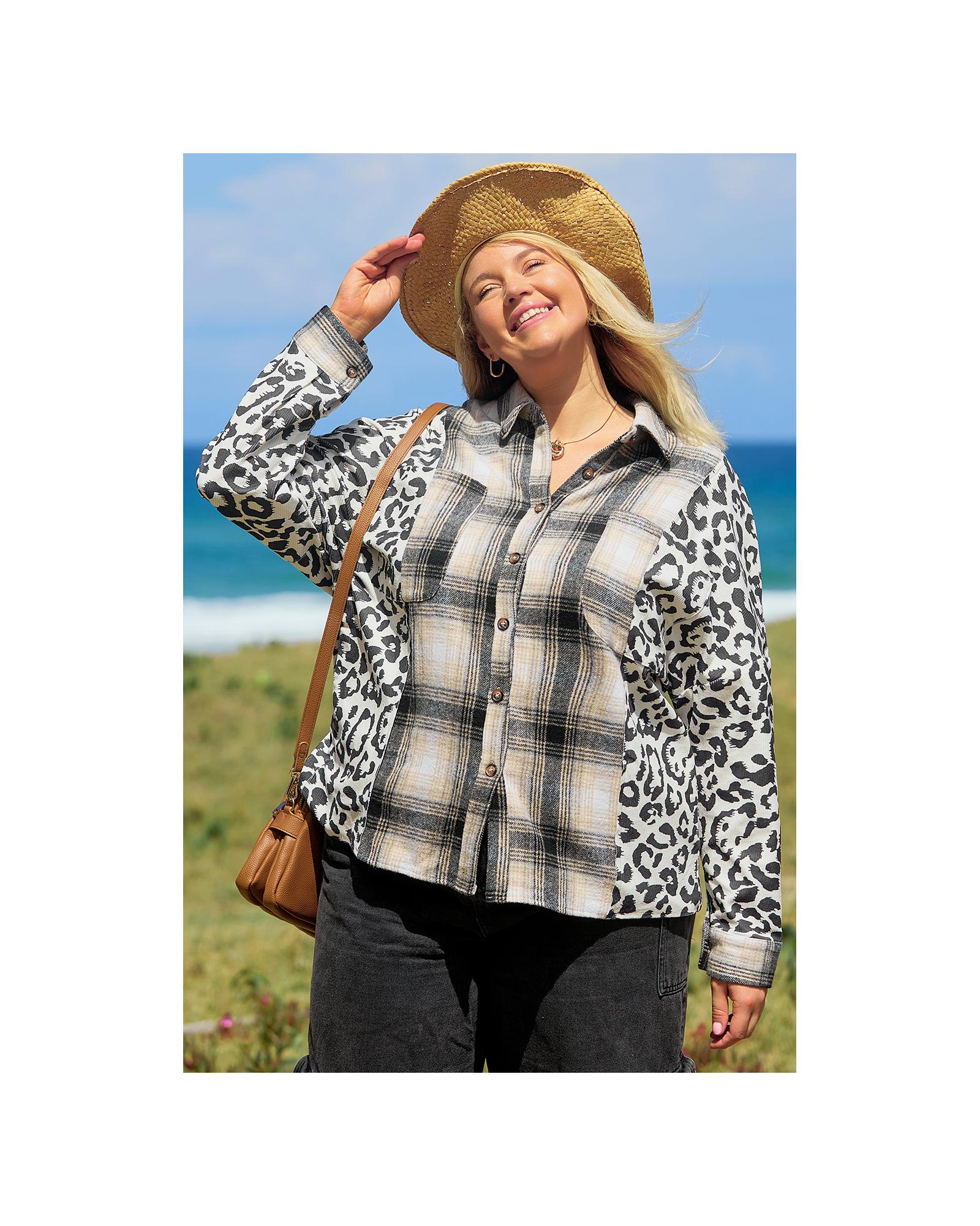 Black Plus Size Plaid Leopard Printed Patchwork Button Up Shacket – 3X