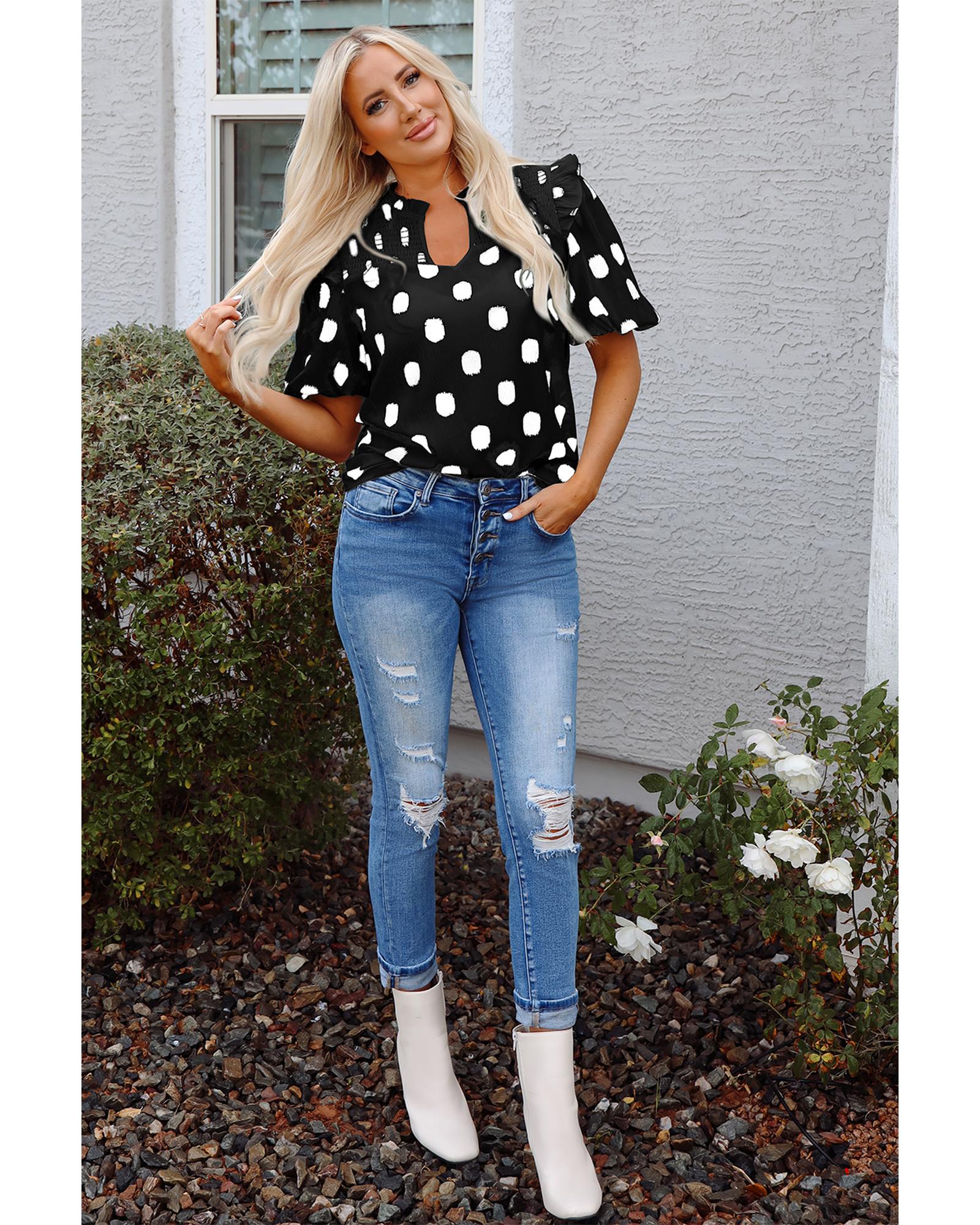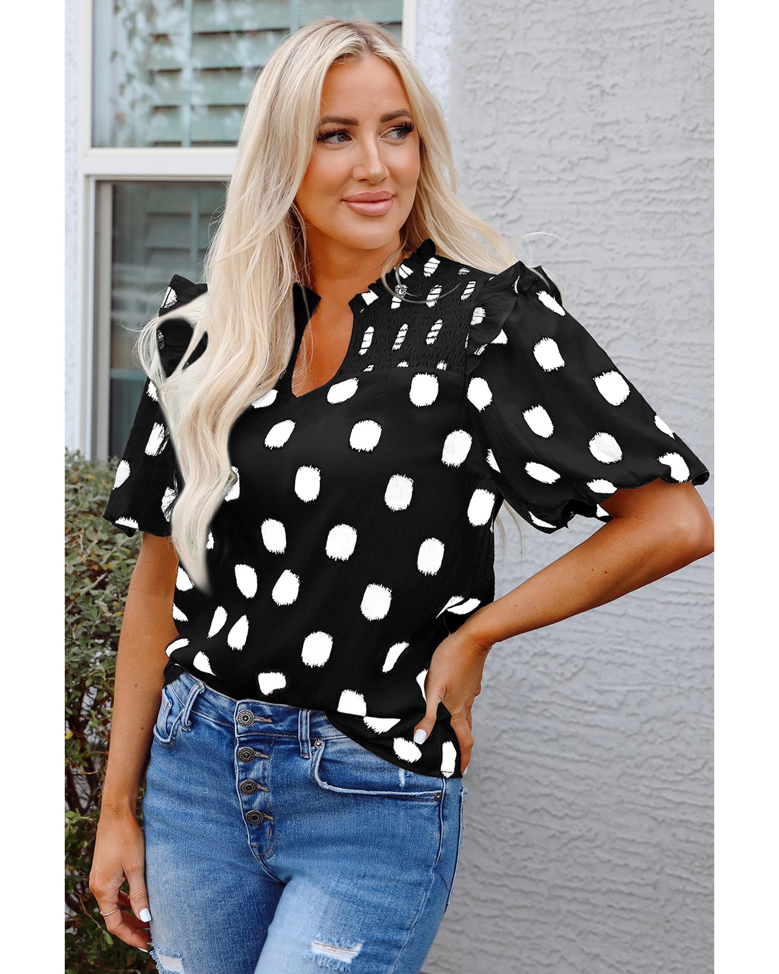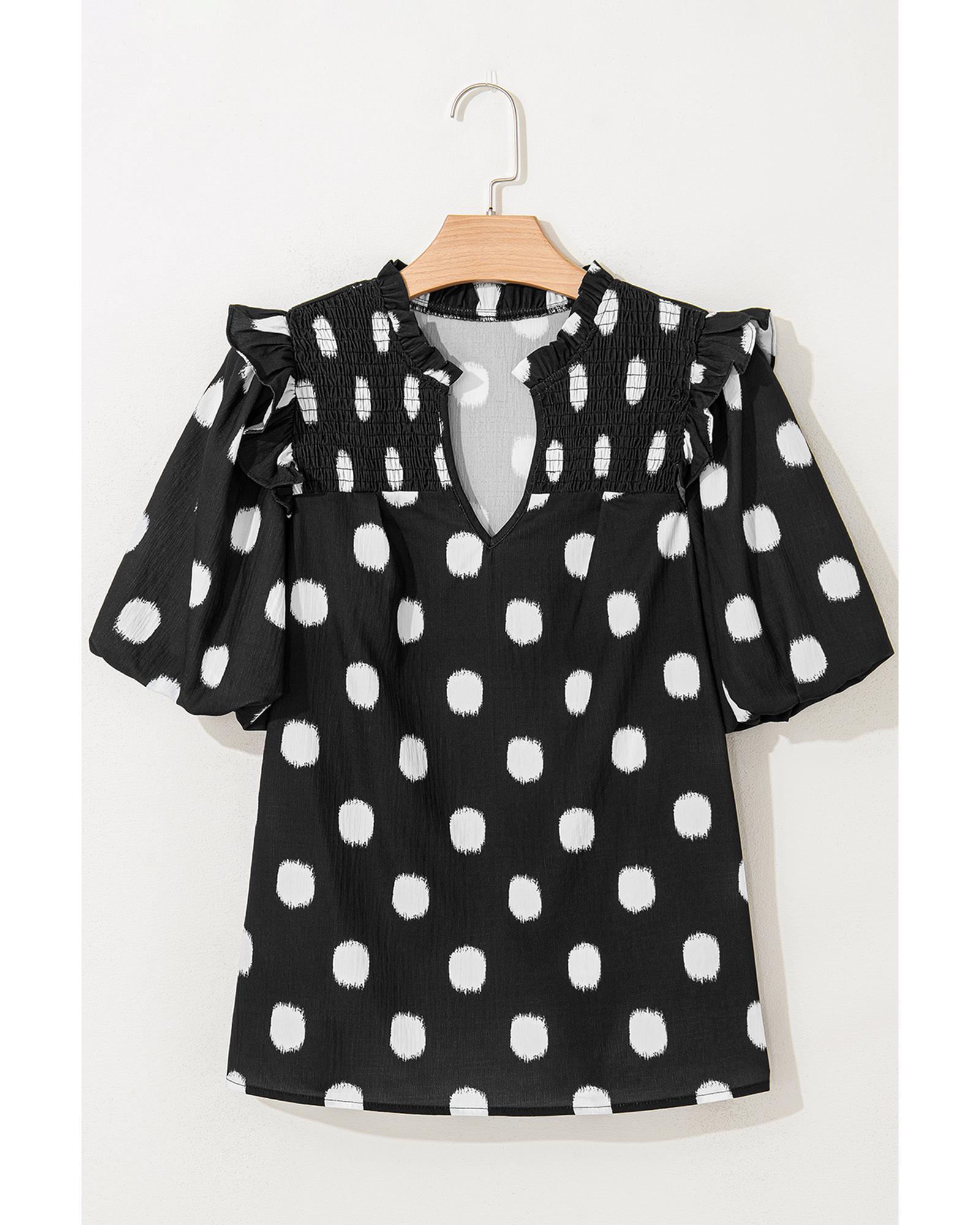 Black Polka Dot Print Shirred Yoke Notched Neck Balloon Sleeve Blouse – M