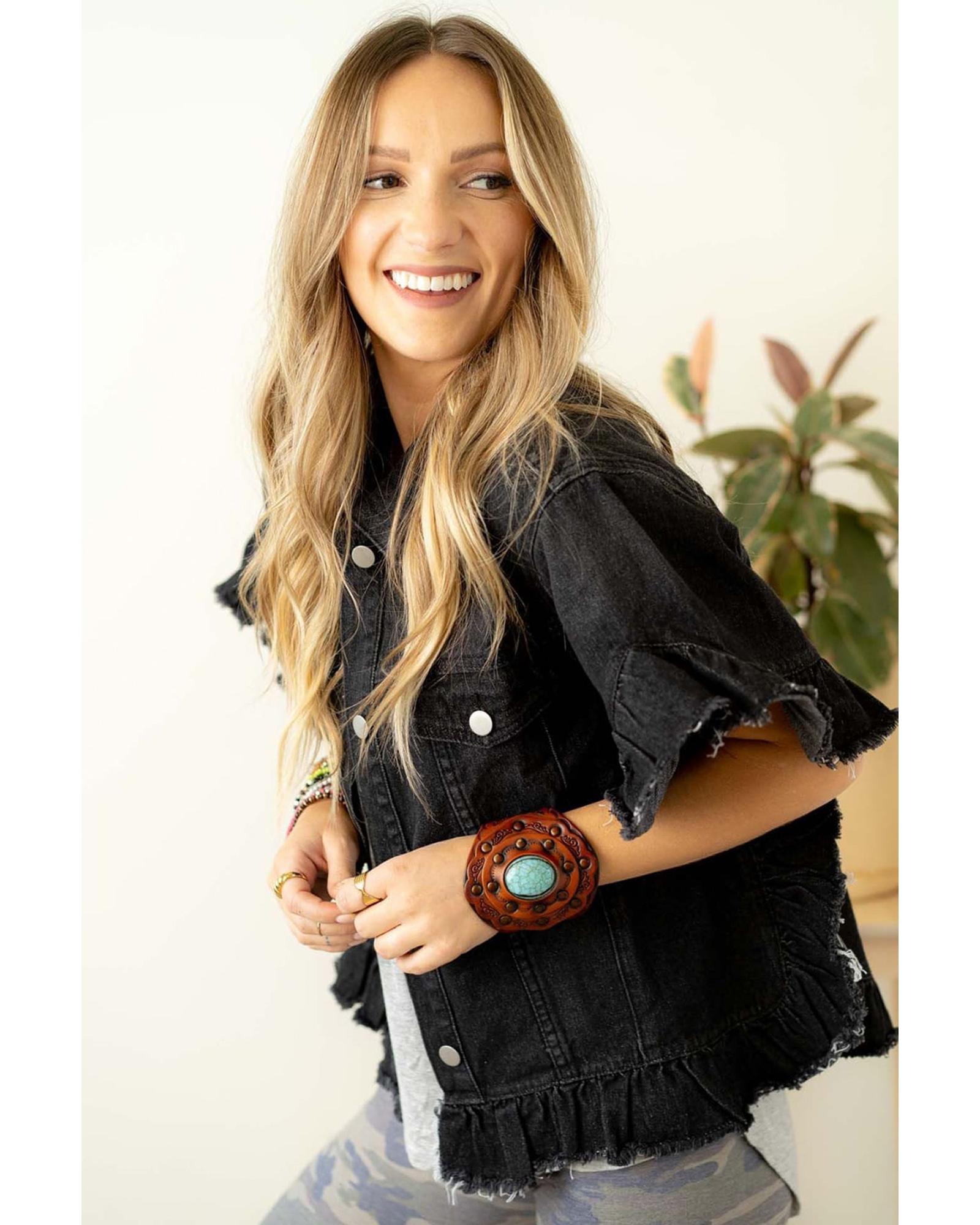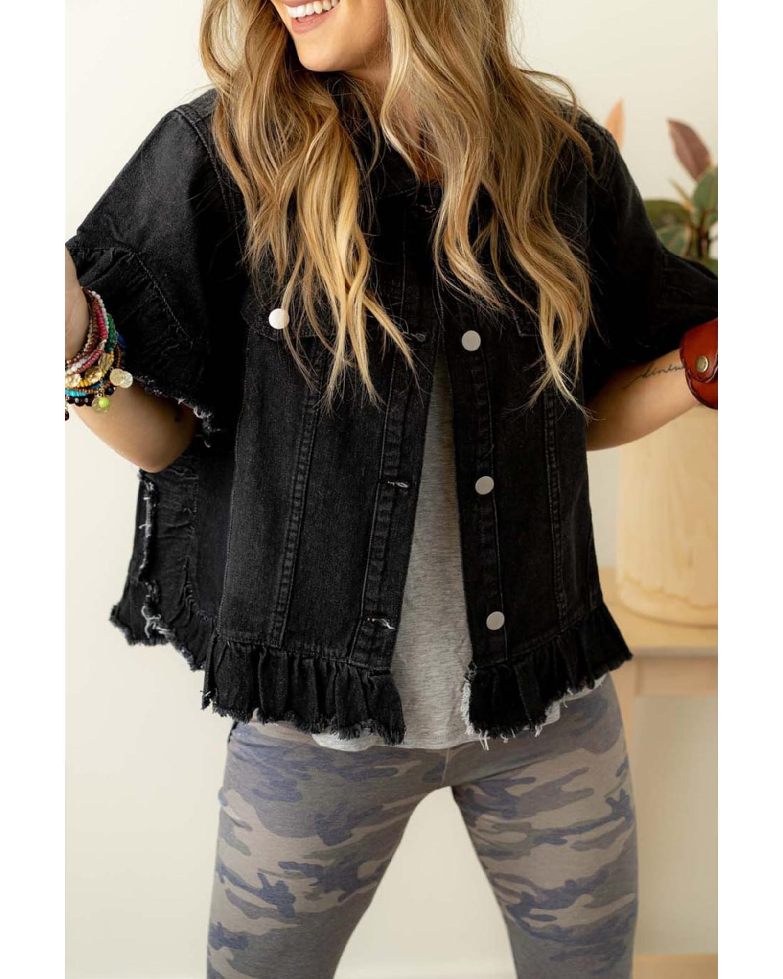 Black Raw Edge Ruffled Short Sleeve Denim Jacket – L