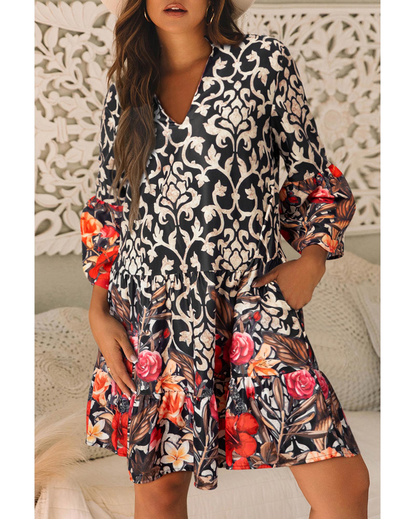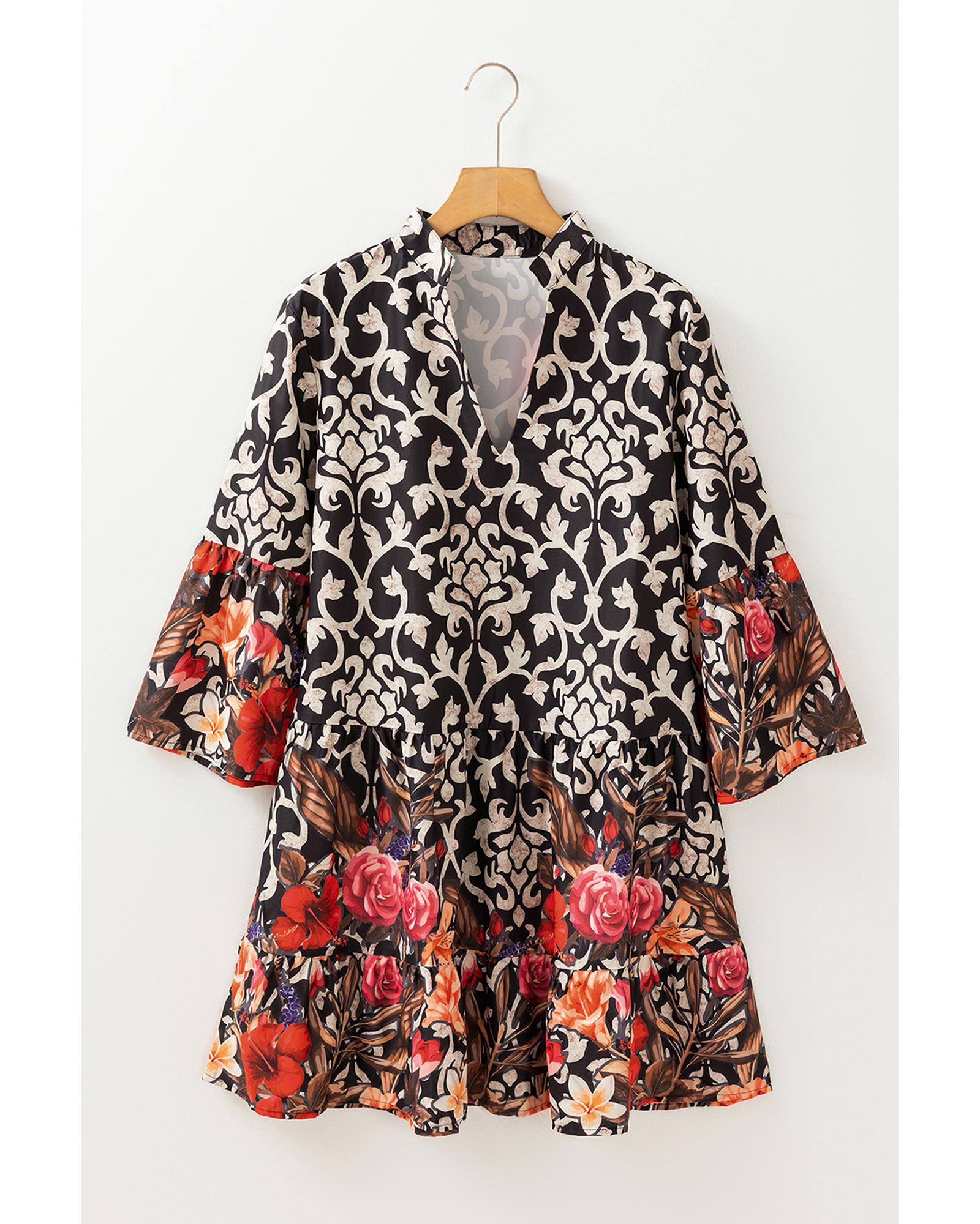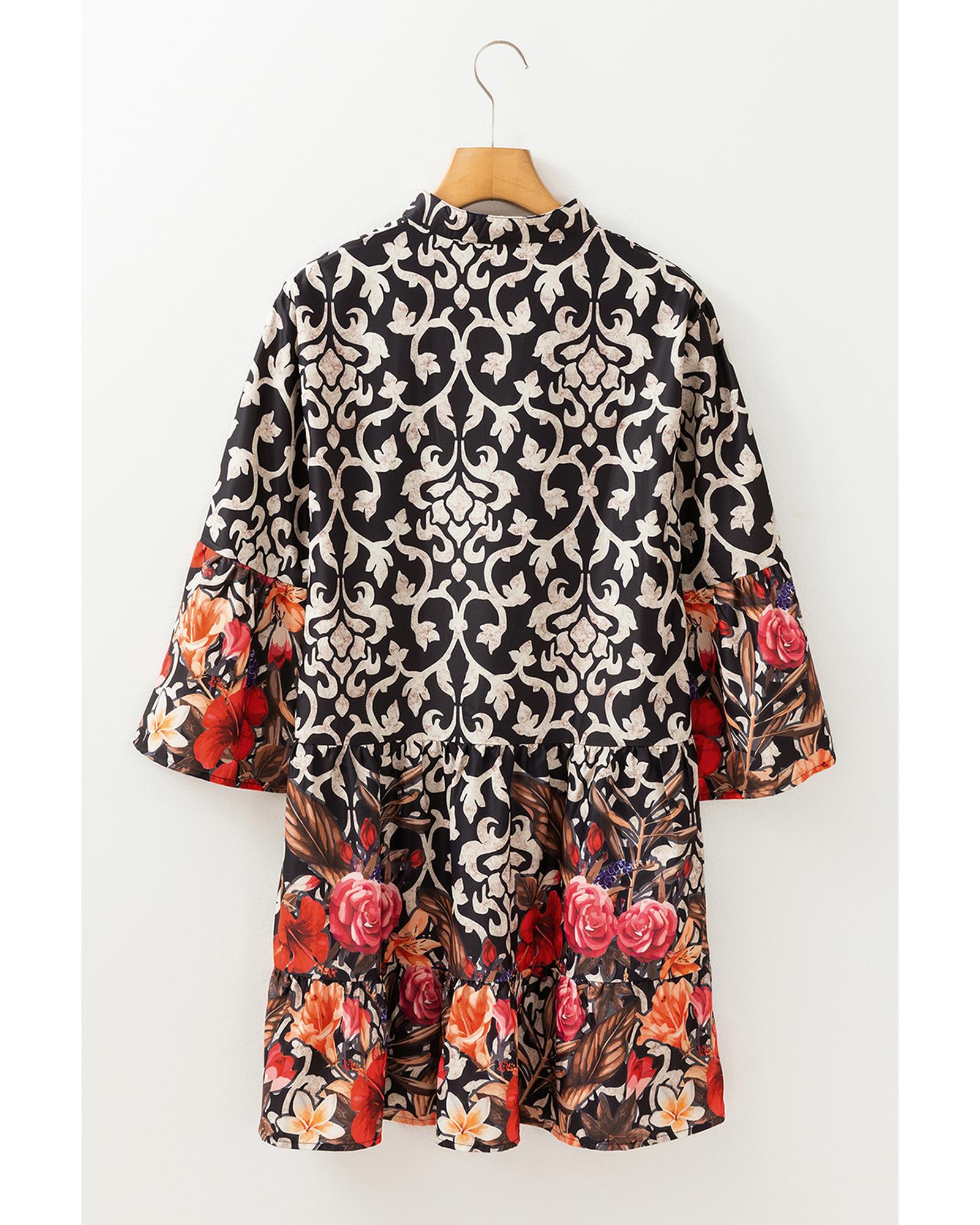 Black Retro Floral Mixed Print Split Neck A-line Dress – M