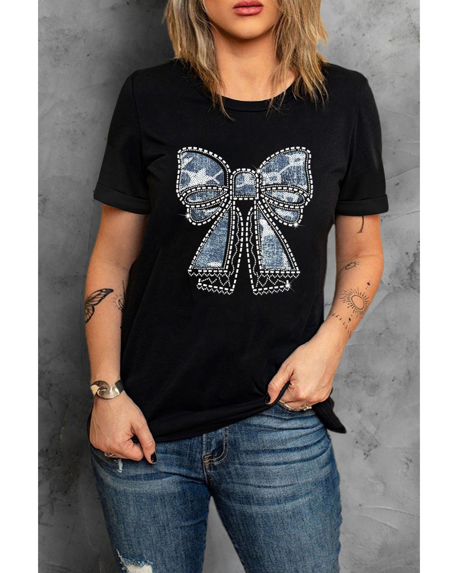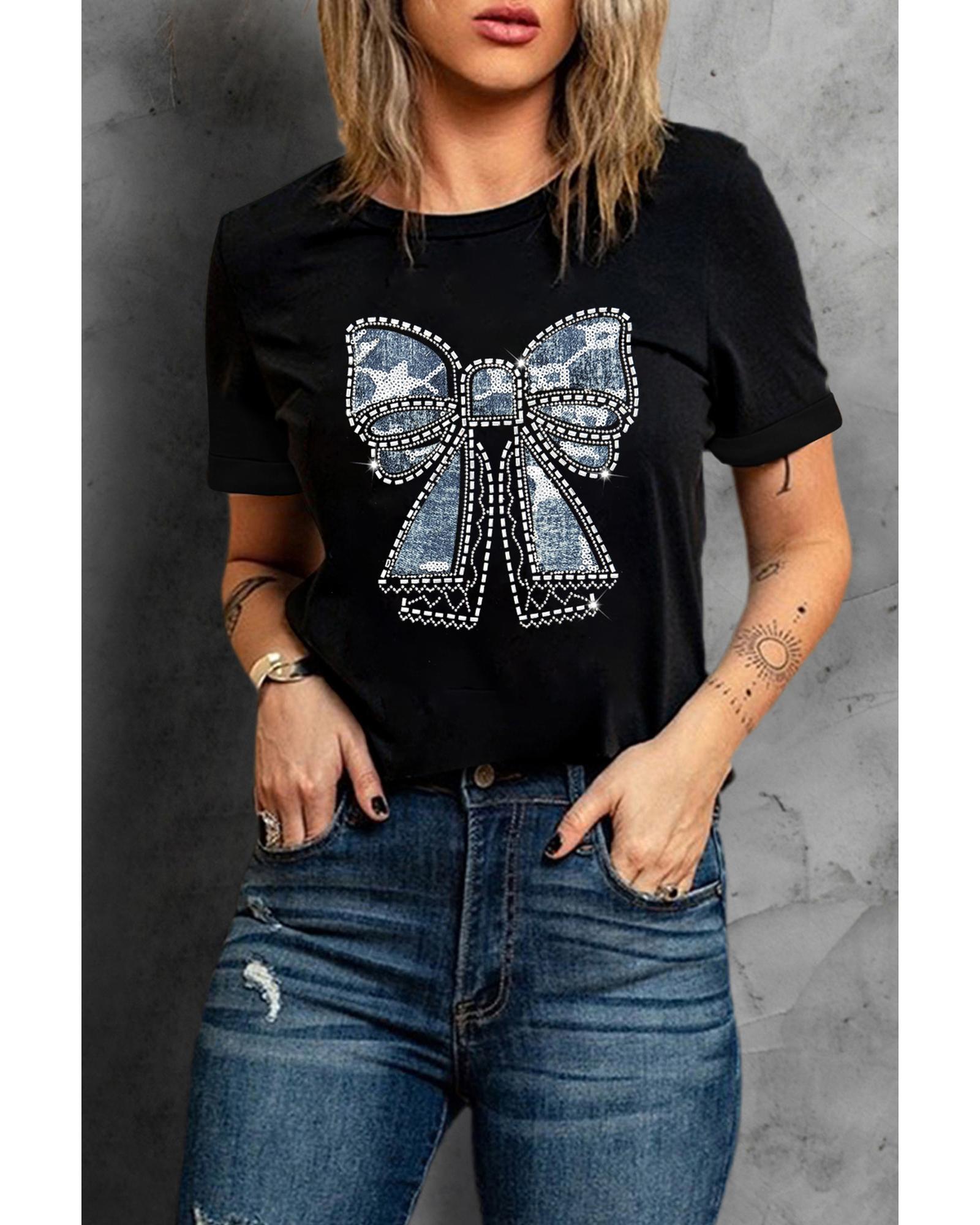 • Black Rhinestone Bowknot Graphic Crewneck T Shirt