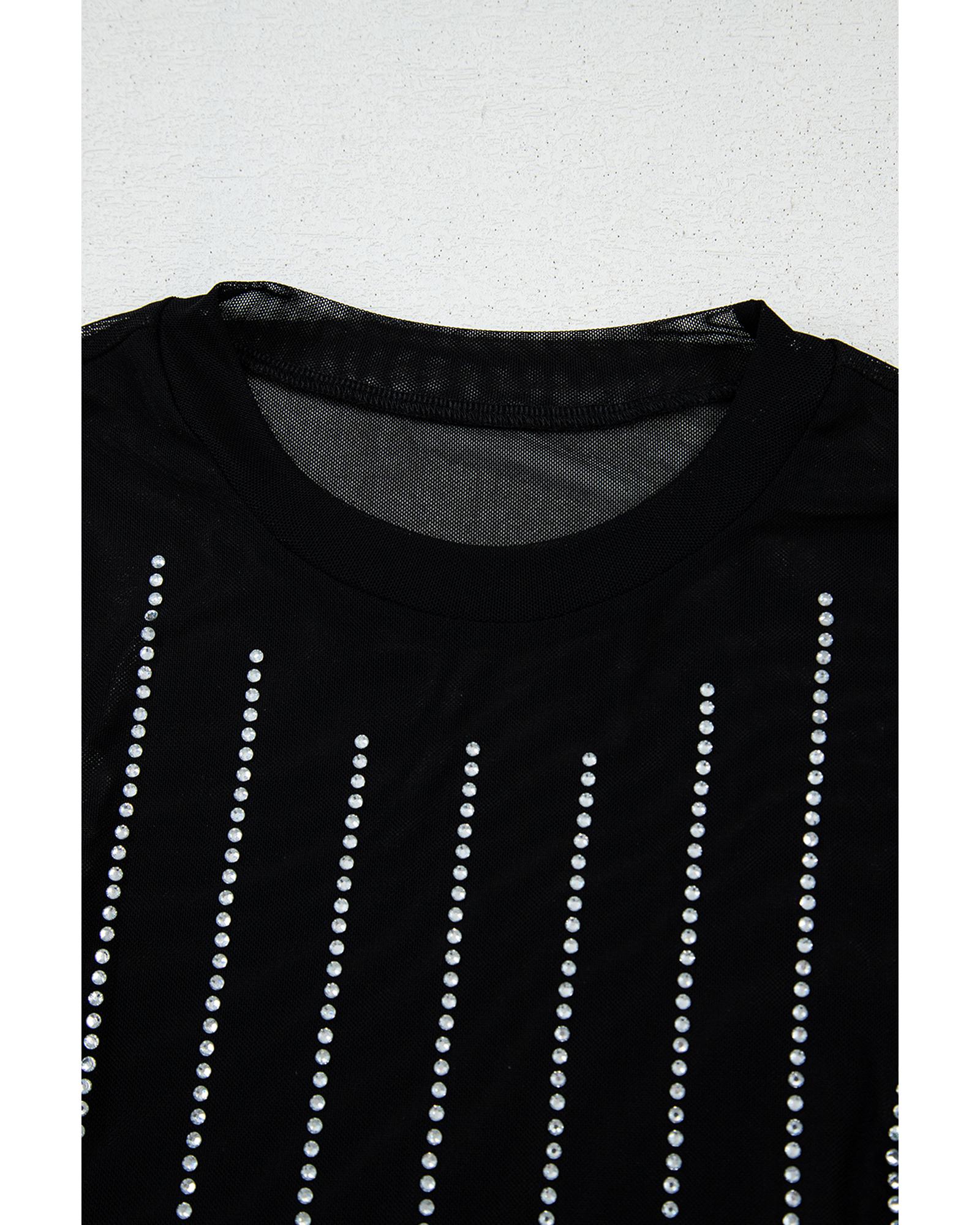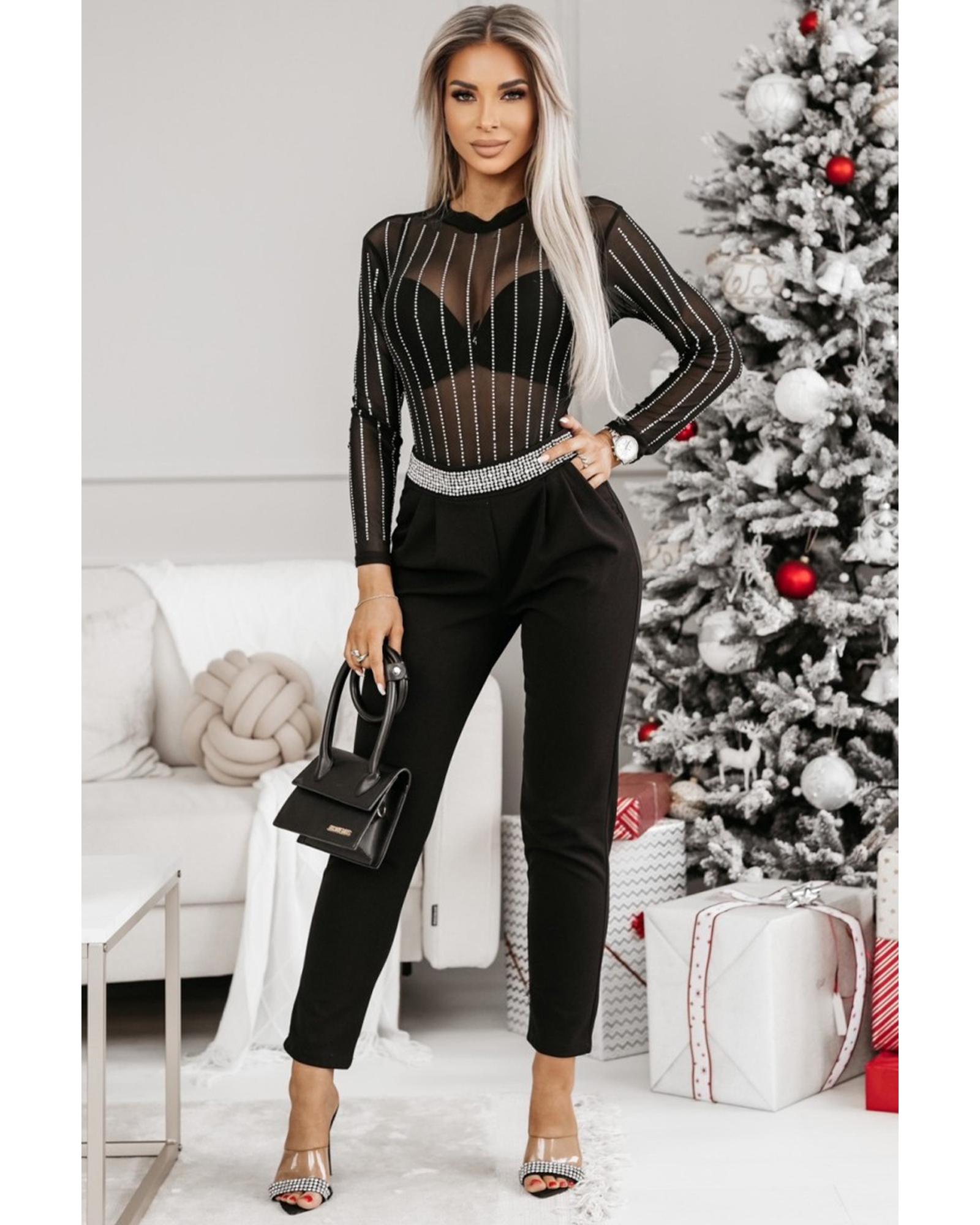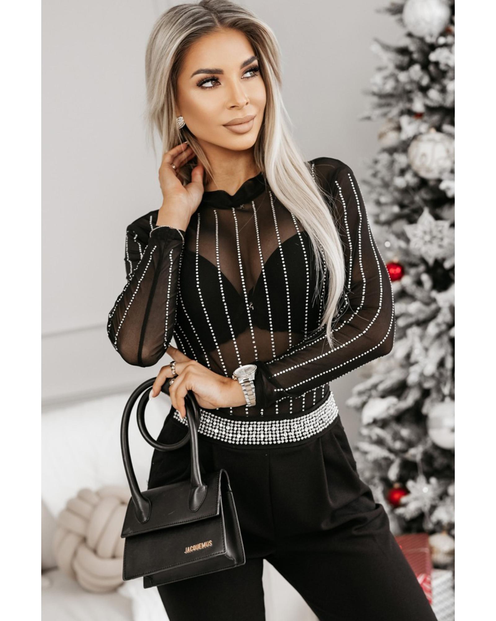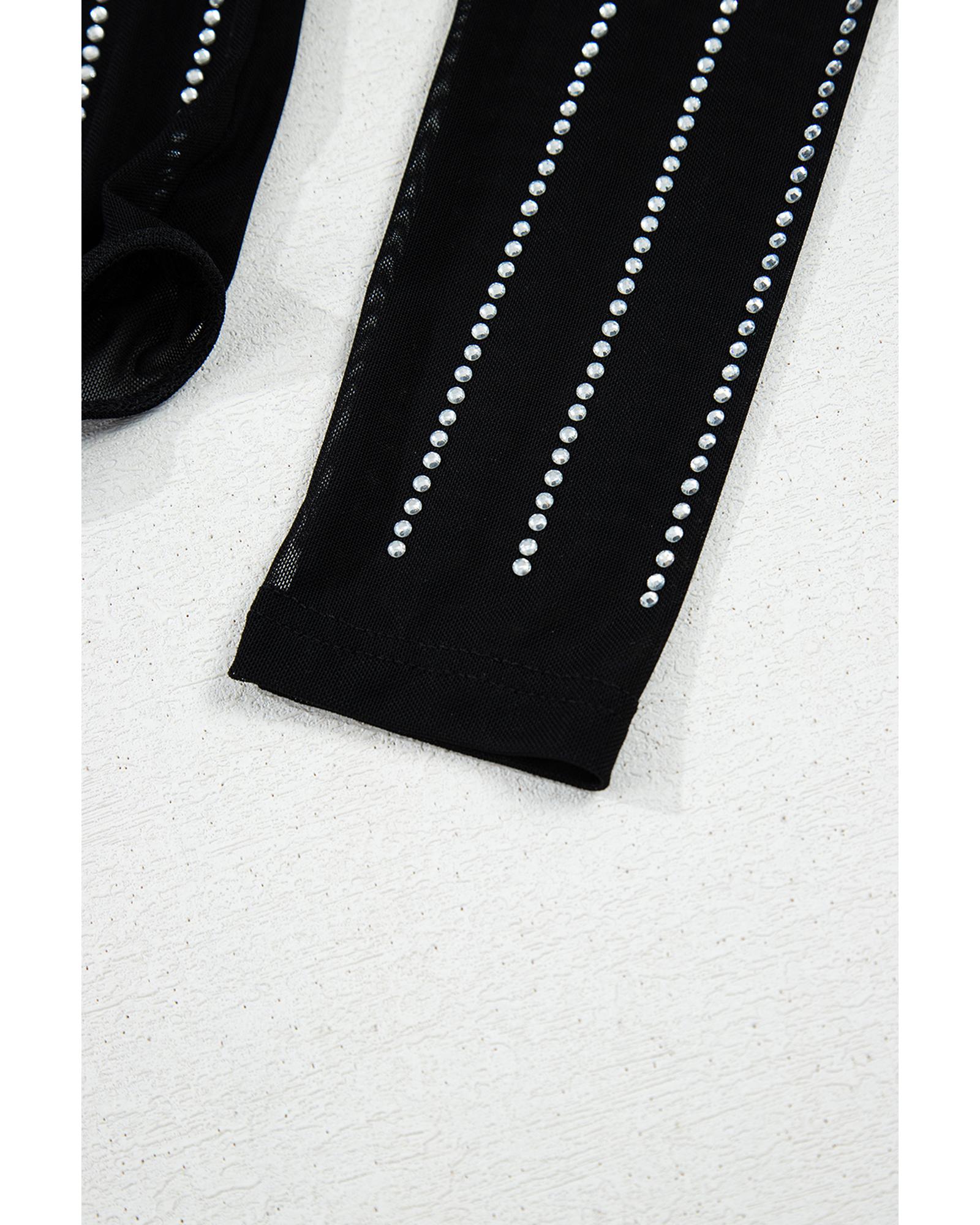 Black Rhinestone Decor Striped Mesh Long Sleeve Bodysuit – S