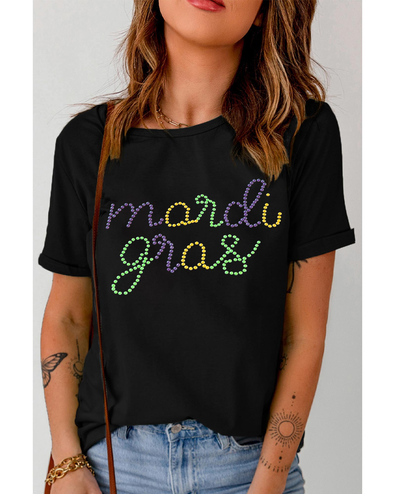 Black Rhinestone Mardi Gras Letter Graphic T Shirt – S