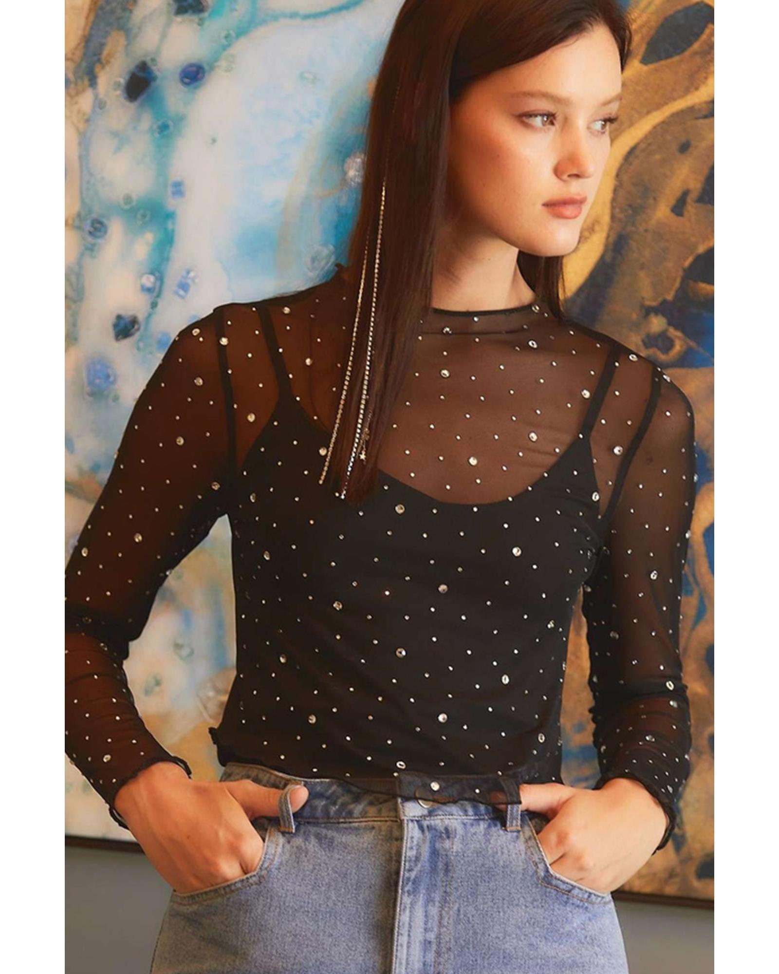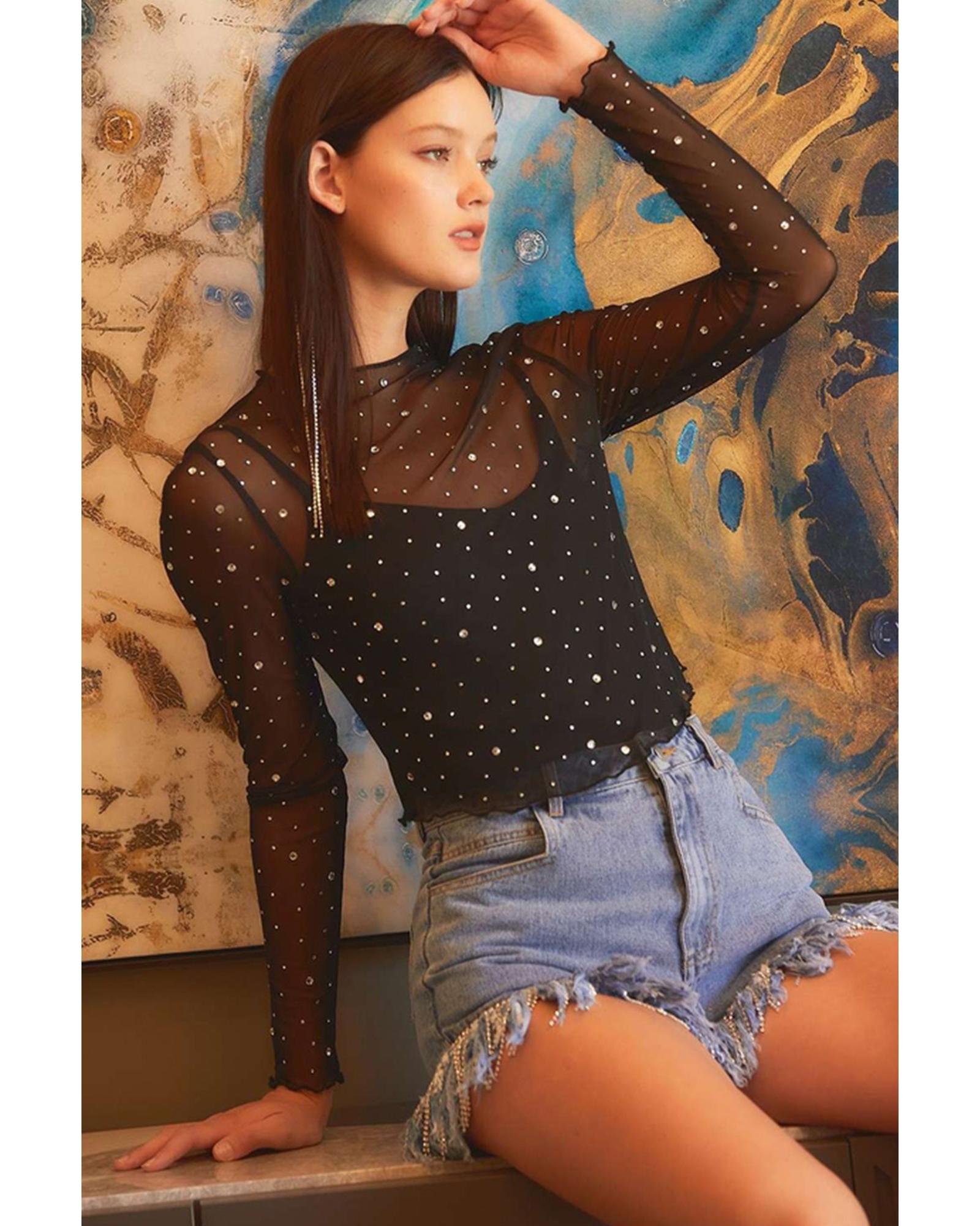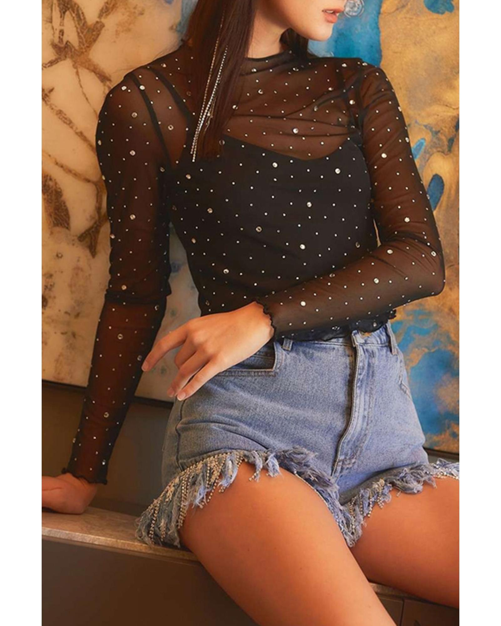 - Black Rhinestone Sheer Mesh Slim Fit Long Sleeve Top