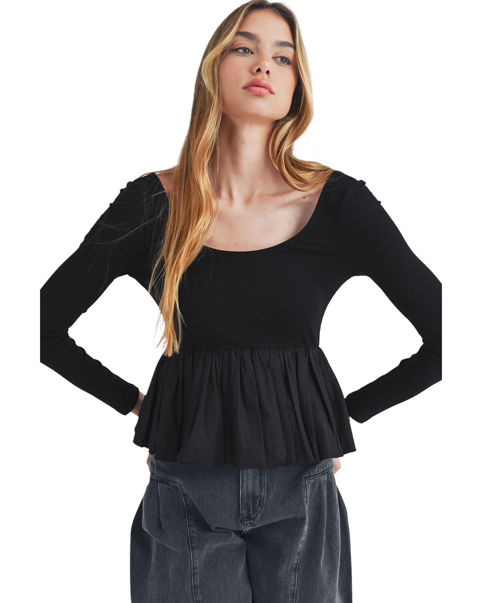 Black Ribbed Knit Long Sleeve Scoop Neck Peplum Patchwork Top – XL