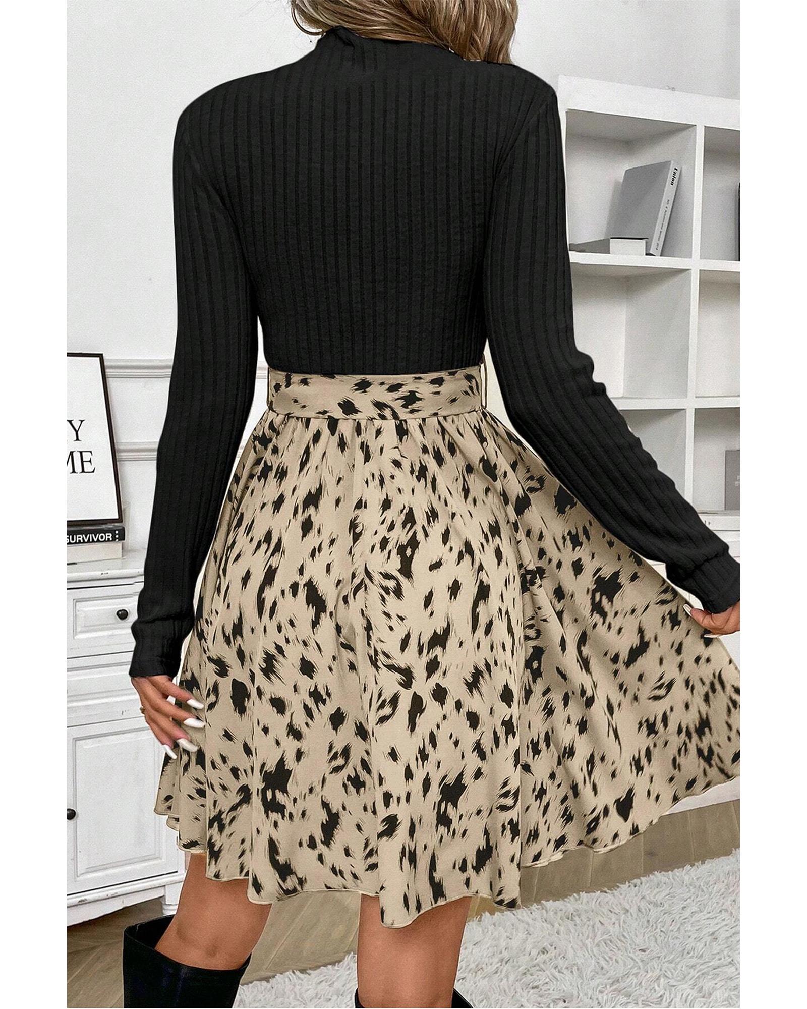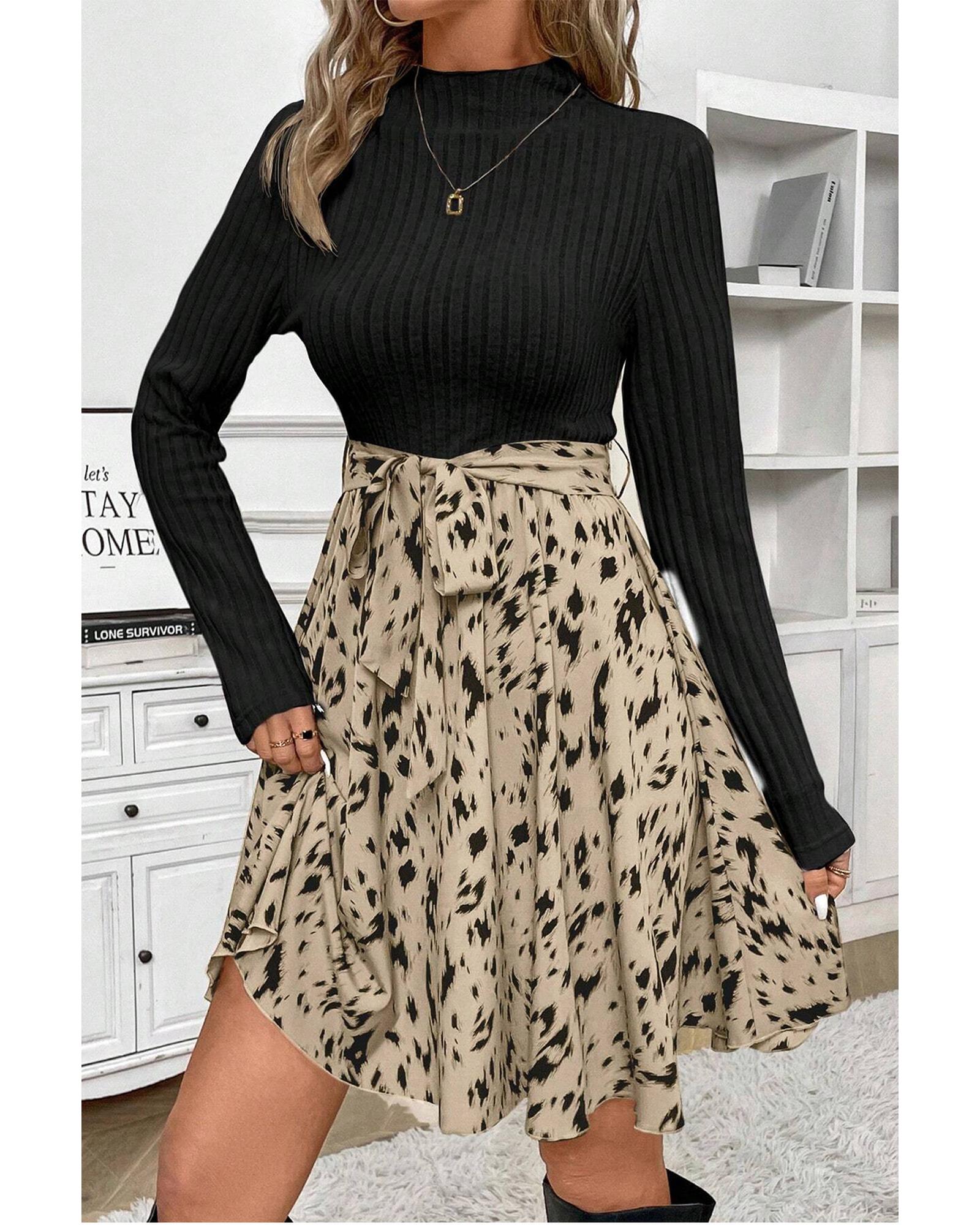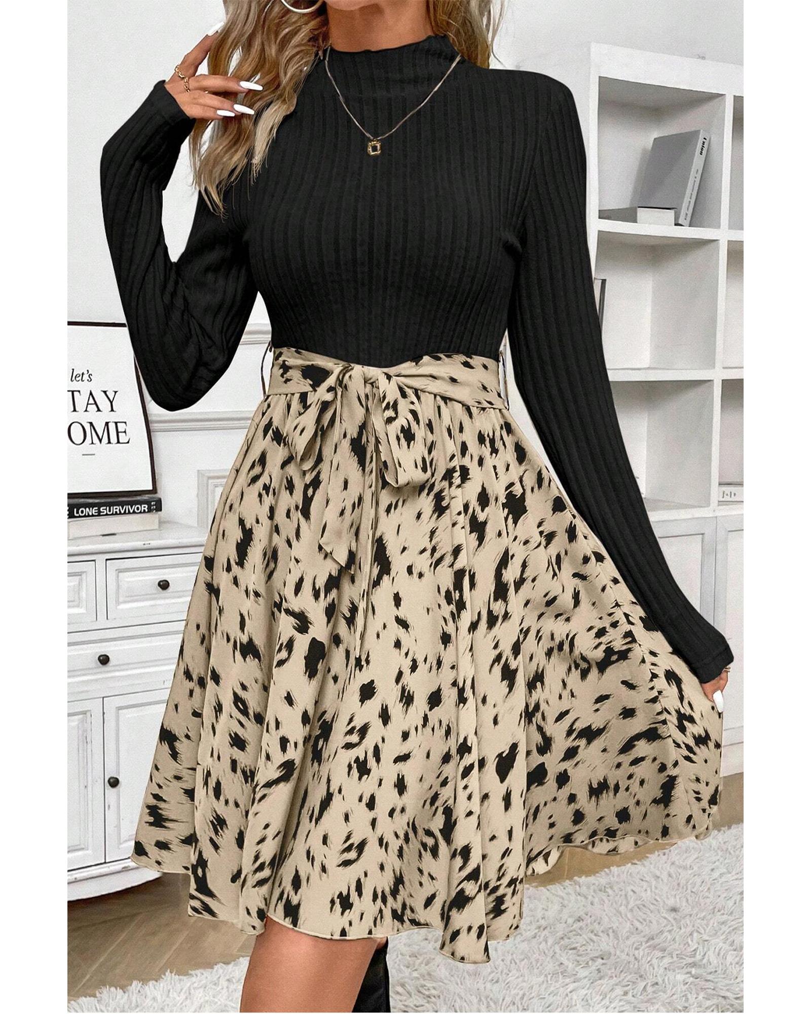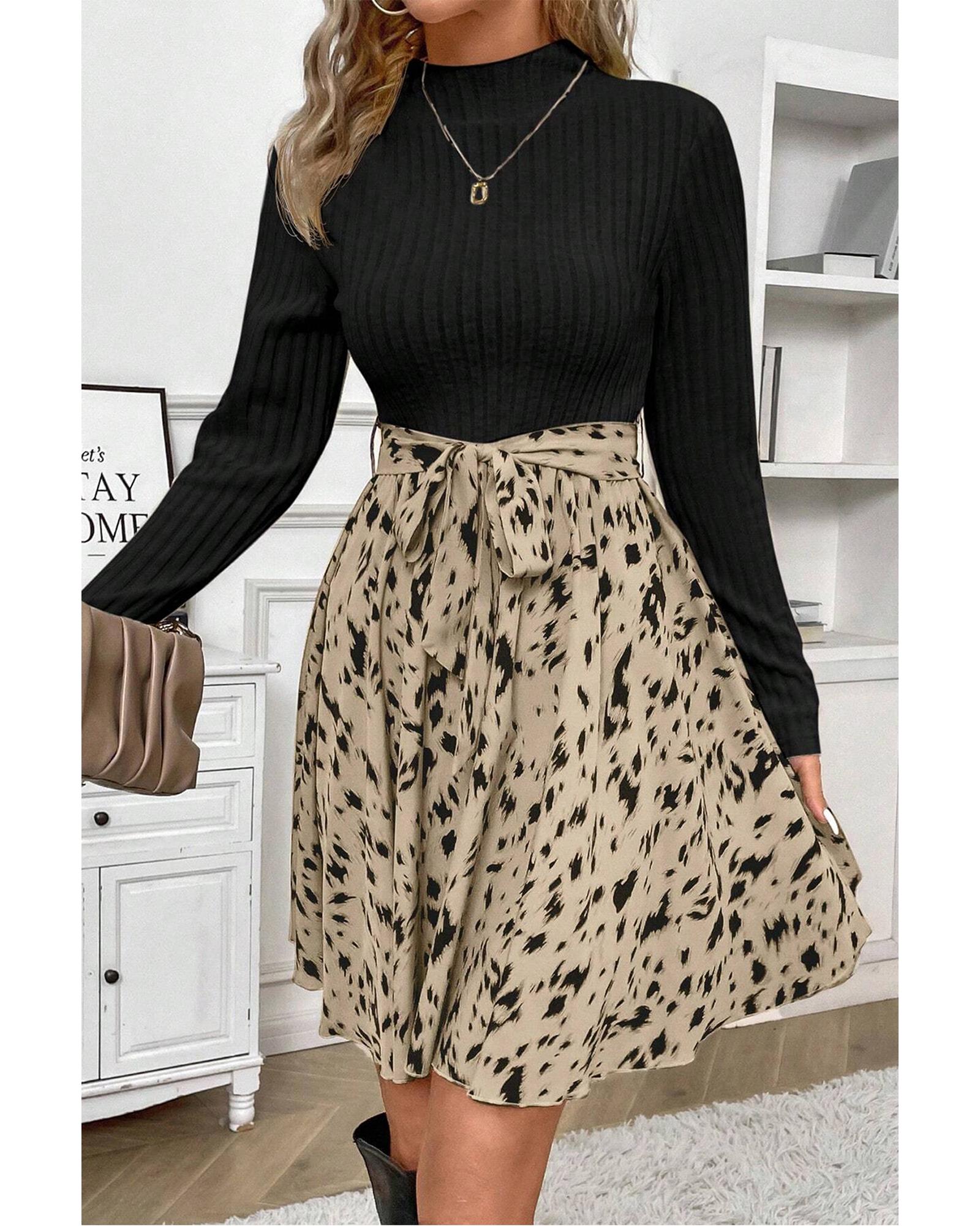 Black Ribbed Knit Patchwork Printed Belted A-line Dress – XL