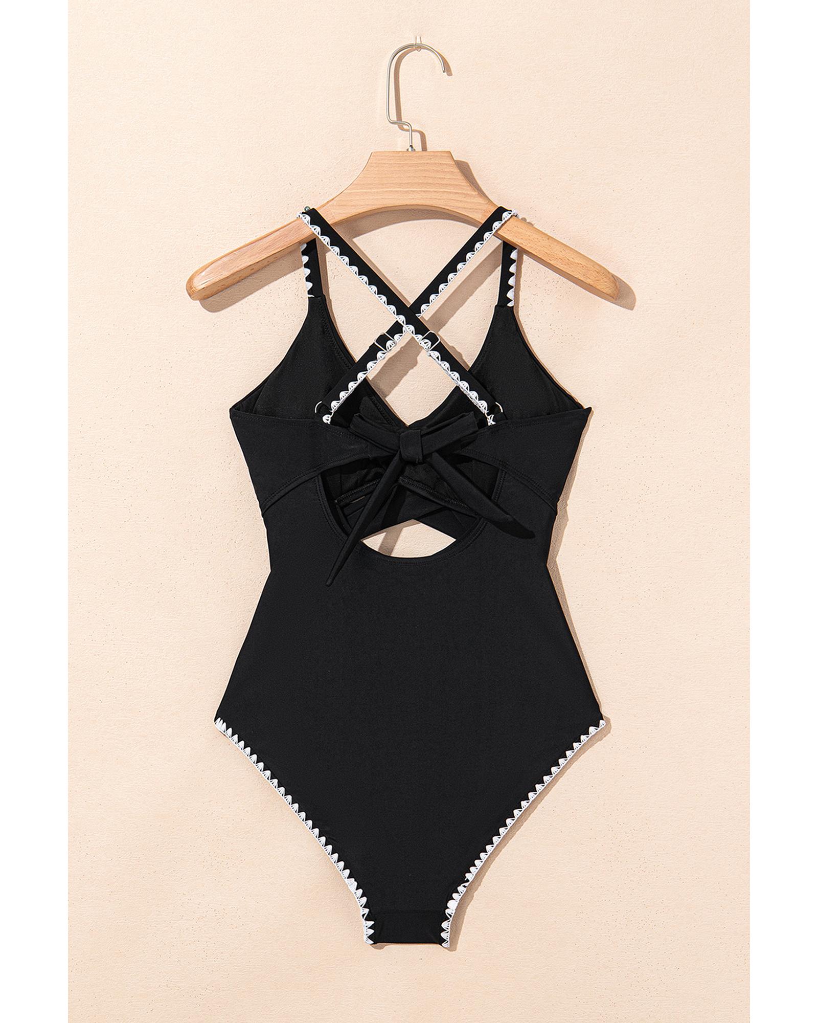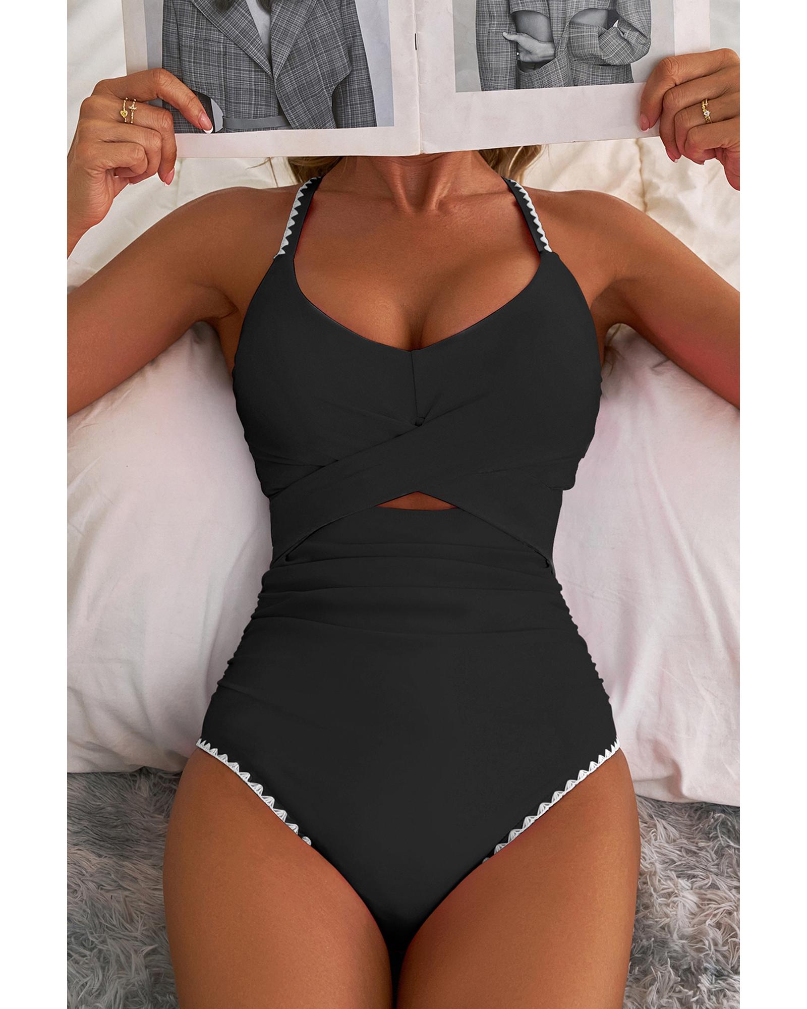 Black Ric Rac Trim Contrasted Patchwork Cutout One Piece Swimsuit – L