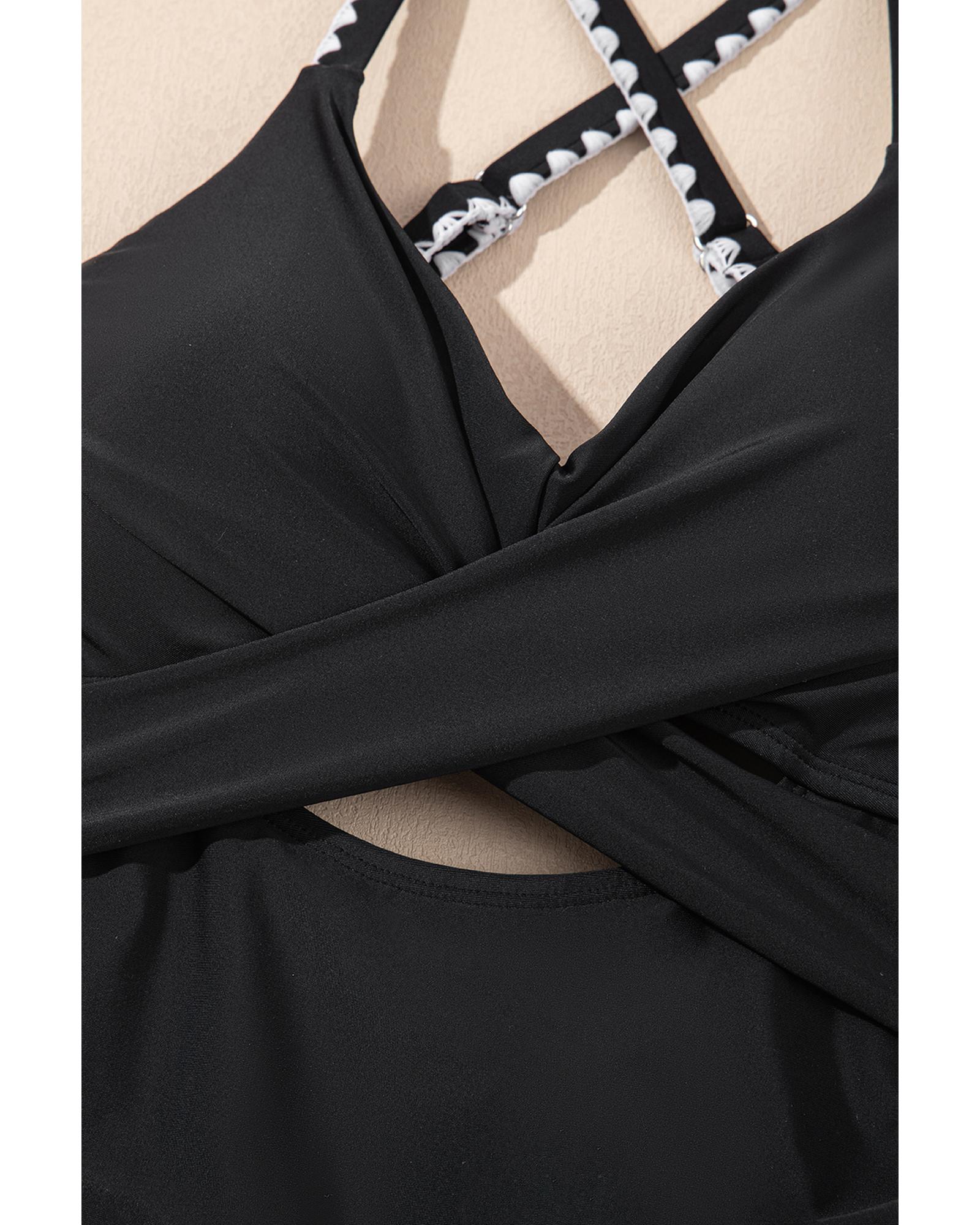 Black Ric Rac Trim Contrasted Patchwork Cutout One Piece Swimsuit – M