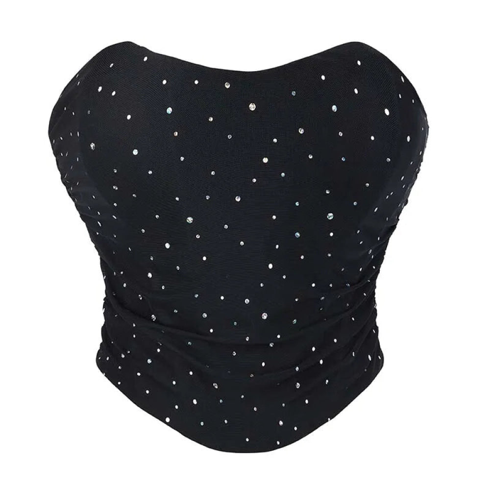 • 1 x Black Ruched Hem Corset Crop Top For Plus Size Women Back Lace Tight Fit Sequined Detailing S-Xxl