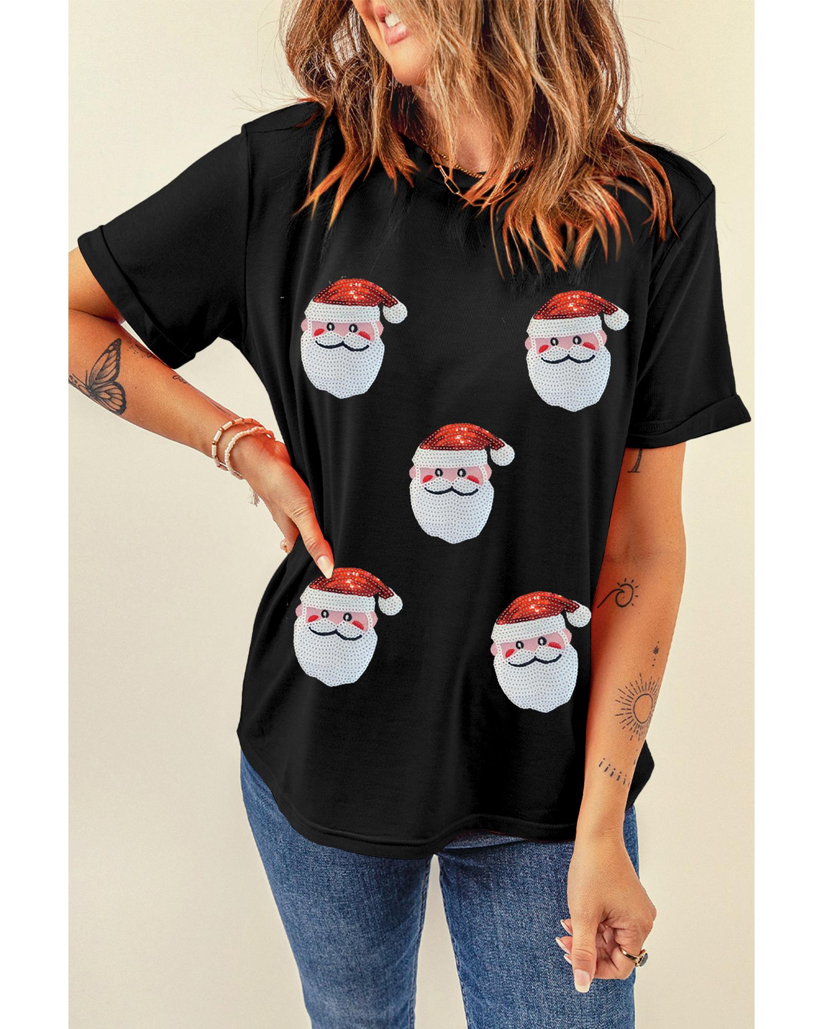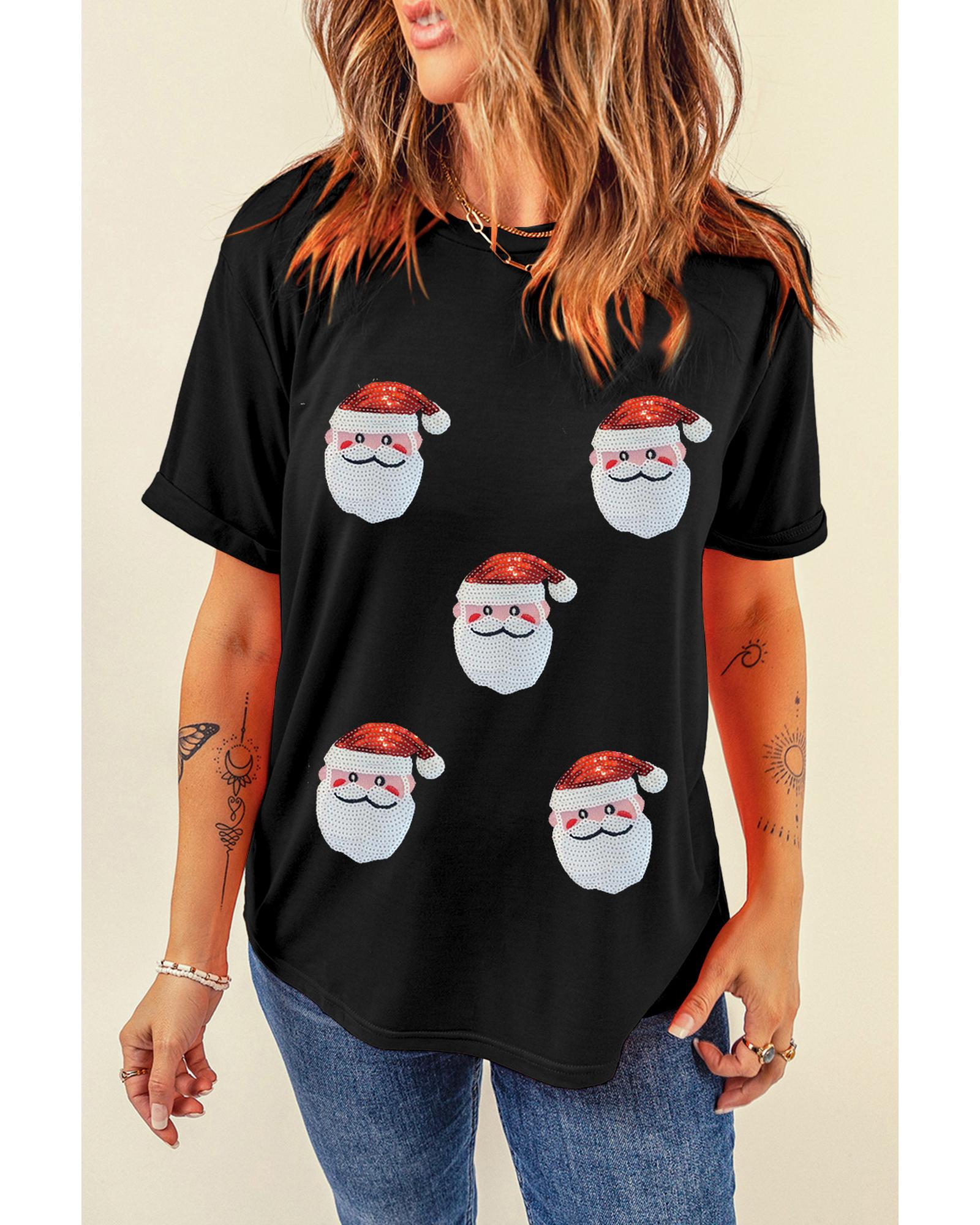 • Festive Black Sequin Christmas Claus Pattern Crewneck T Shirt