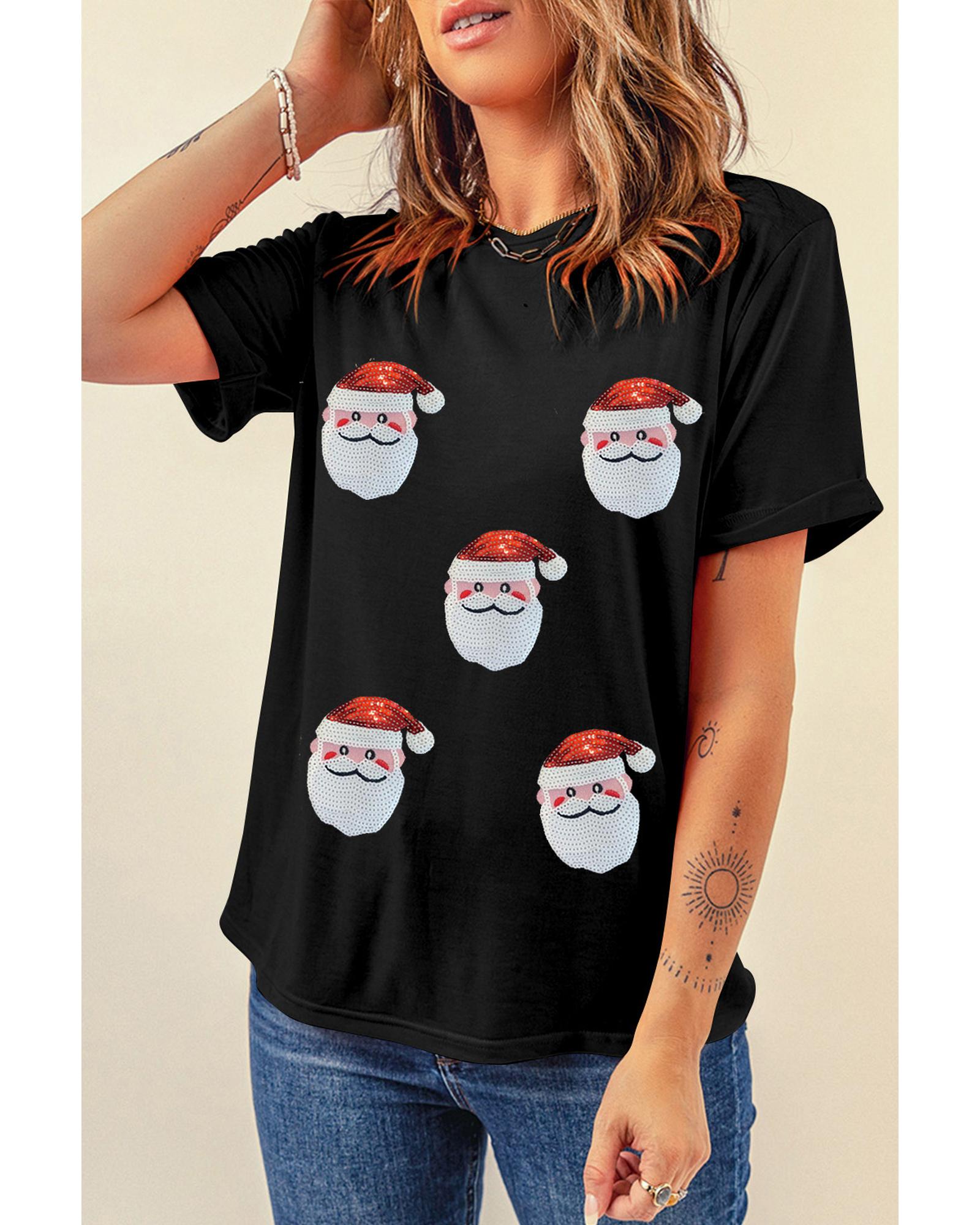- Festive Black Sequin Christmas Claus Pattern Crewneck T Shirt