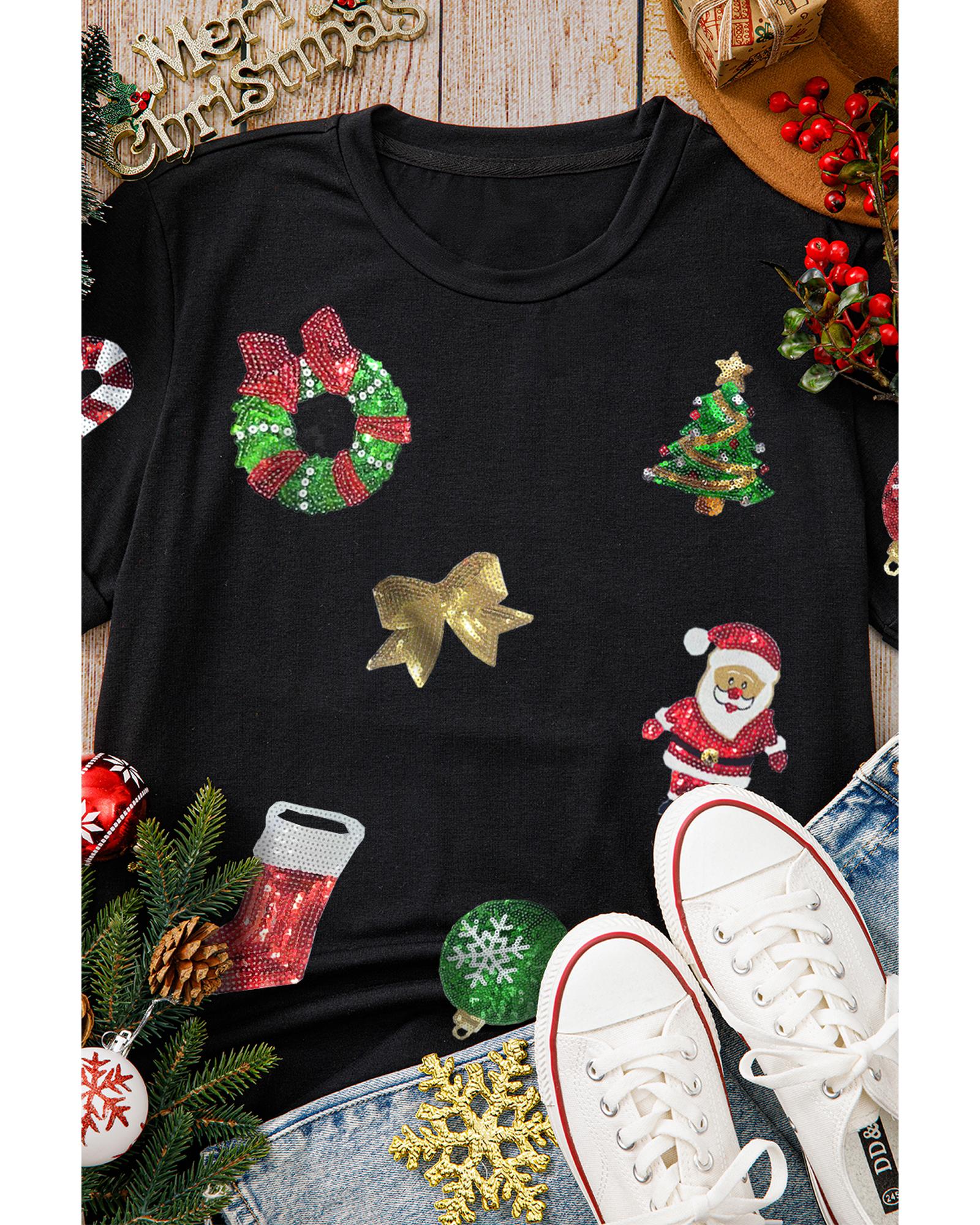 Black Sequin Christmas Essentials Graphic Crewneck T Shirt – L