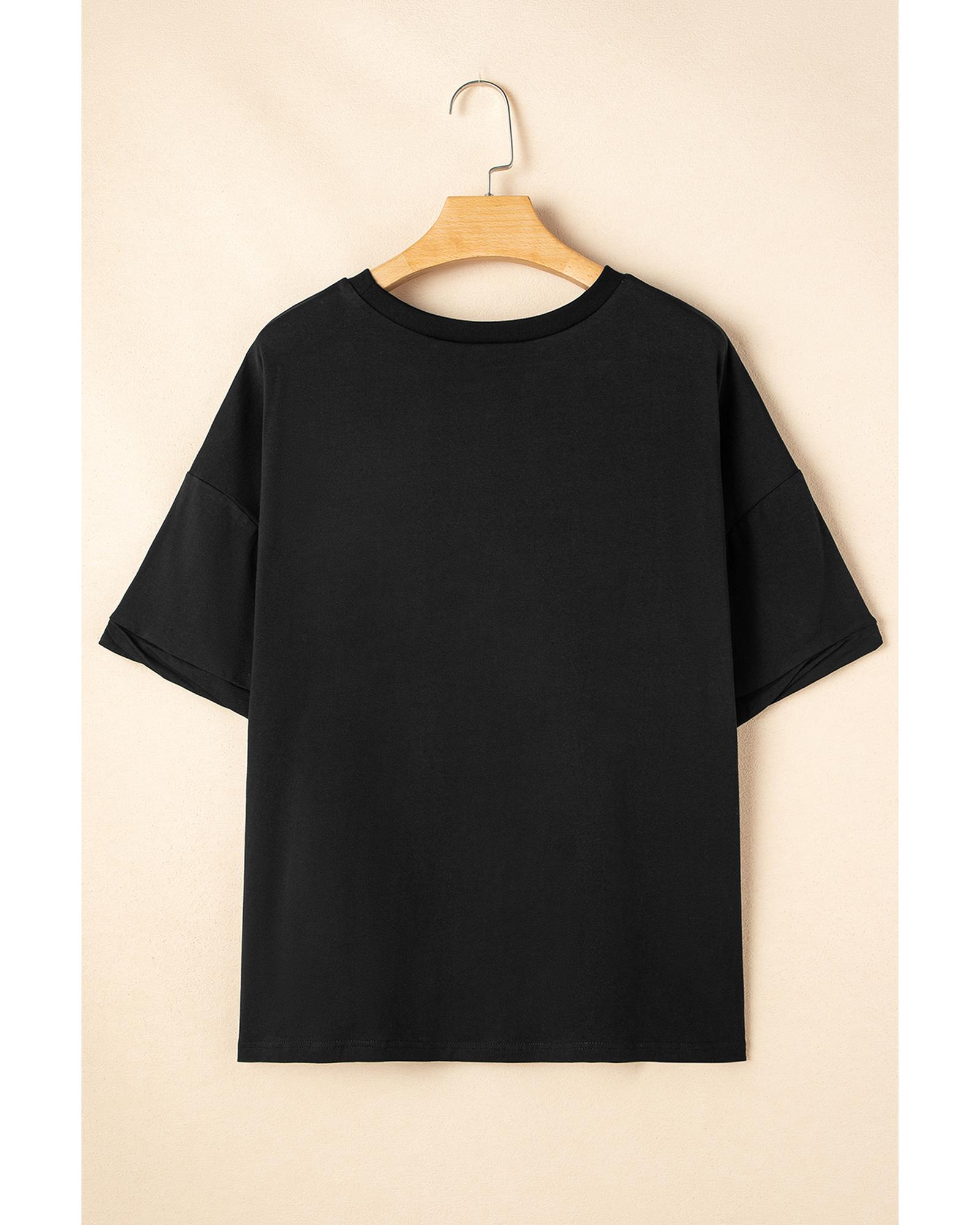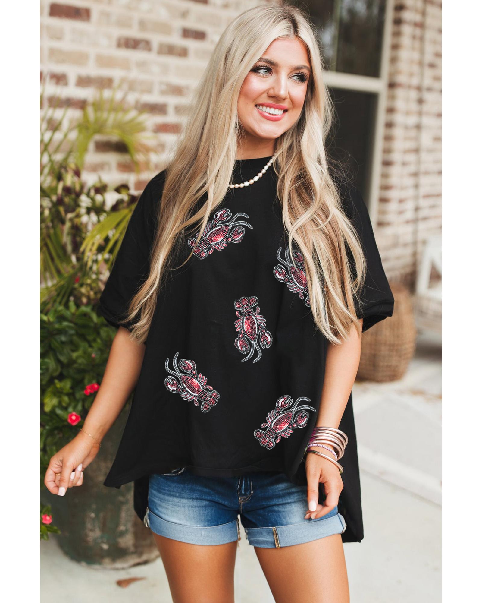 - Black Sequin Crawfish Graphic High Low Loose T