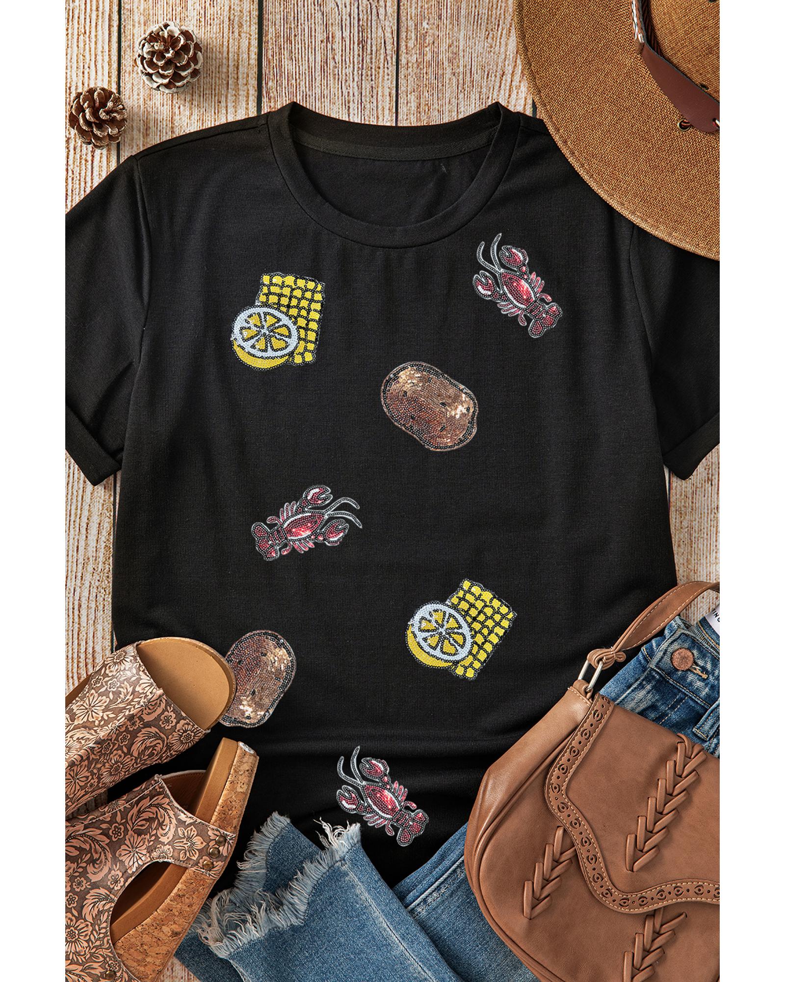 Black Sequin Crawfish Potato Lemon Corn Graphic Crewneck T Shirt – L
