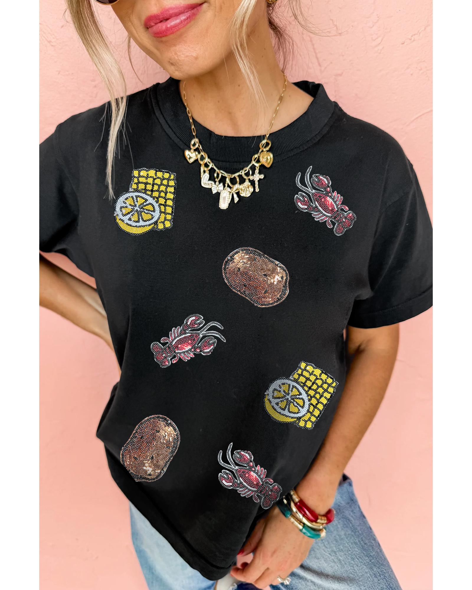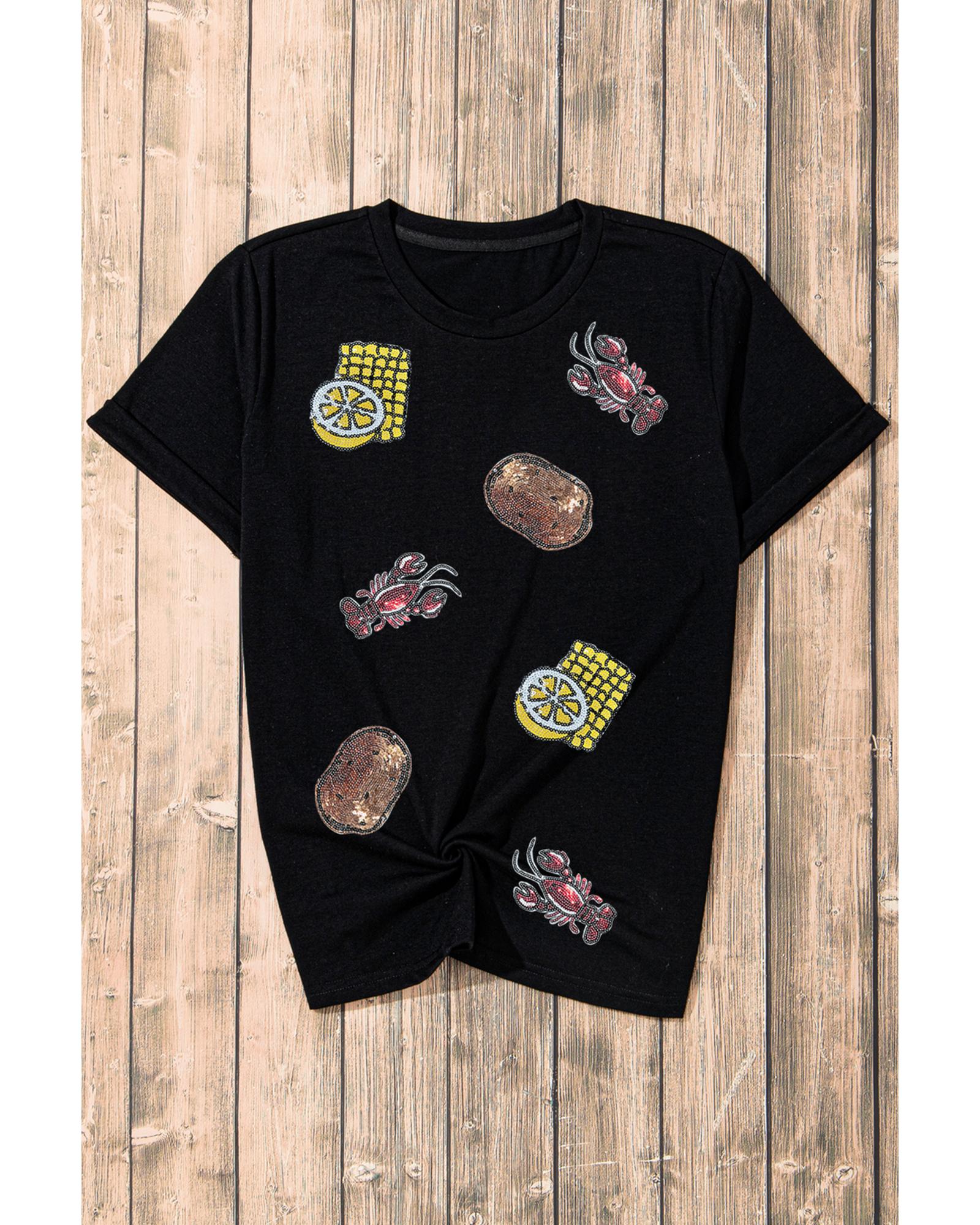 Black Sequin Crawfish Potato Lemon Corn Graphic Crewneck T Shirt – M