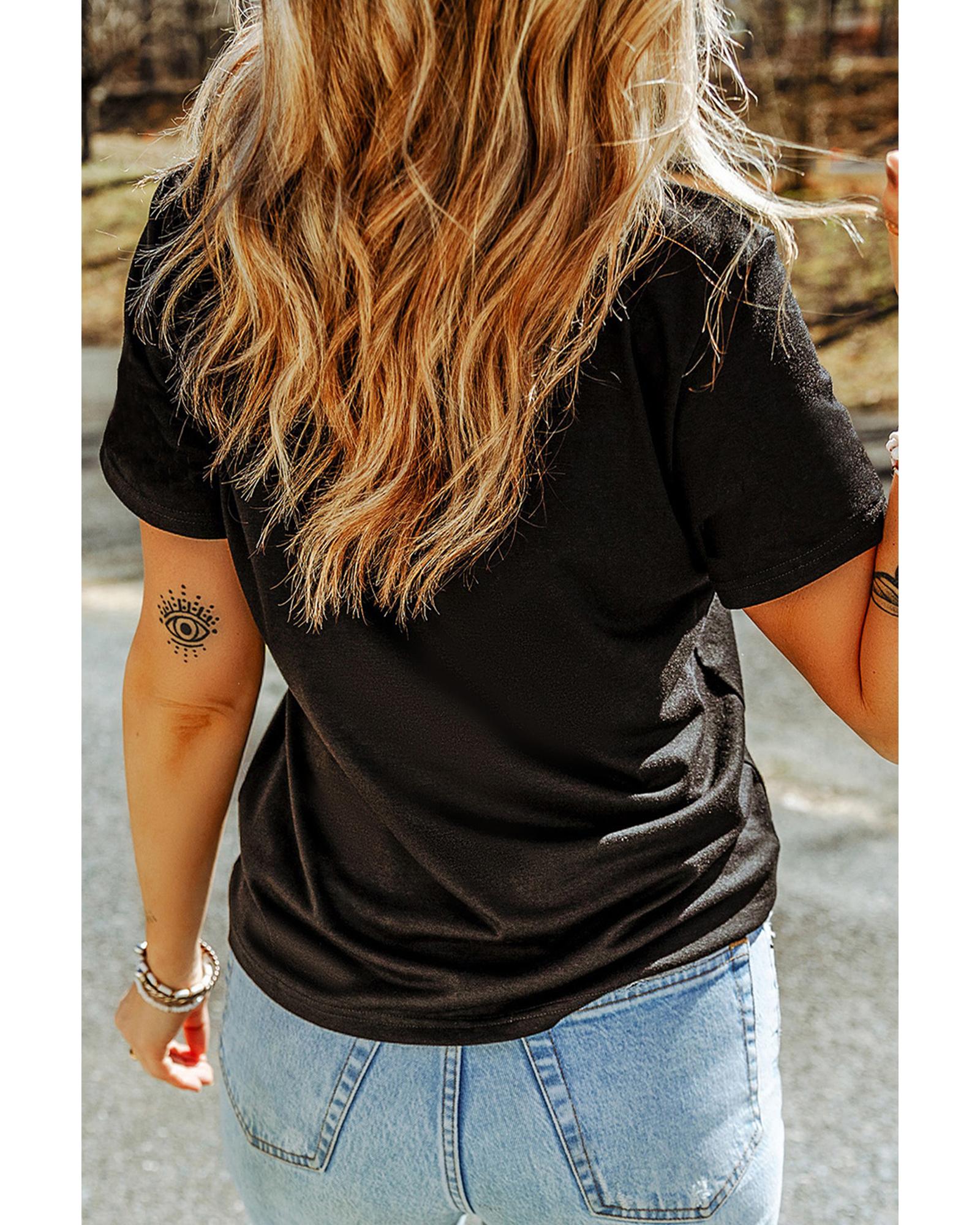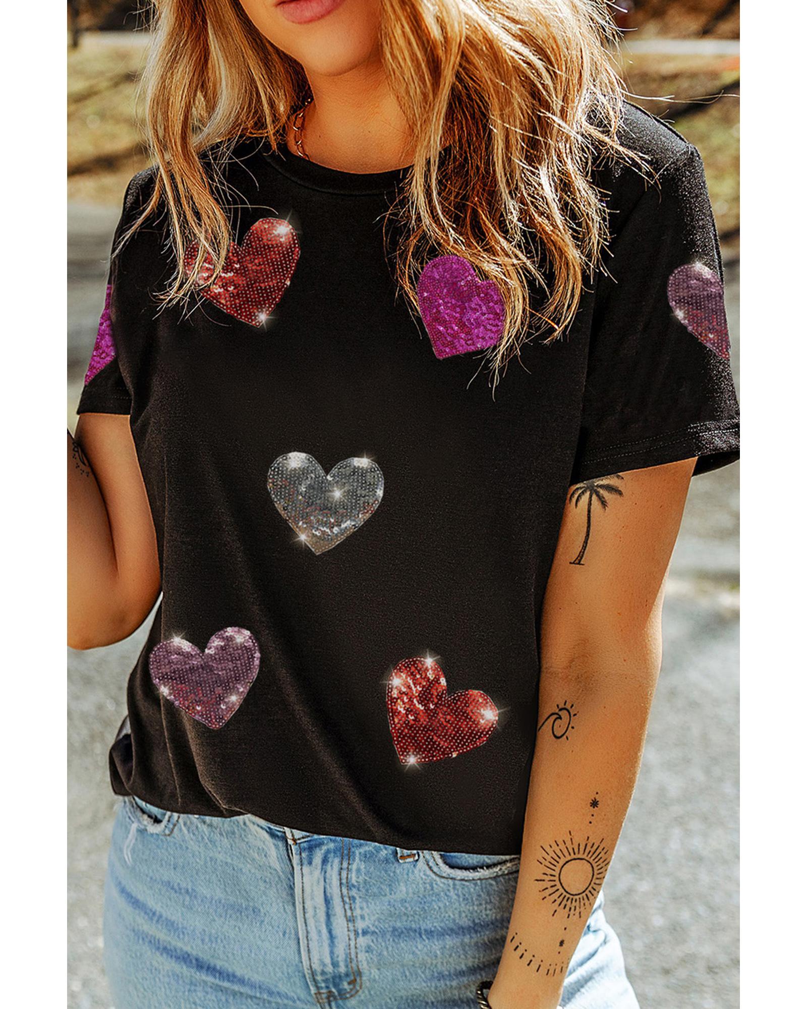 • Black Sequin Heart Patched Pattern Crewneck Valentines Tee